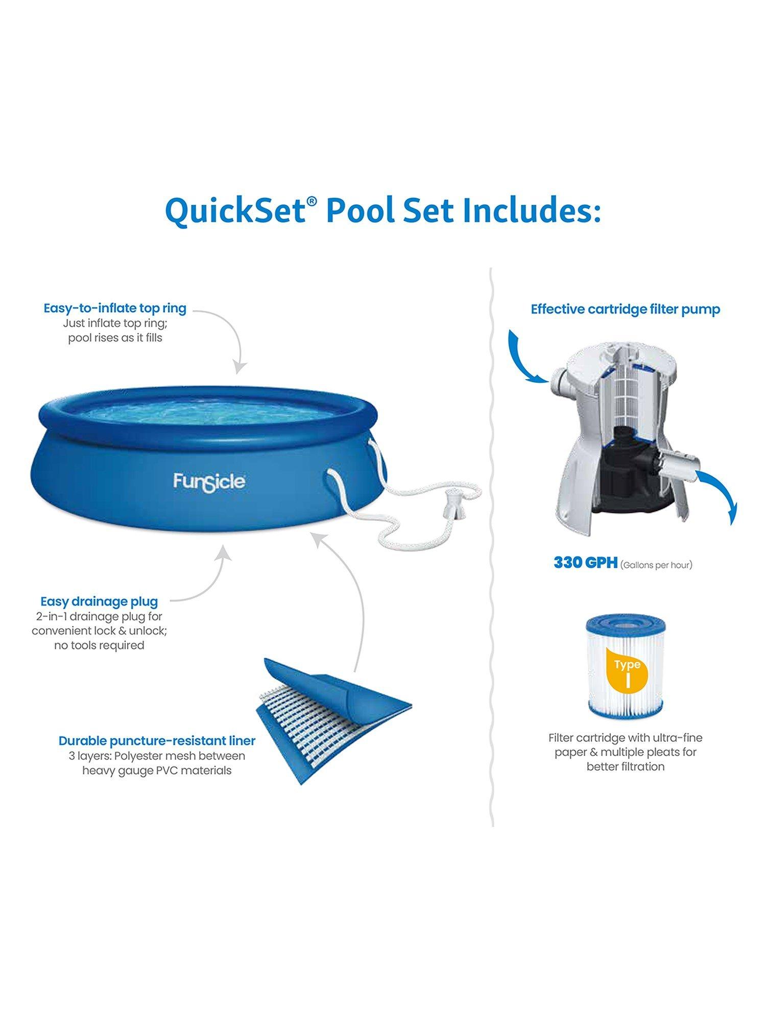 Set it up quickly by simply inflating the top ring and watching the pool rise as it fills with water. Made with durable, puncture-resistant materials, this above ground pool will last longer. It also comes with a powerful RX330 Cartridge Filter Pump, which is easy to use and will keep your water clean and fresh throughout the season. An affordable solution to the summer heat, the Funsicle 12ft QuickSet Pool is perfect for any backyard or garden.