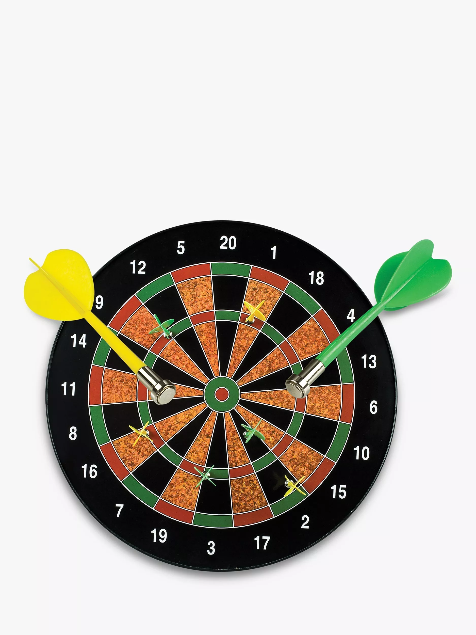 The solid board features two sets of coloured magnetic darts with no sharp points. The dartboard can be mounted on a wall or propped up on a chair. Instructions are included.