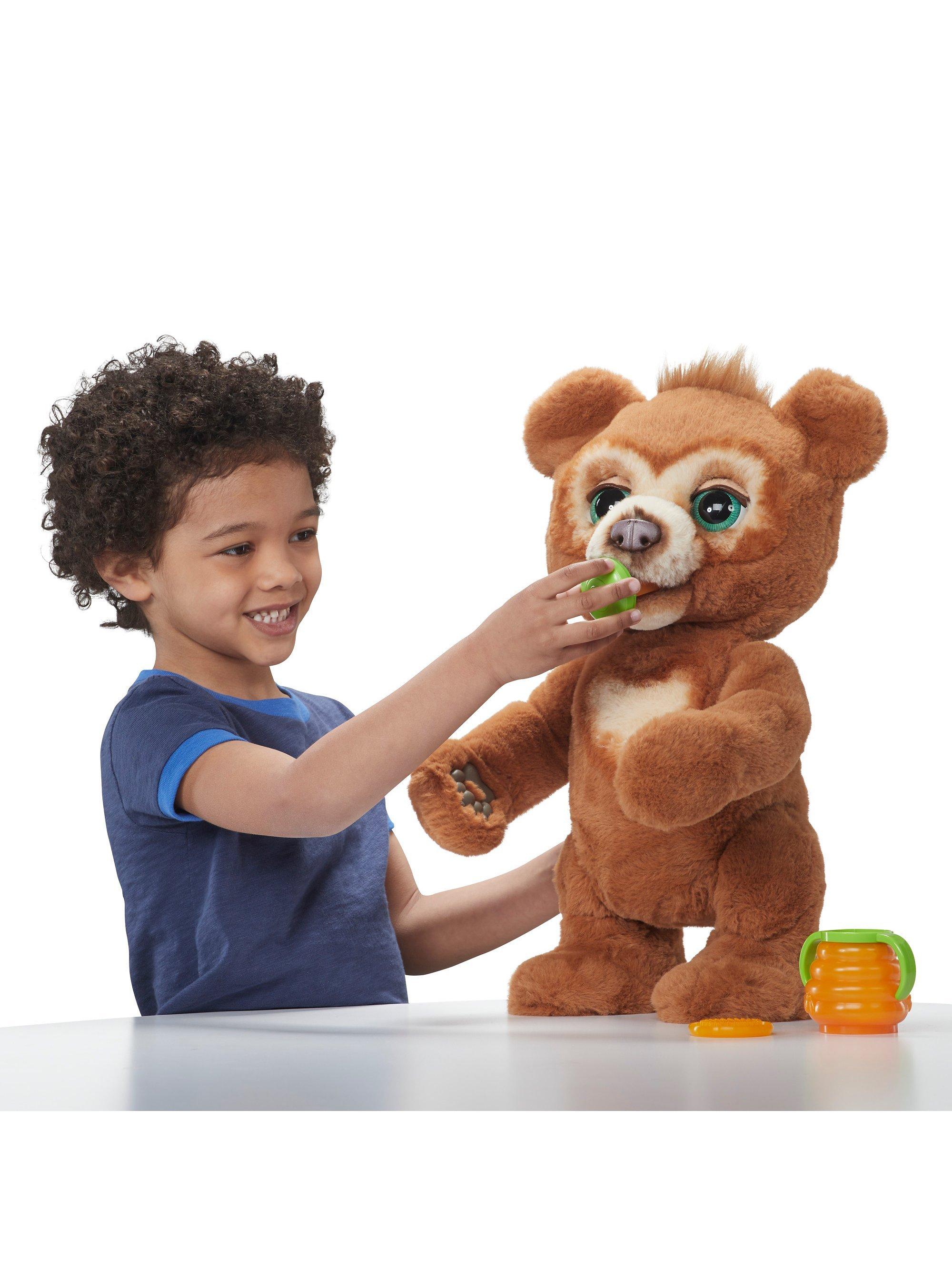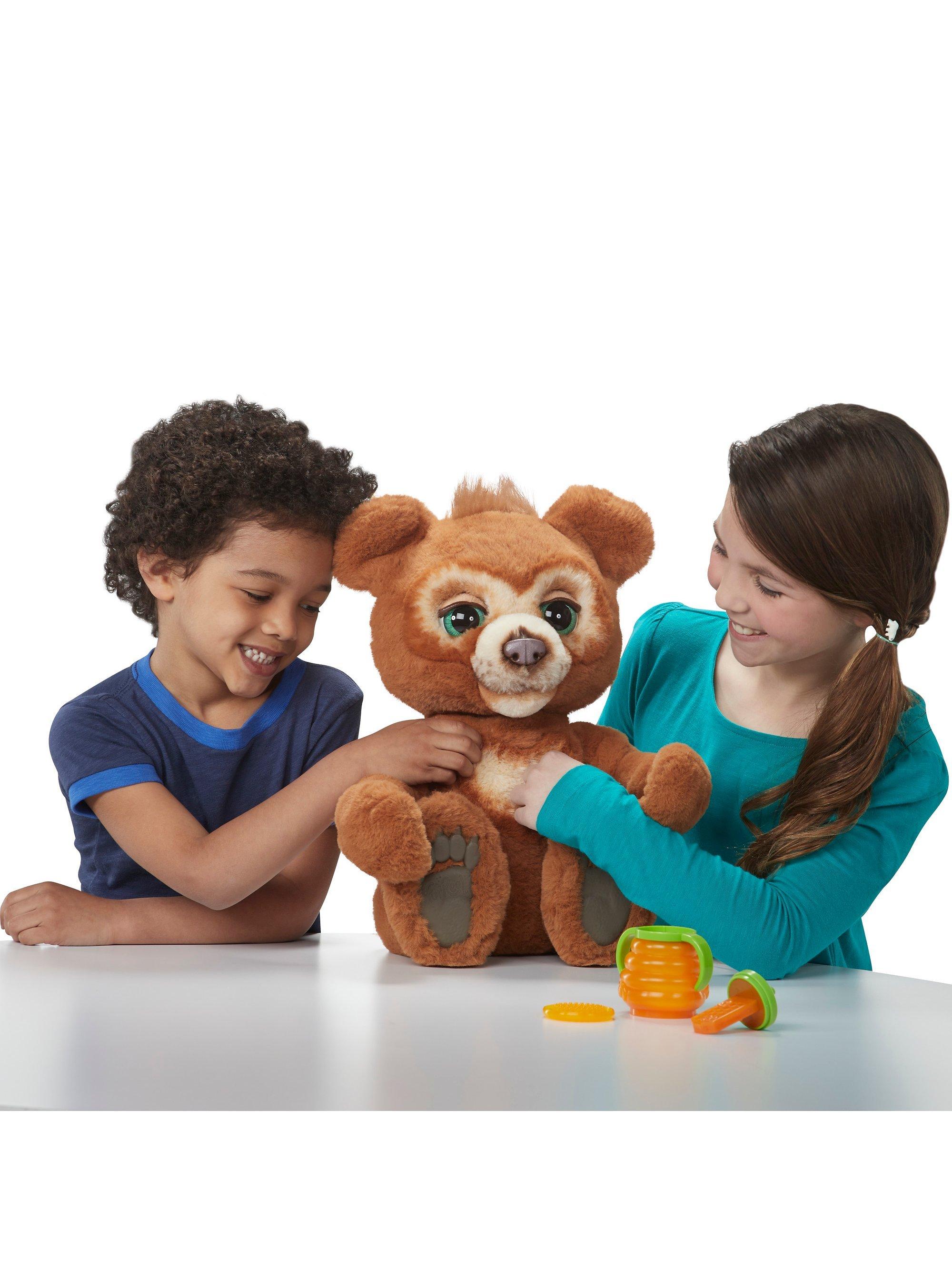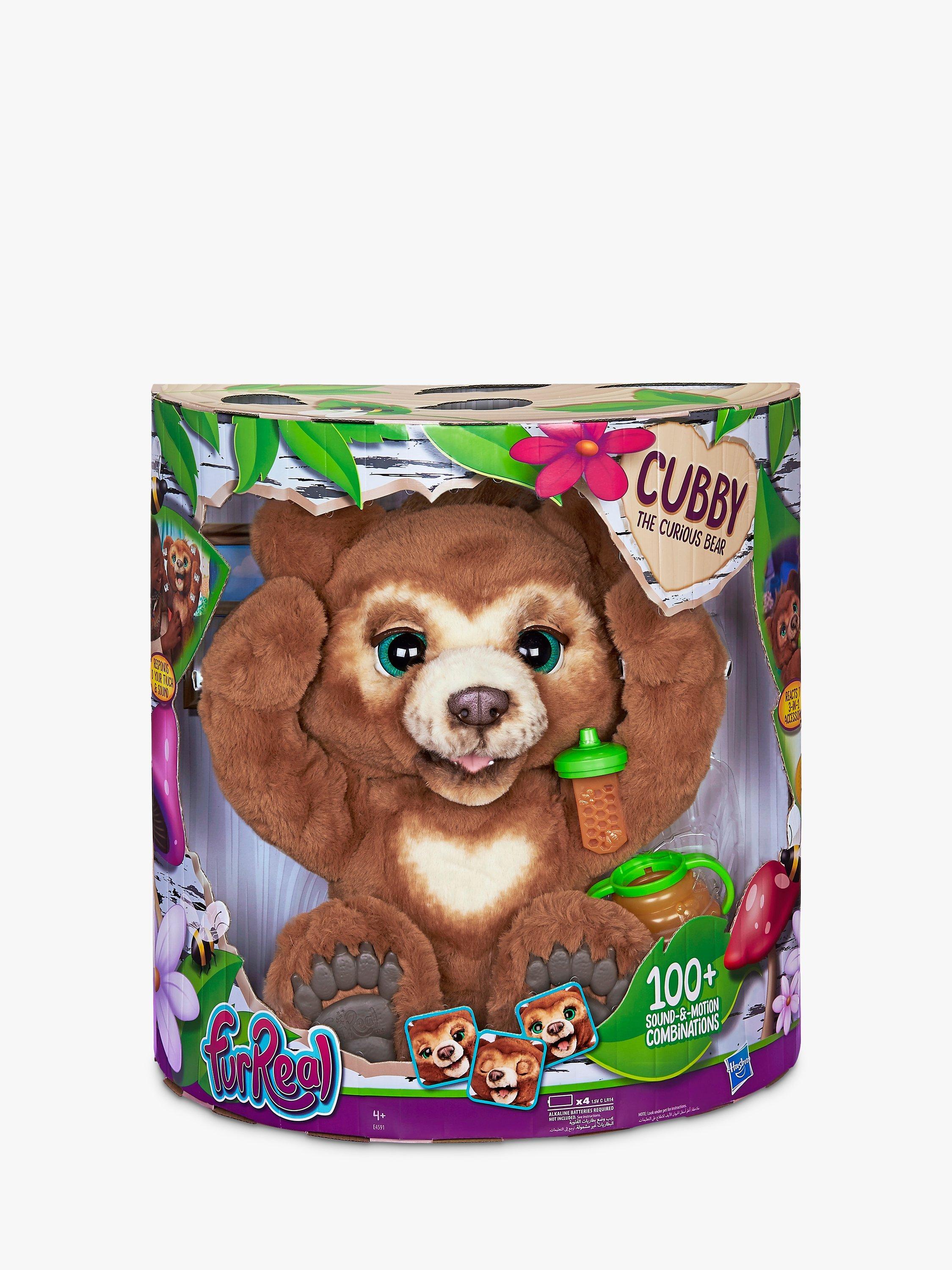 FurReal Friends Cubby the Curious Bear is the perfect pet. This delightfully curious, expressive bear cub loves to play with you during the day. Cubby the Curious Bear loves to play peek-a-boo, and even dance from time to time. Let’s not forget snack time! Feed him his bottle or treat and he’ll make eating sounds. He’s a chatty little bear, too – he babbles back when he’s spoken to.