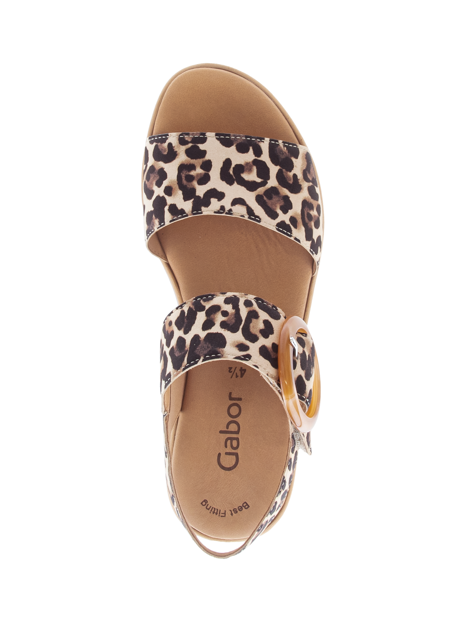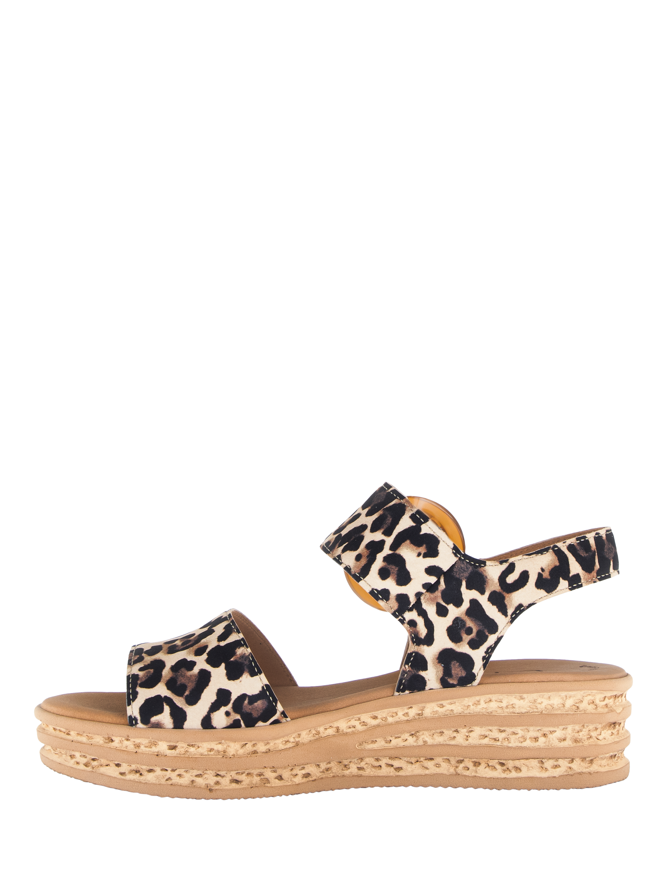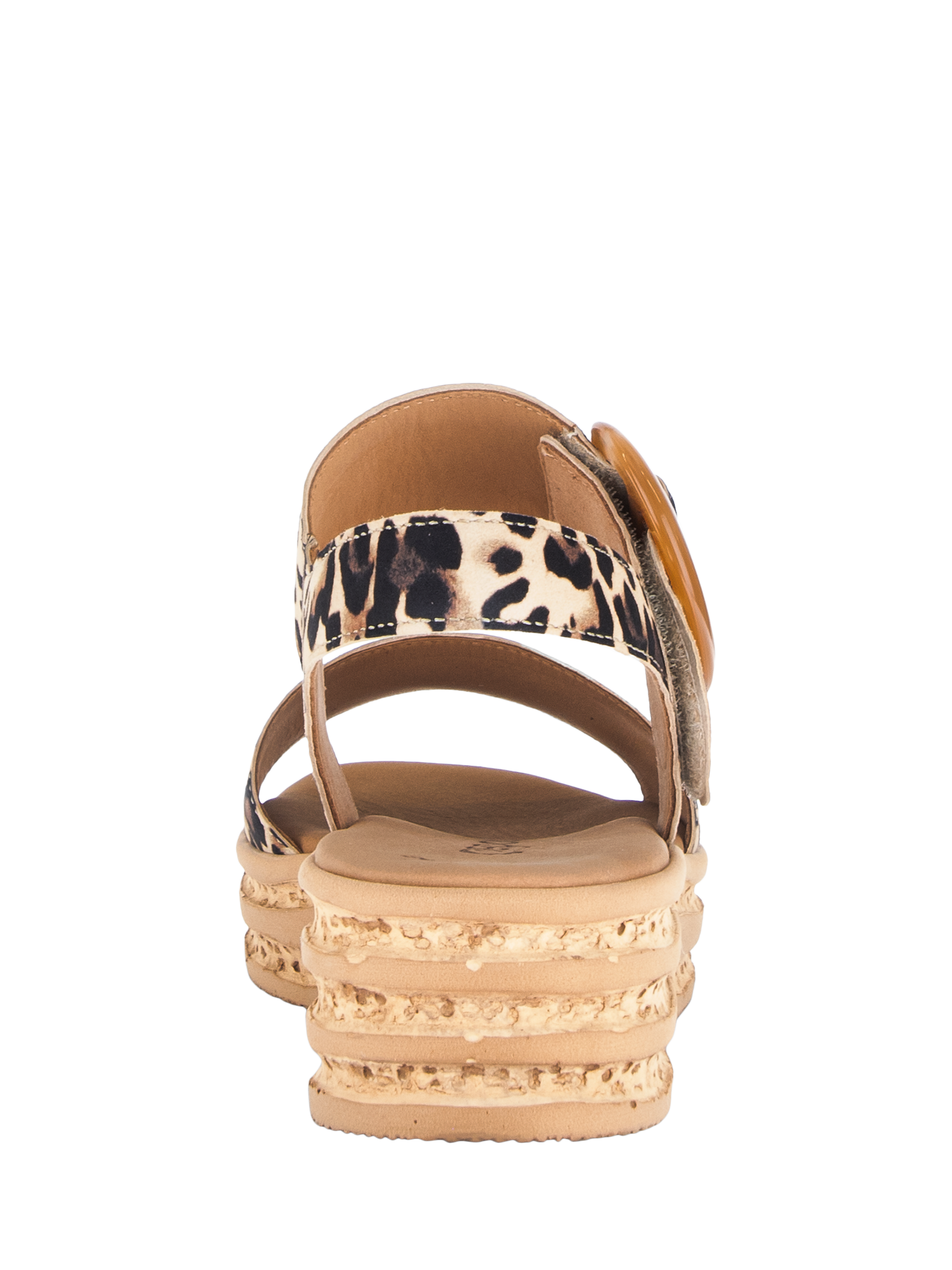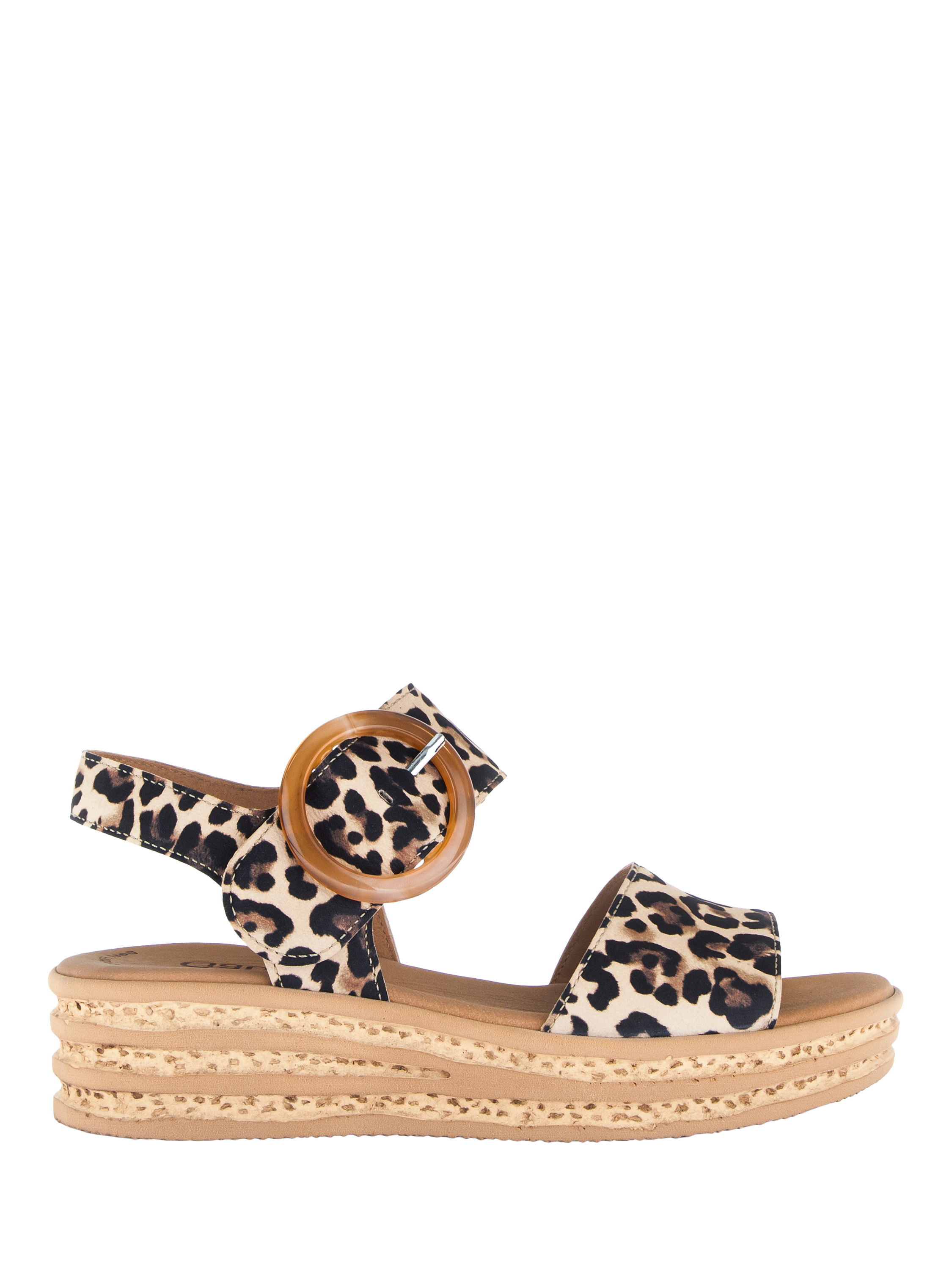 A slingback platform leopard print sandal with a large buckle detail on a cork heel.