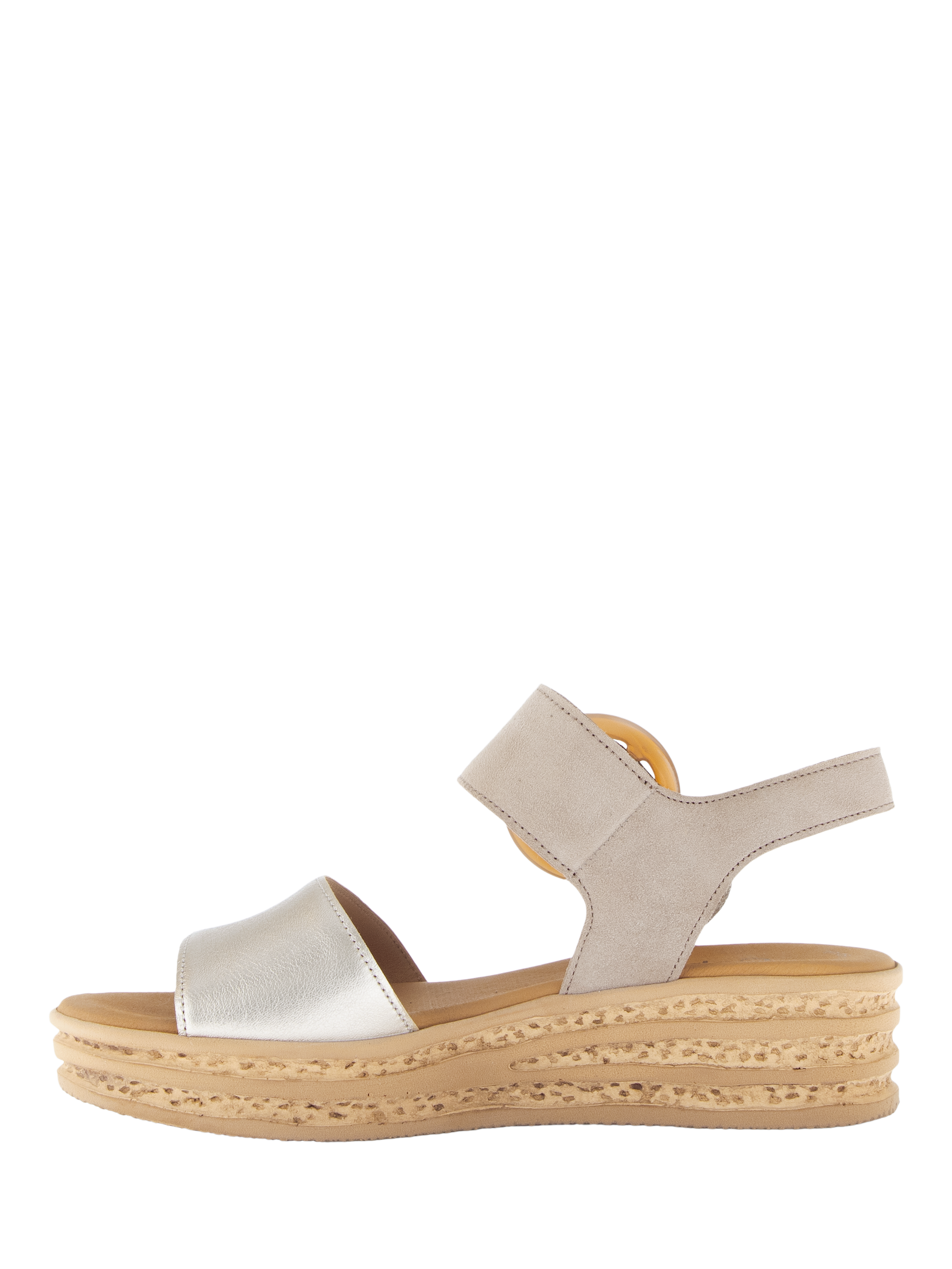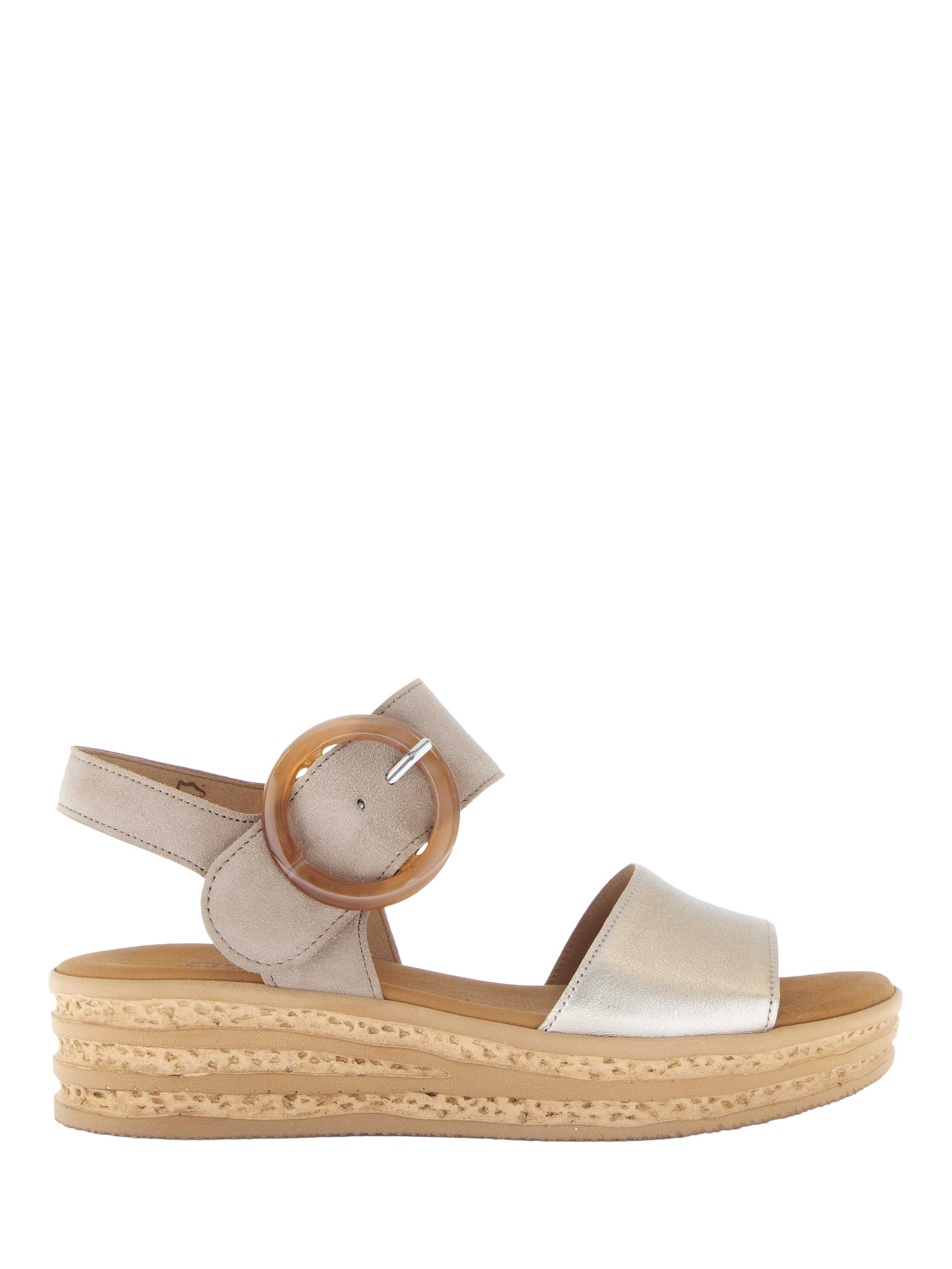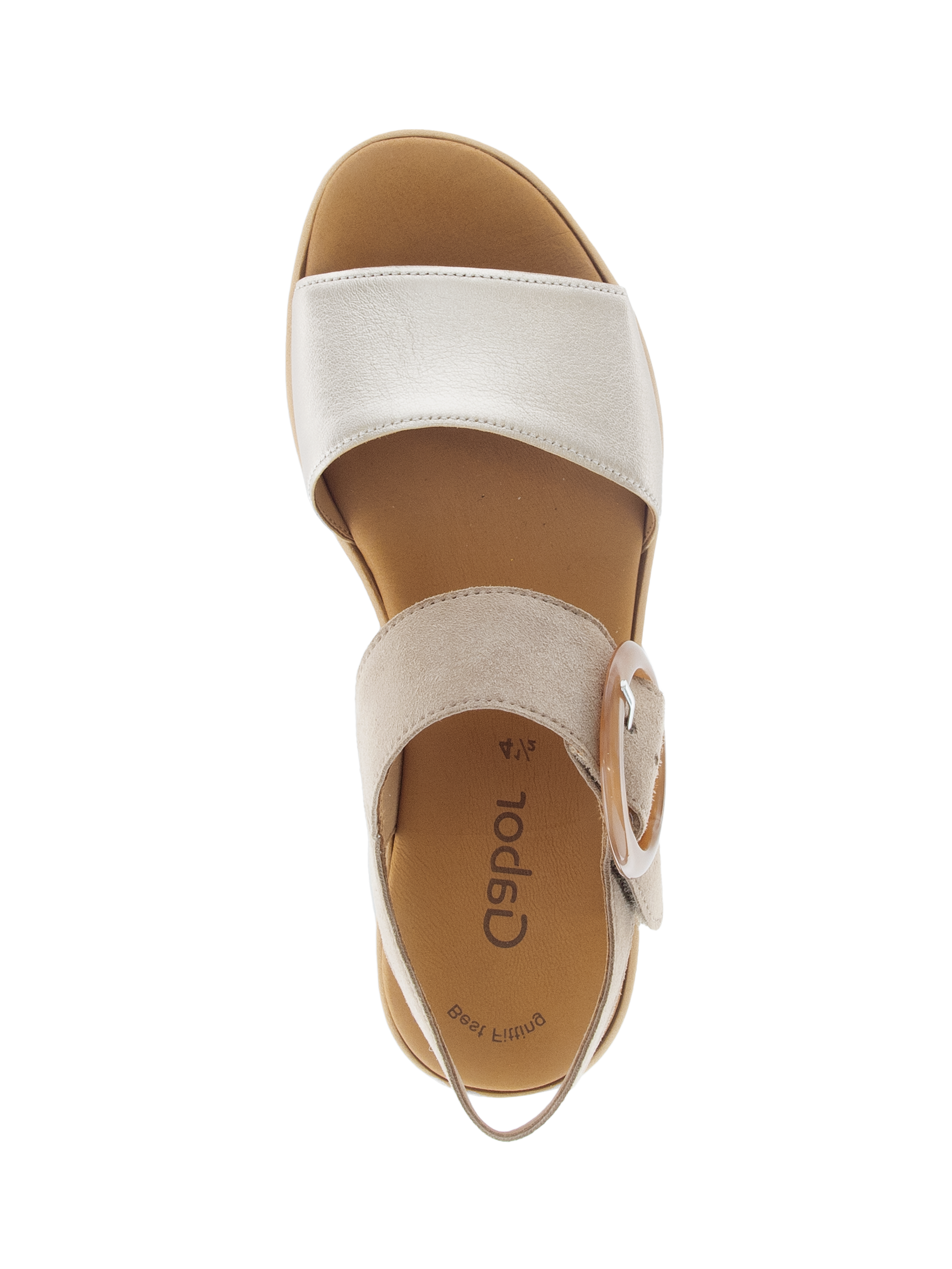 A fashion sandal with rip tape fastening hidden behind a large decorative buckle detail encorporating Gabor's Best Fitting technology.