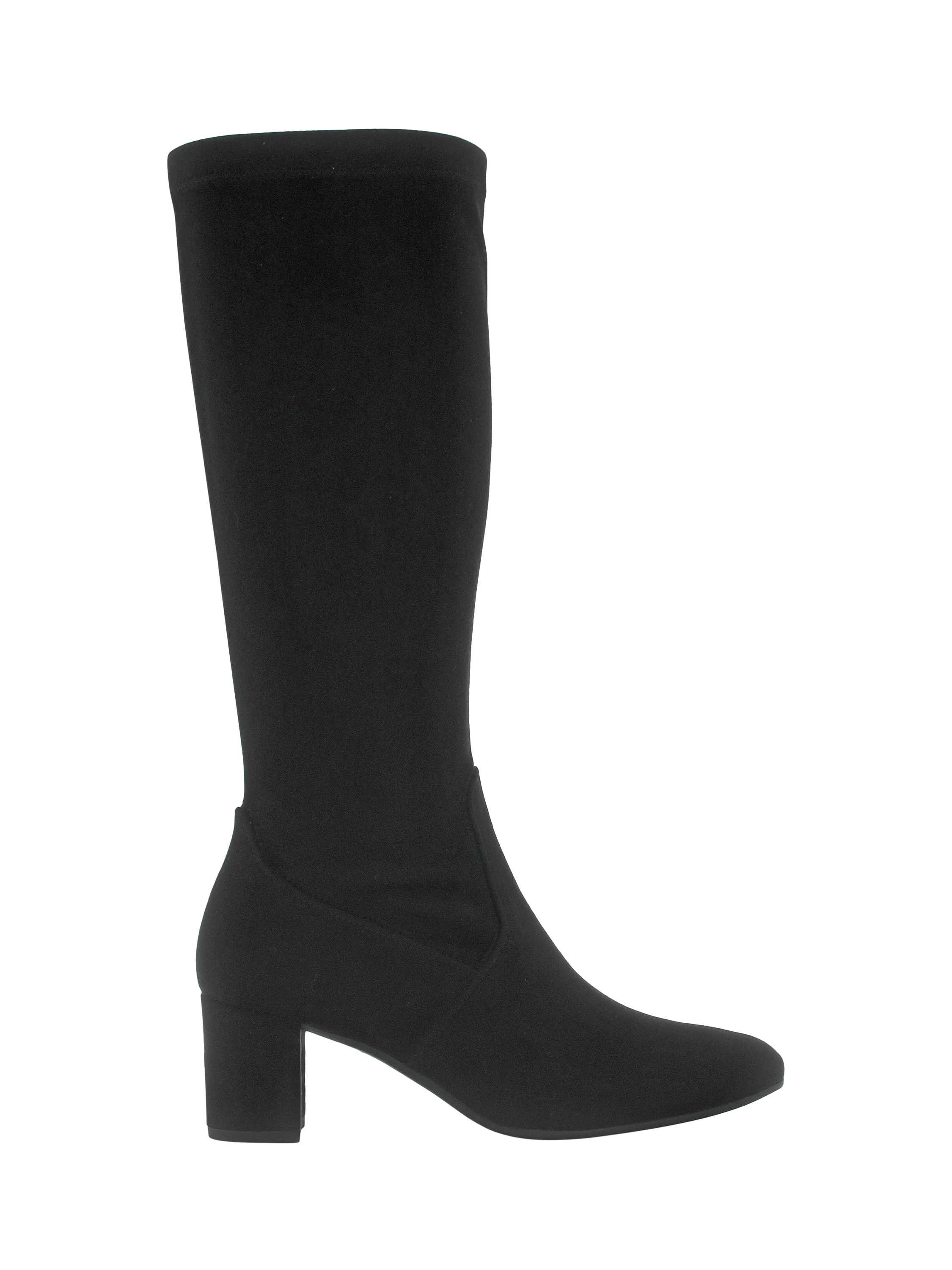A wide-fit medium stretch elegant long boot with a covered block heel and side zip fastening.