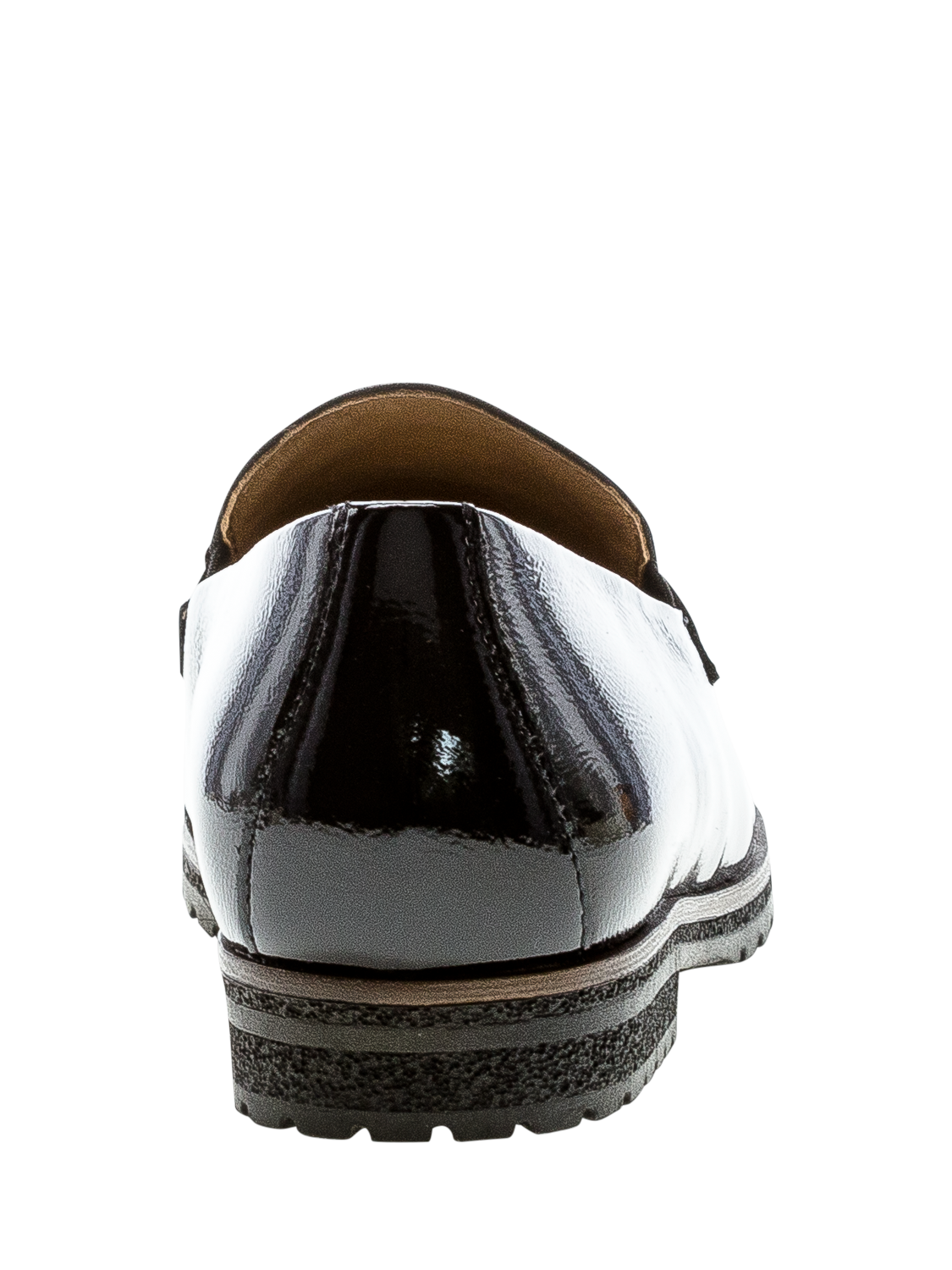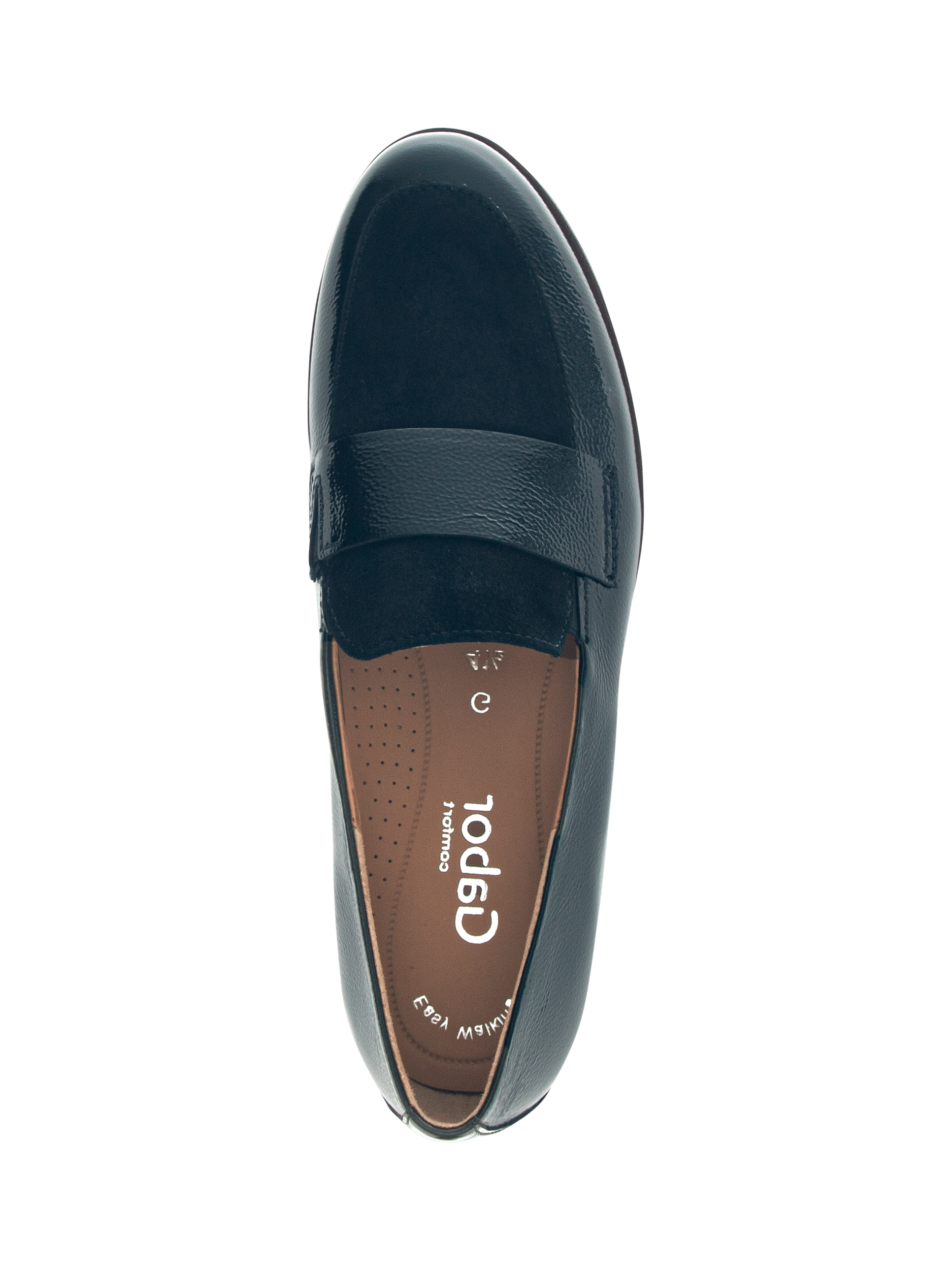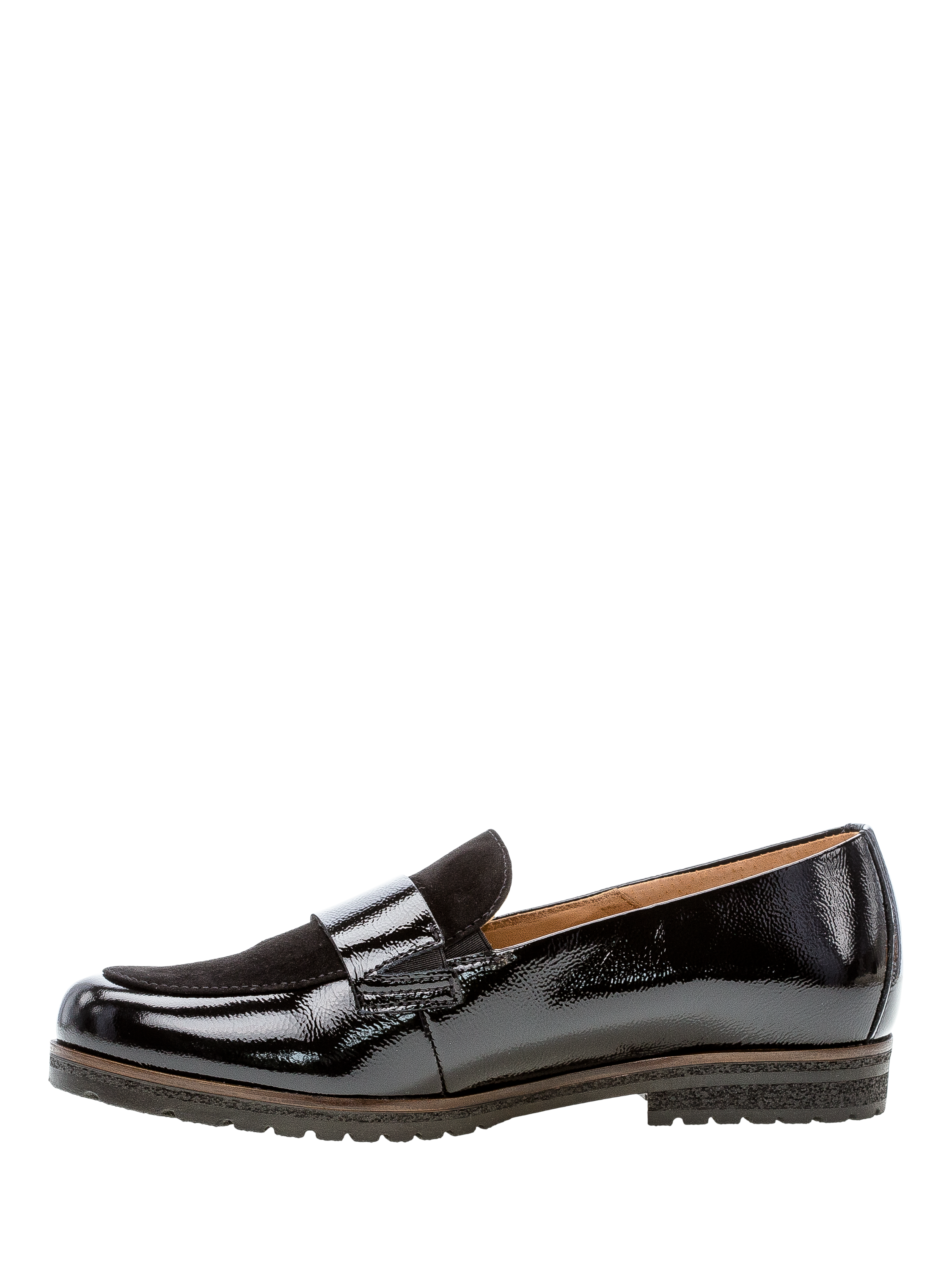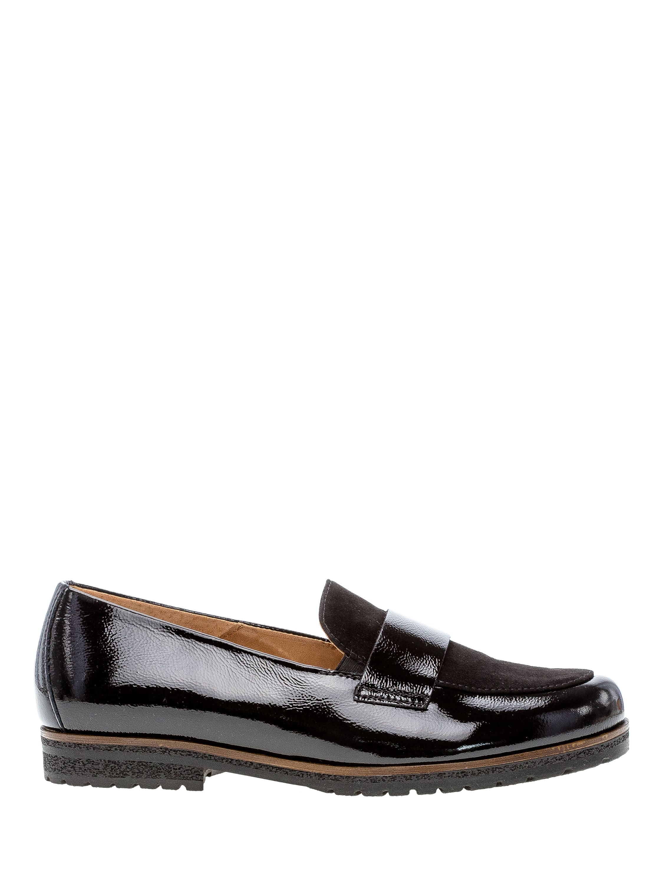 Making a casual style statement, these wide fit slip-on loafers from Gabor have been fashioned from a crinkle patent leather and feature a suede front with a small elastic gusset.