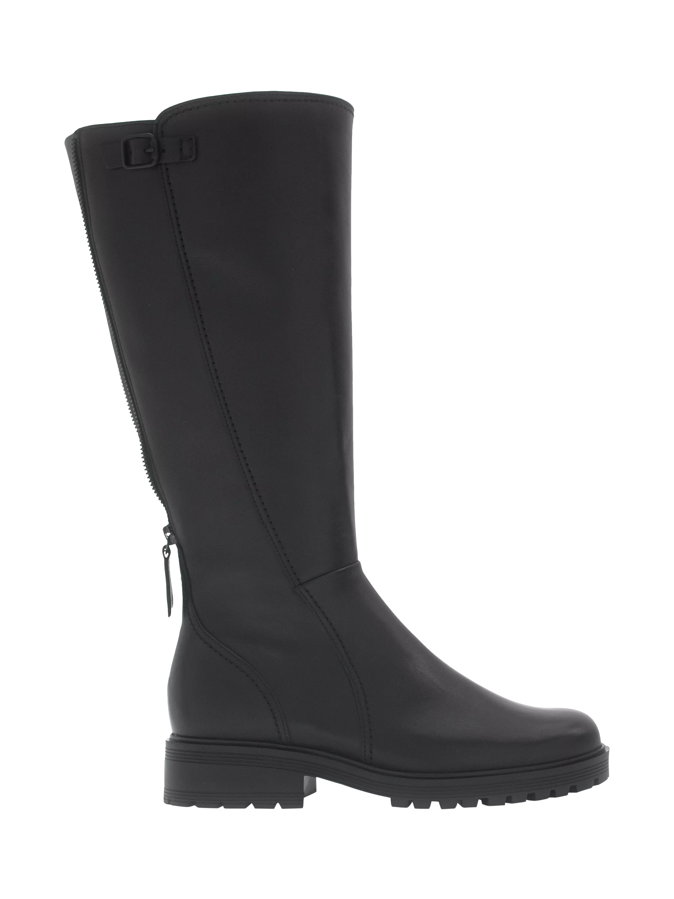 A wide-fit boot with decorative side buckle detailing and featuring an adjustable back zip to adjust the calf fitting, and a recycled footbed.