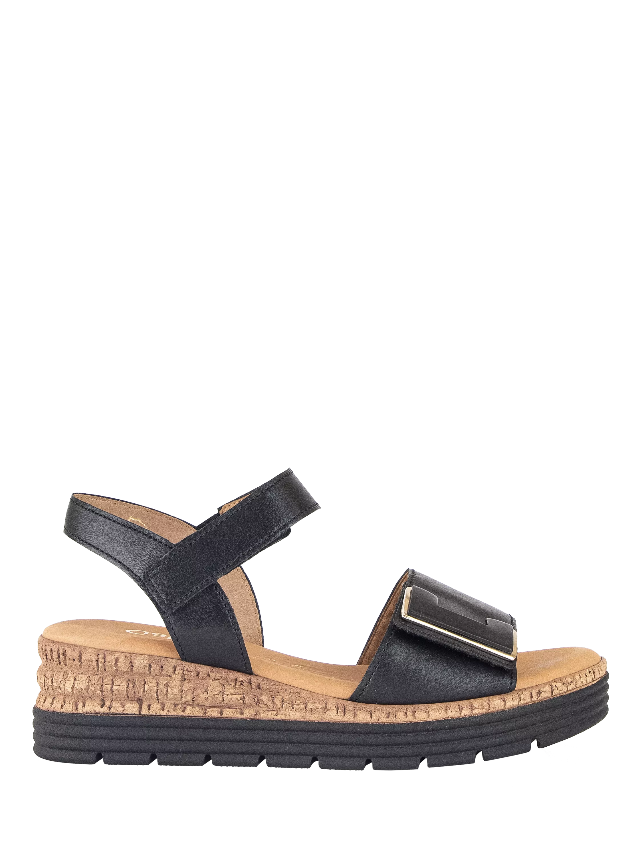 A wide-fit wedge sandal with cork heel detail and a large buckle detail across the foot and rip tape fastening.