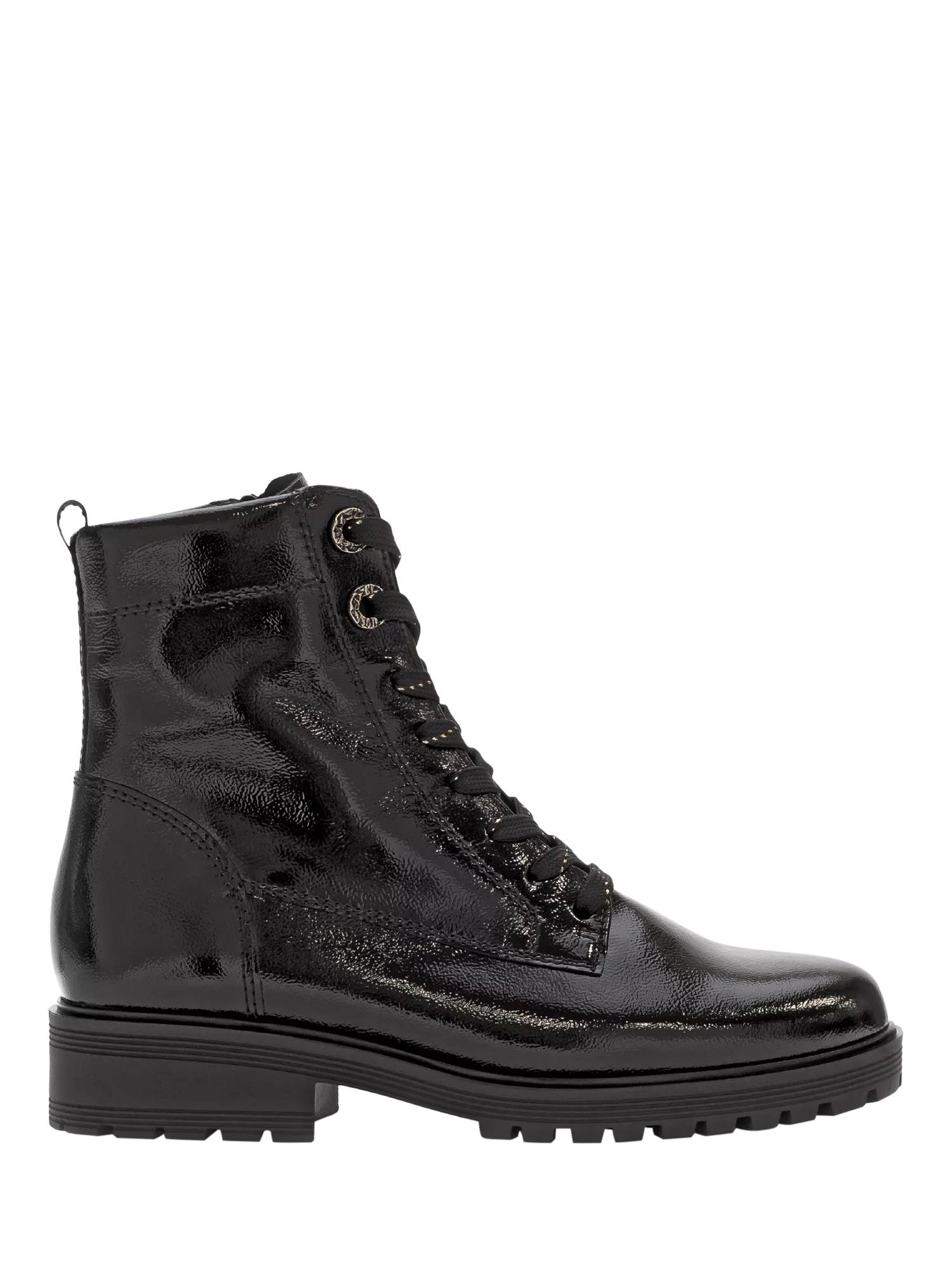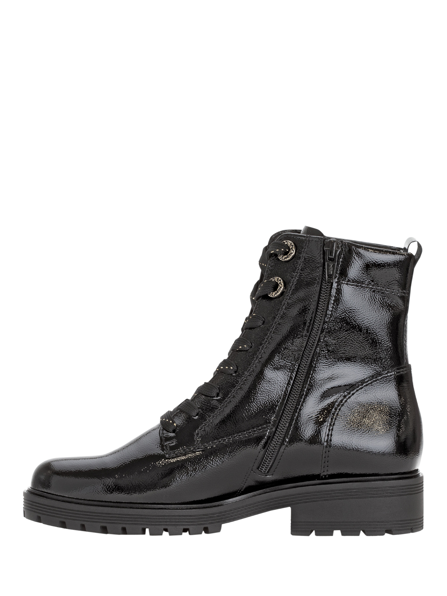 Stomping their way to your favourites, this pair of wide fit biker boots by Gabor is made with patent leather uppers. Resting on a block heel, they are rounded at the toe for a fuss-free finish.