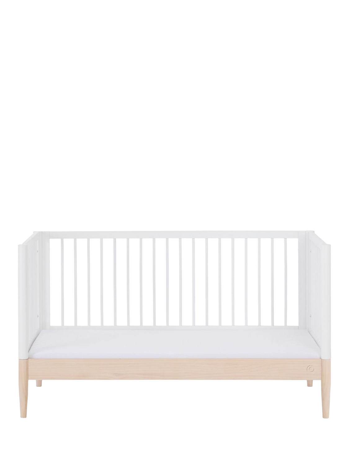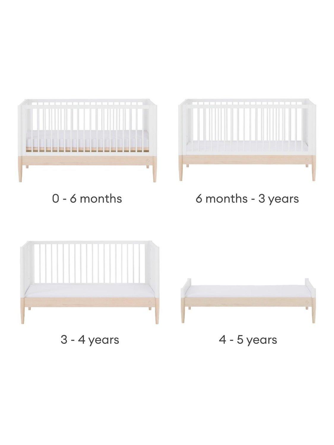 It has three adjustable mattress heights and converts easily from cot to toddler bed and then to a first bed, making it a practical long-term choice for both small and spacious nurseries.