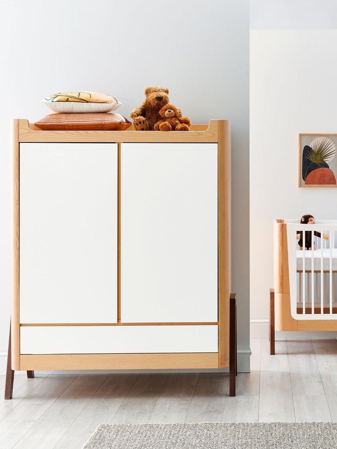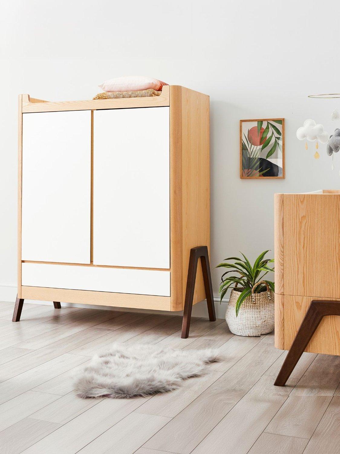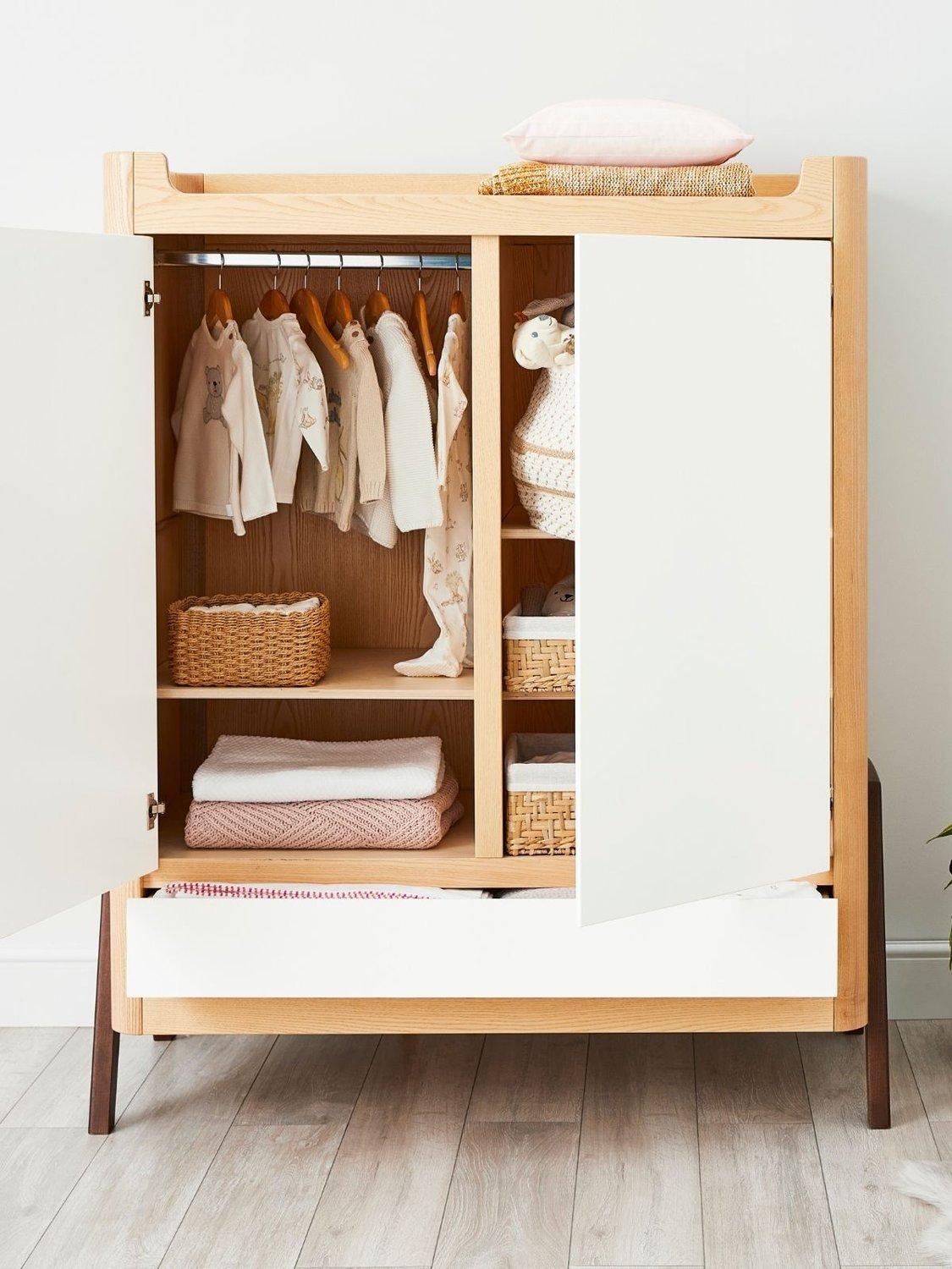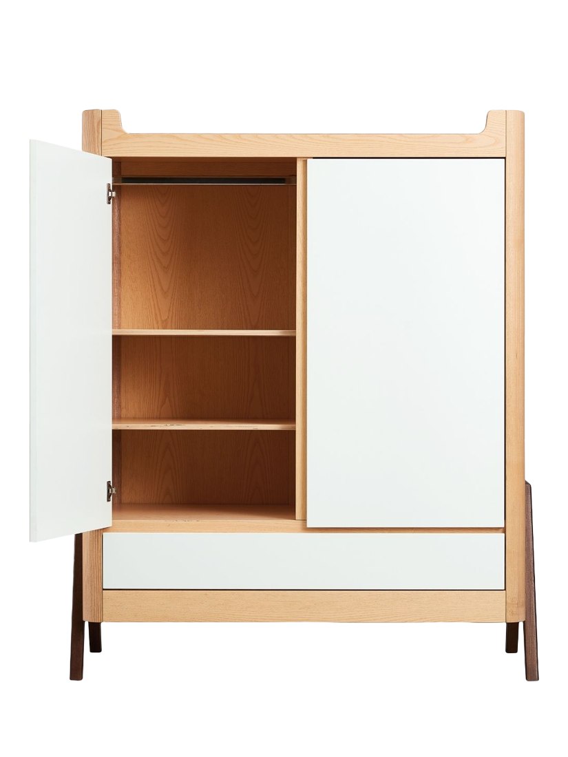 With stunning Natural Ash A-frame accents with a generous 129.4 x 64.4cm size that makes it suitable for storing all your baby's needs and for use later on in a teen or adult room. Double doors open to reveal hanging rails on one or both sides (2 x metal hanging rails included). The wooden shelves can be located on both sides (4 shelves included) and height adjusted to suit your needs as your child grows. Underneath, a smooth action drawer provides ample storage space for bulky clothing or bedding.