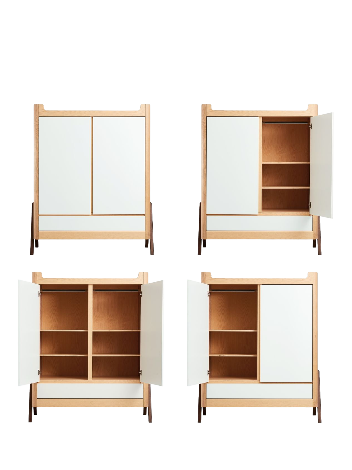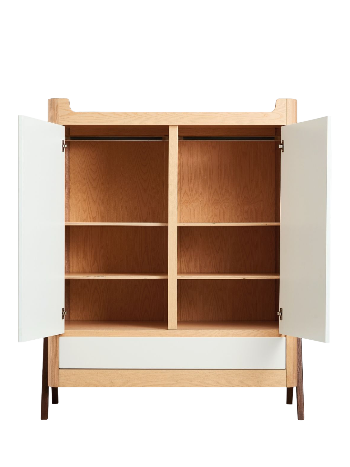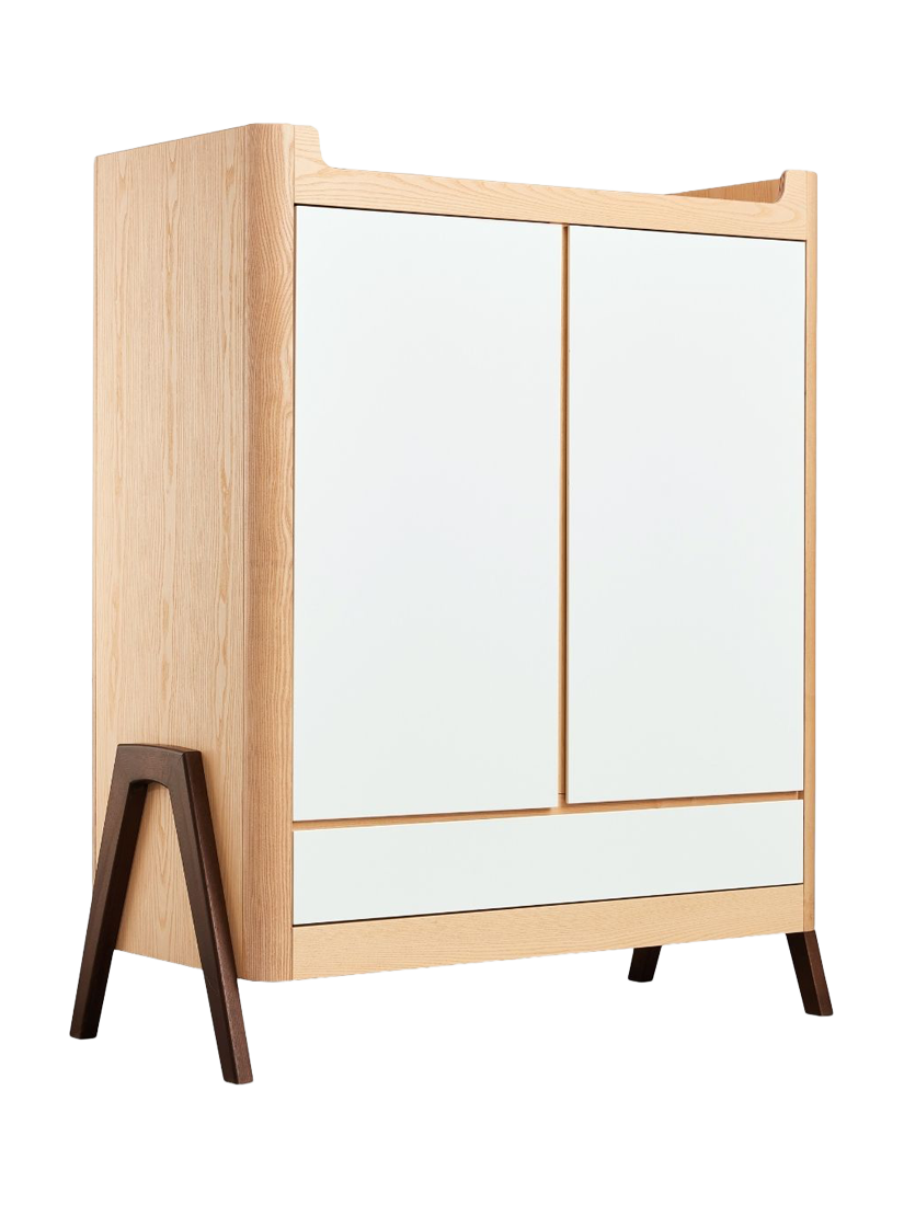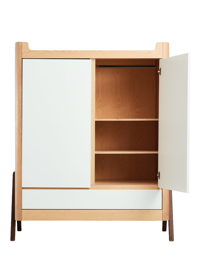With stunning Natural Ash A-frame accents with a generous 129.4 x 64.4cm size that makes it suitable for storing all your baby's needs and for use later on in a teen or adult room. Double doors open to reveal hanging rails on one or both sides (2 x metal hanging rails included). The wooden shelves can be located on both sides (4 shelves included) and height adjusted to suit your needs as your child grows. Underneath, a smooth action drawer provides ample storage space for bulky clothing or bedding.