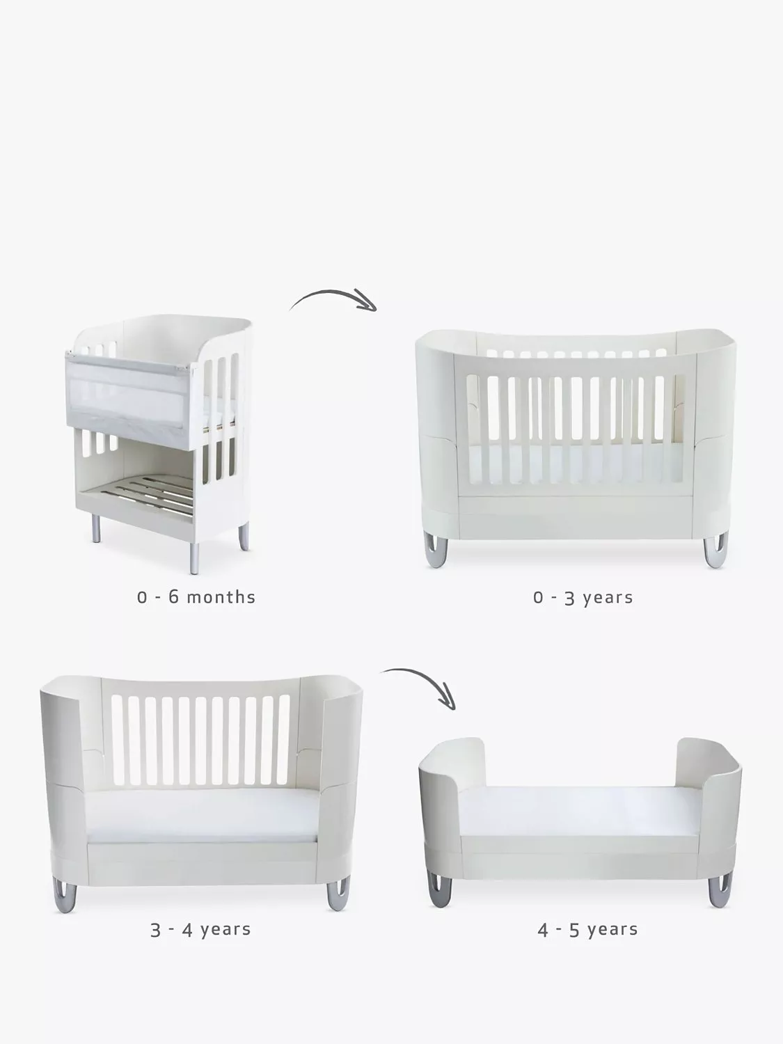 - Stage 1 - Co-sleeping Crib suitable for babies 0-6 months. This package comes with the Co-Sleeping Adaptor (including co-sleeper mattress) that allows you to use it as a beside crib for the first six months of baby's life. In this stage the crib has 6 possible mattress height adjustments from 48 cm to 66cm (max) to ensure perfect alignment with your bed.