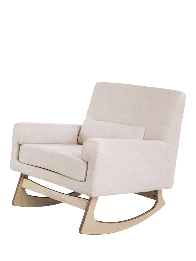 Ergonomically designed to provide optimum comfort as a nursing/feeding chair, it has an extra lumbar cushion and padded armrests and is generously sized to accommodate a parent and child for bedtime stories as they grow. The softly contoured legs are made from laminated birch-wood veneer using a special technique during the manufacturing process to give extra strength and avoid splintering for a smooth and soothing rocking motion.