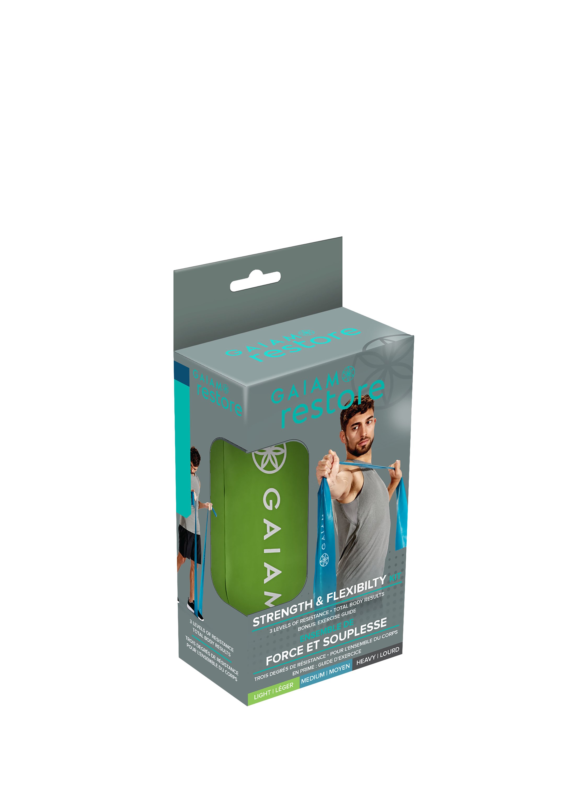 The bands all differ in resistance levels, offering variety and challenge to your workout. Produced exclusively by Gaiam, the kit also comes with a detailed exercise guide.