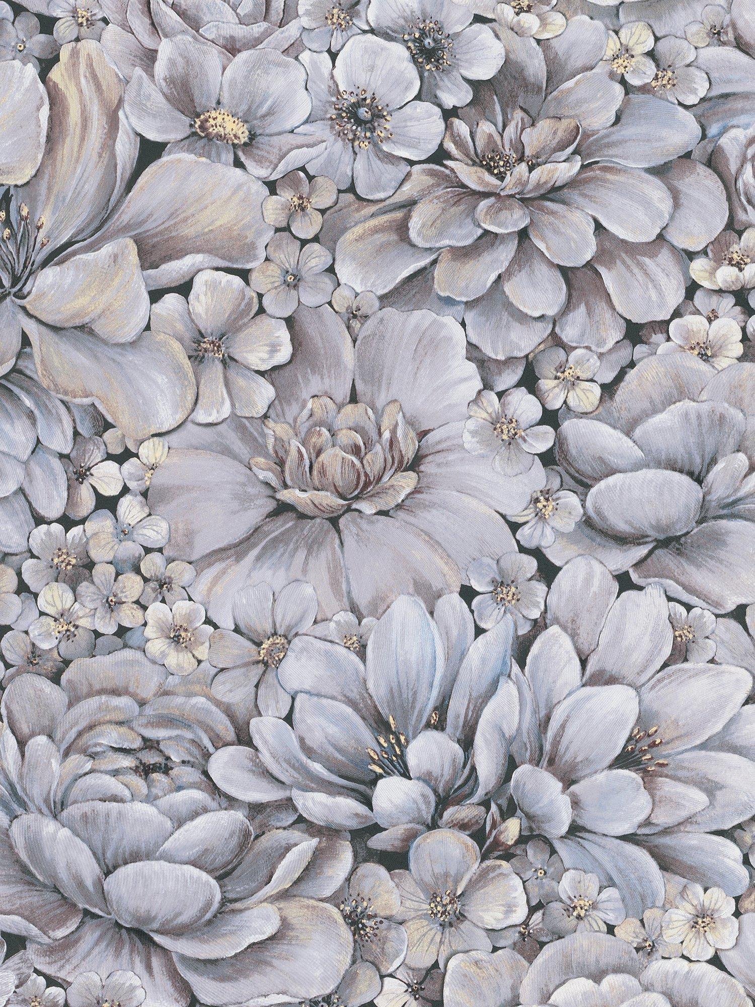 A stylish floral wallpaper with a wealth of data three-dimensional flowers erupt in a layered feast of large peonies, apple blossoms, orchids and roses.