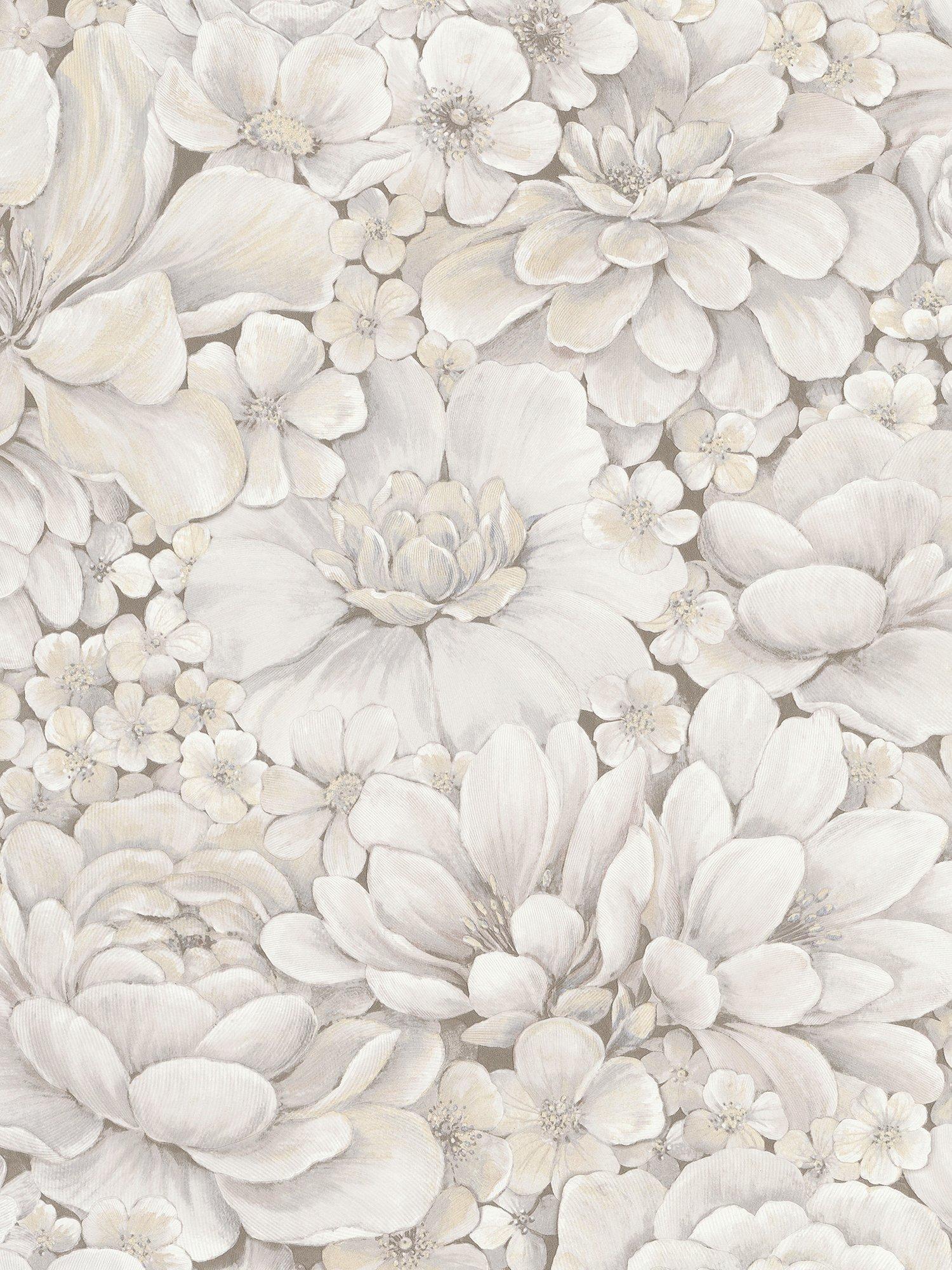 A stylish floral wallpaper with a wealth of data three-dimensional flowers erupt in a layered feast of large peonies, apple blossoms, orchids and roses.