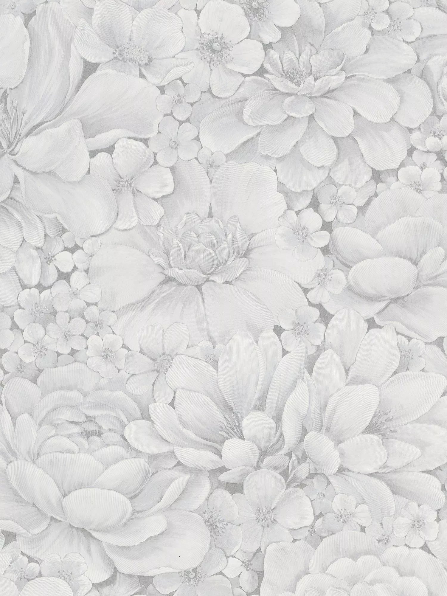 A stylish floral wallpaper with a wealth of data three-dimensional flowers erupt in a layered feast of large peonies, apple blossoms, orchids and roses.