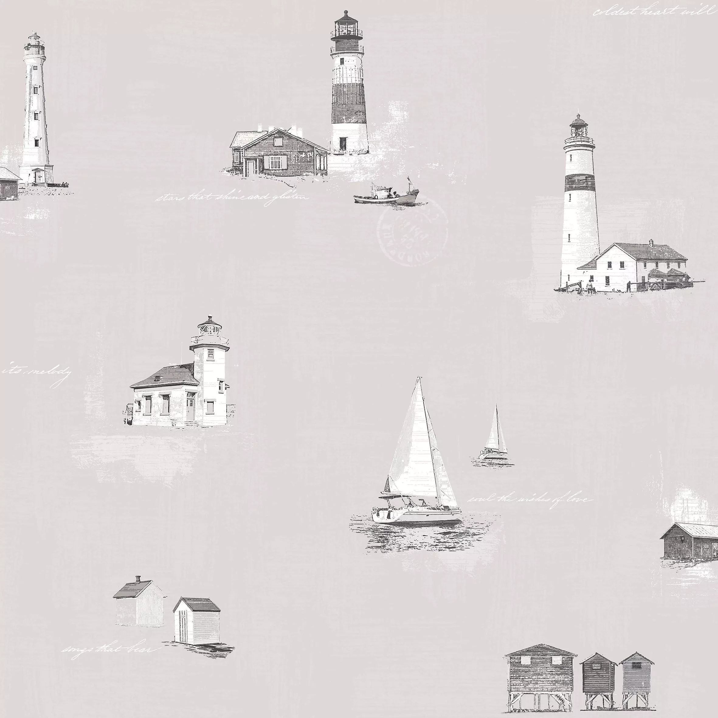 Washable wallpaper with a print of lighthouses, yachts and beach huts.