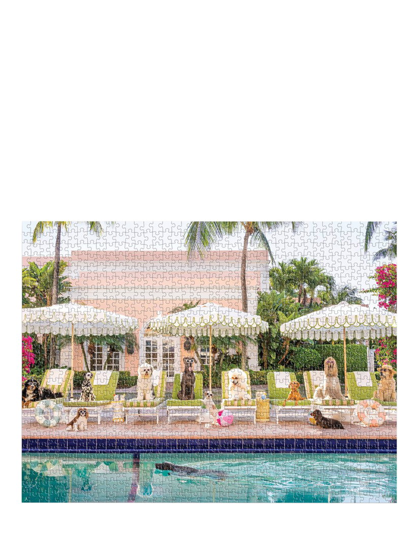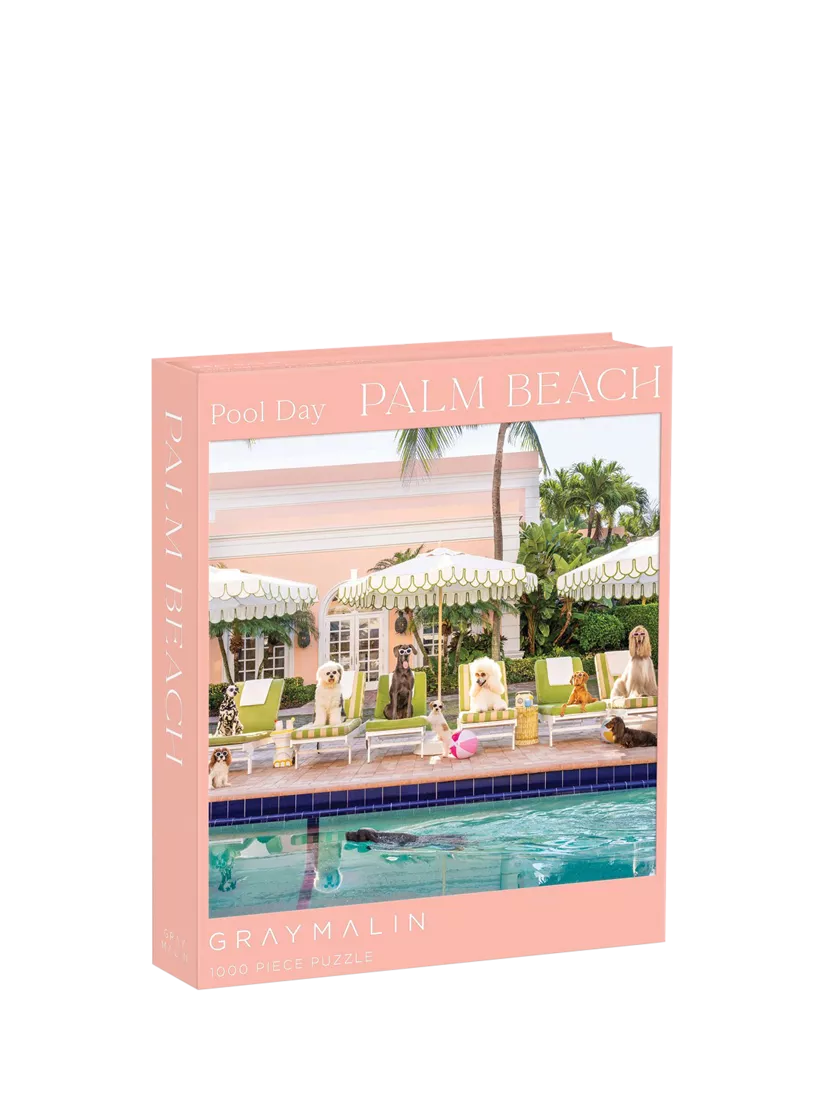 Come and relax by the pool with this exquisite 1000-piece puzzle featuring posh pups soaking up the sun by the pool at the colony hotel, captured through the lens of renowned photographer Gray Malin. Packaged within a box cleverly disguised as a book with a magnetic closure, this puzzle promises an experience both elegant and engaging. As you unravel the puzzle's intricacies, feel the sense of accomplishment with each fitting piece, and witness the scene come to life before your eyes.