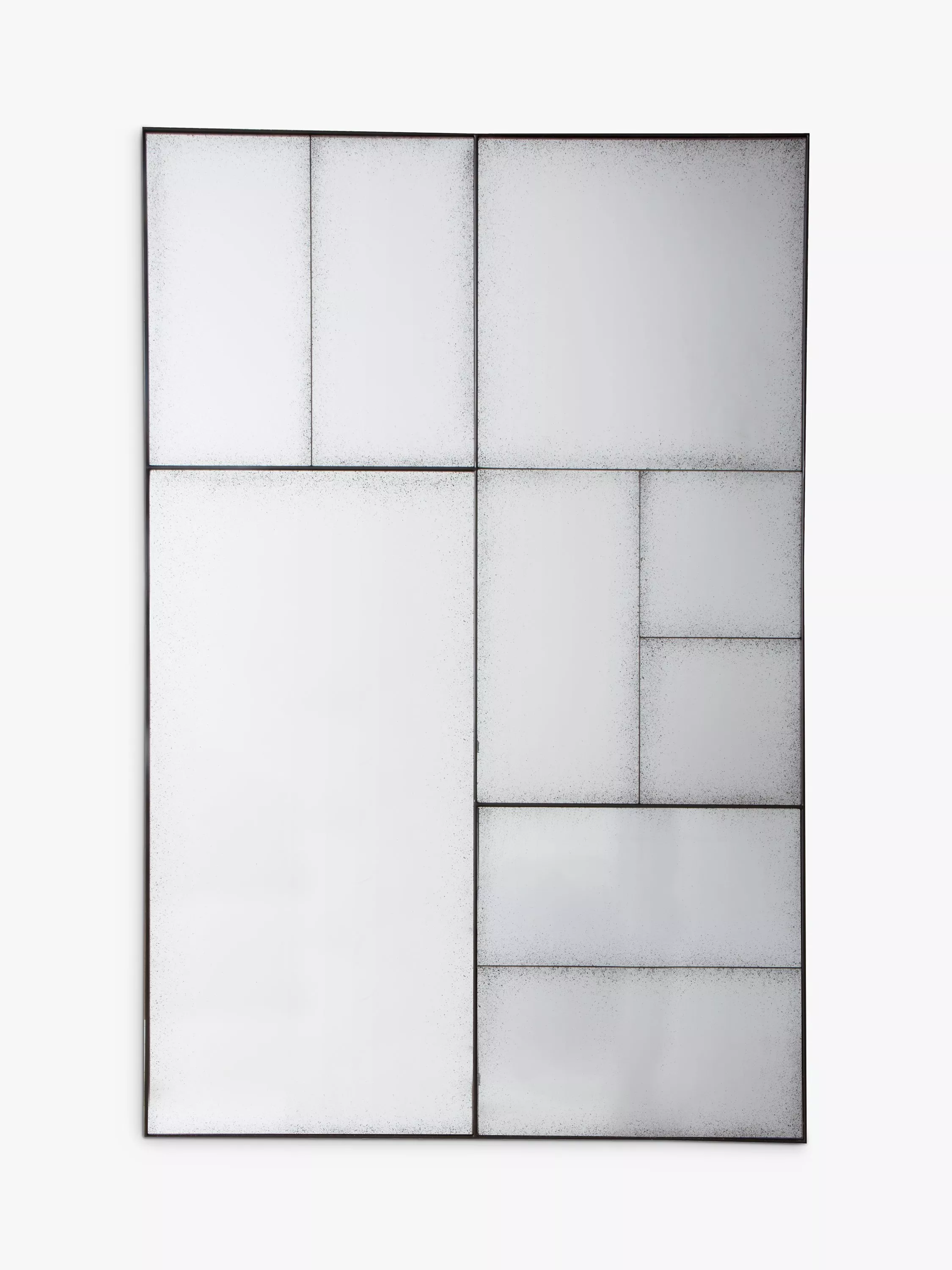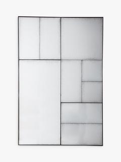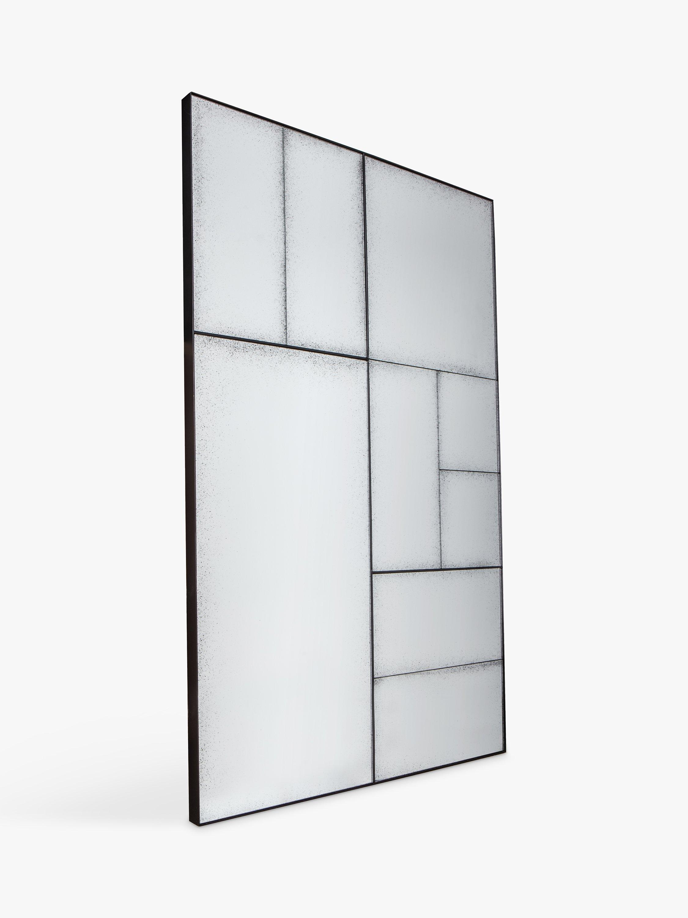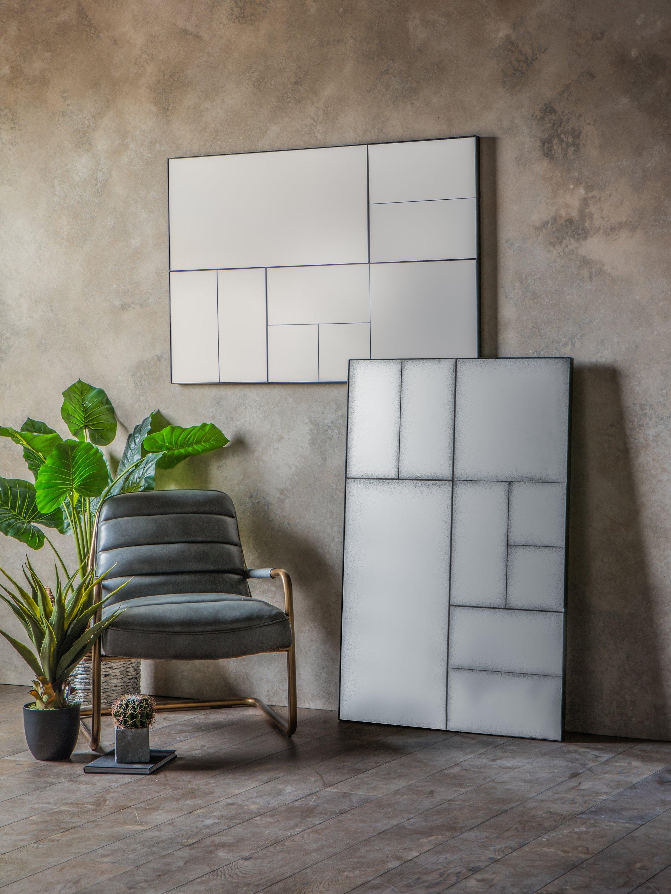 Making a contemporary statement on a wall, individual mirrored pieces with an antiqued finish are set into a structural metal outer frame. The Ampla mirror suits any room or hallway and is ready to wall mount, horizontally or vertically, by the D-ring fittings on the back.