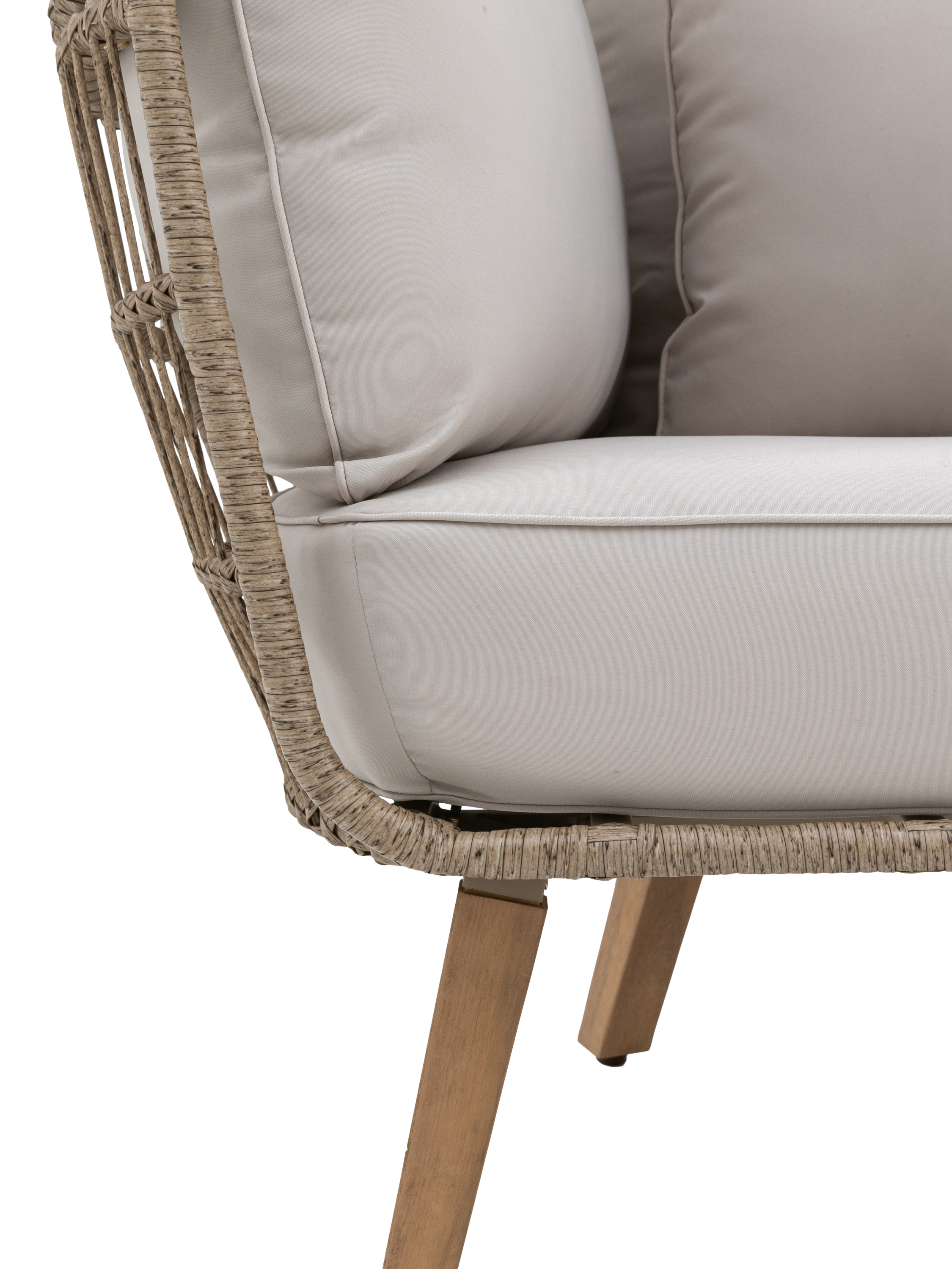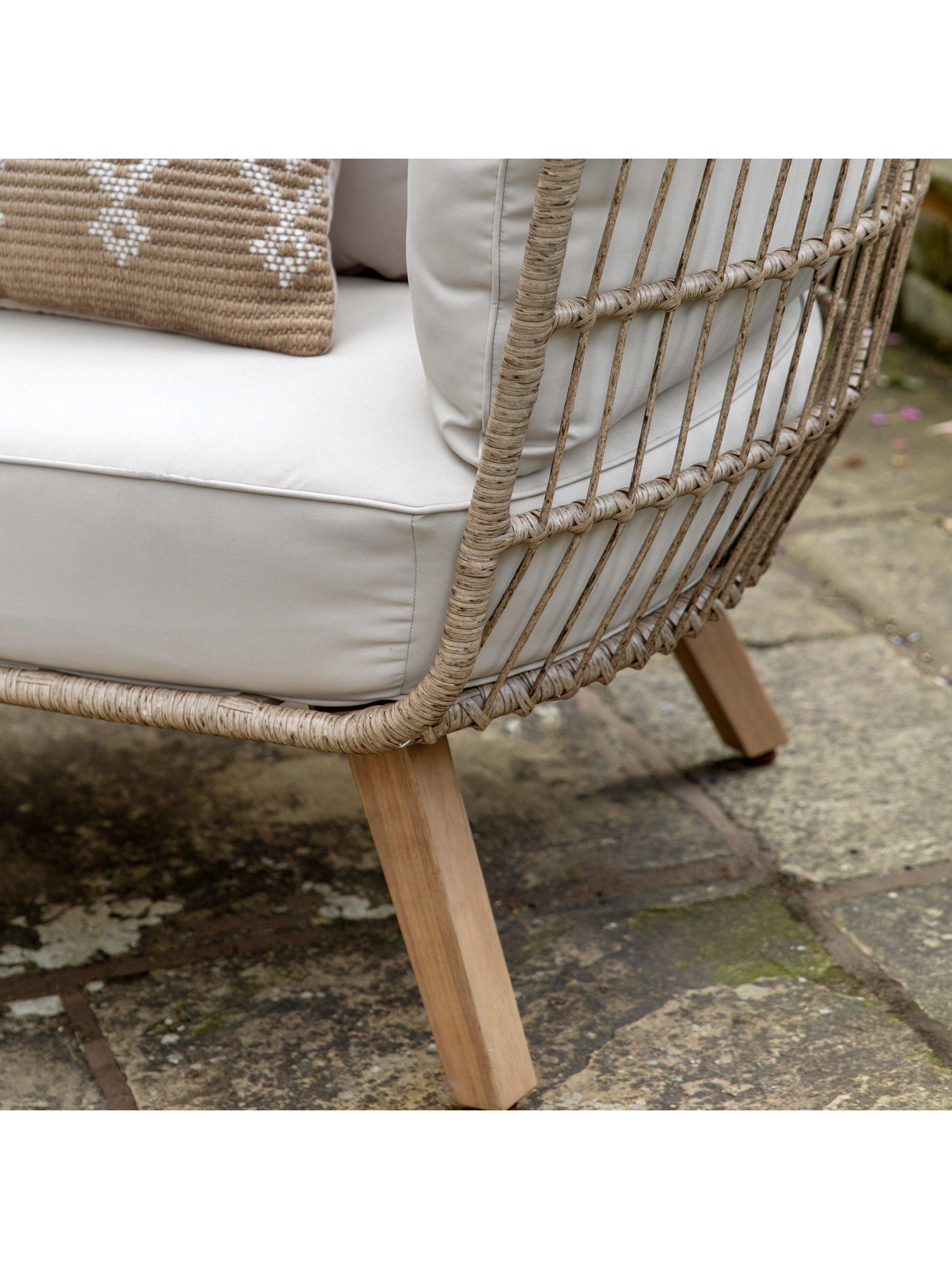 The chair's elegant design and neutral colour palette make it a welcome addition to any outdoor space. Finished with beautiful angled acacia wood legs.
