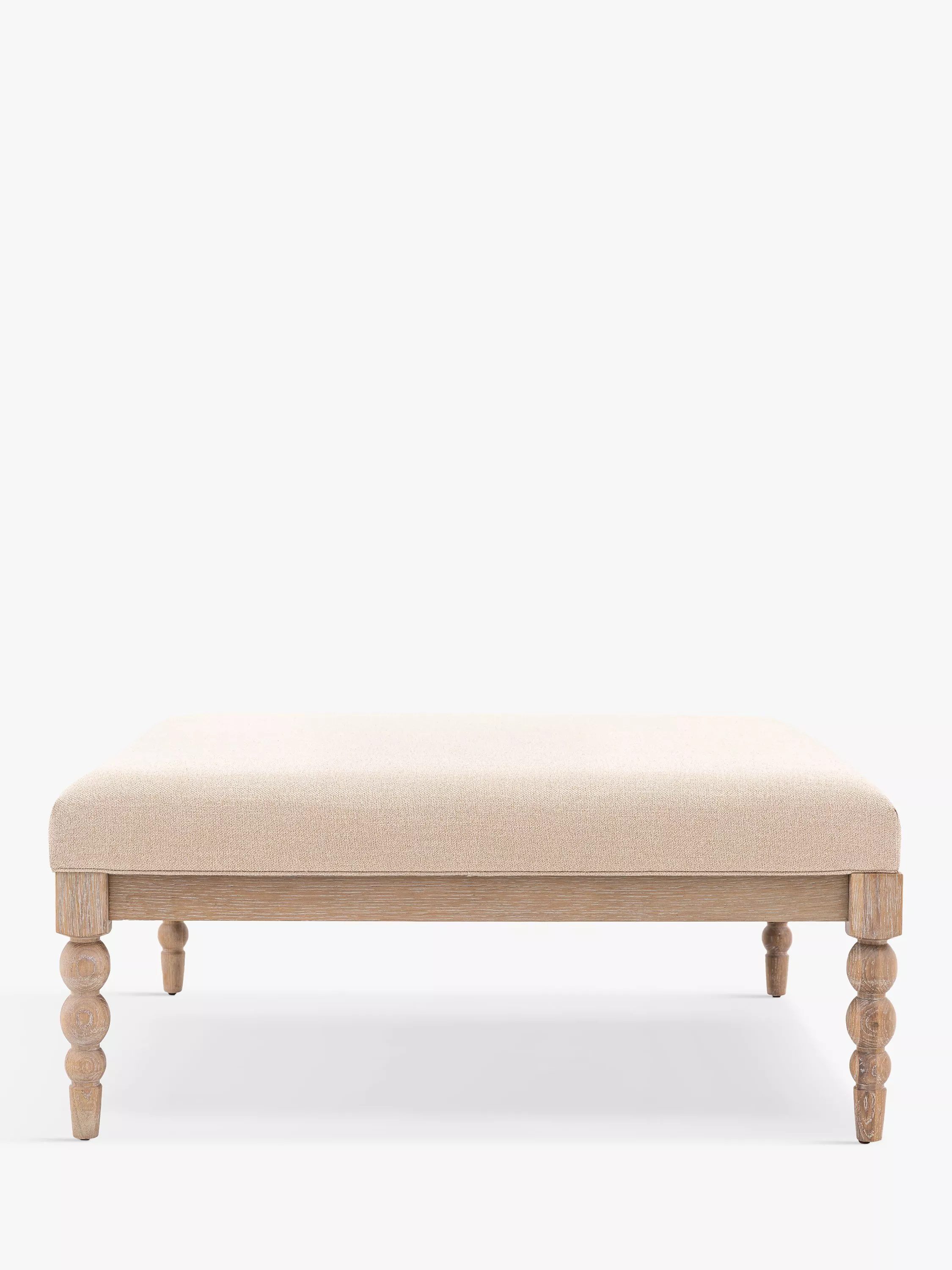 The eye-catching legs on this beautiful coffee table feature hand-crafted "bobbing" detail which is created by turning the wood on a lathe, a task carried out by the finest craftsmen. The table is made from oak with a very subtle lime wash tone to the finish, which is soft and mellow, paired with biscuit-coloured fabric for the upholstered seat.