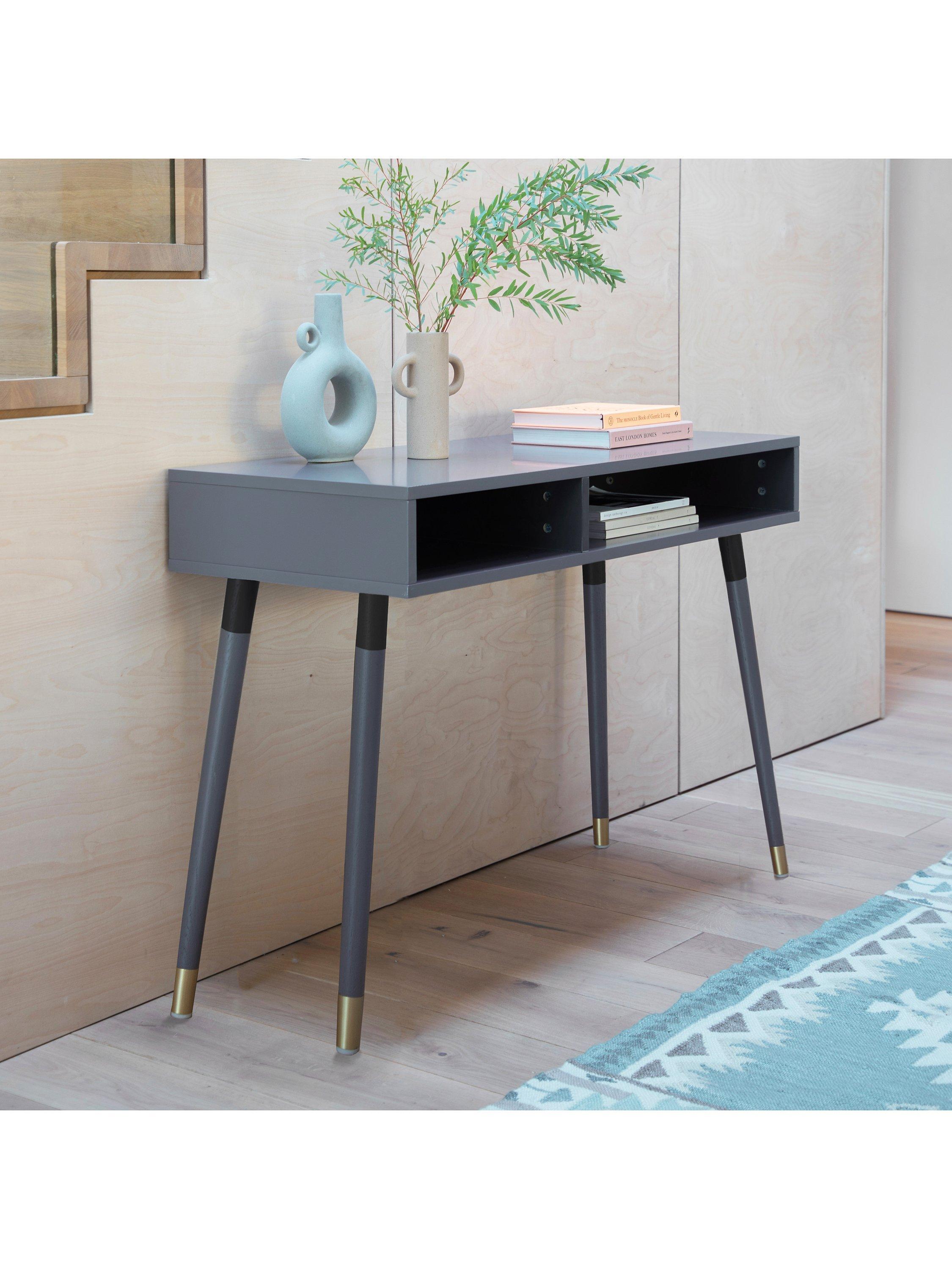 Doubling up as a desk, this console table incorporates storage with both a closed and open section. It's made from sturdy timber in a selection of painted finishes and it's accented with brass-effect detail. Supplied flat-packed, but assembly is straightforward and all the tools you'll need are included.