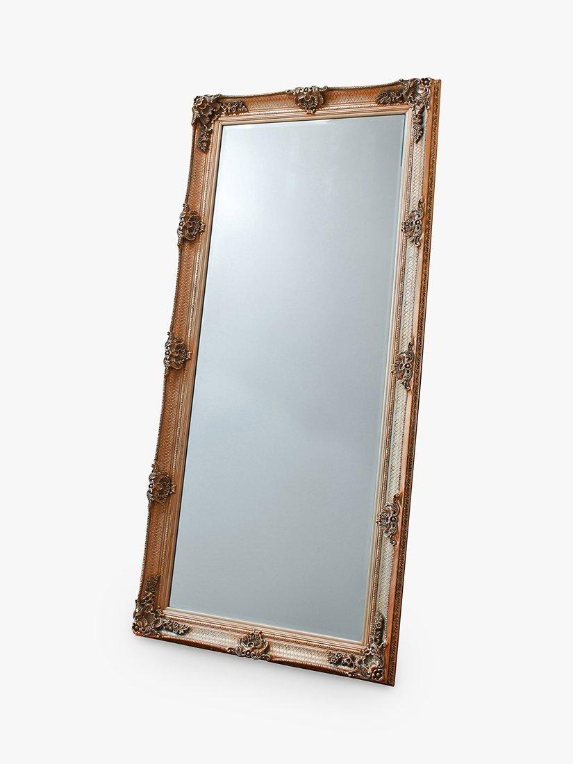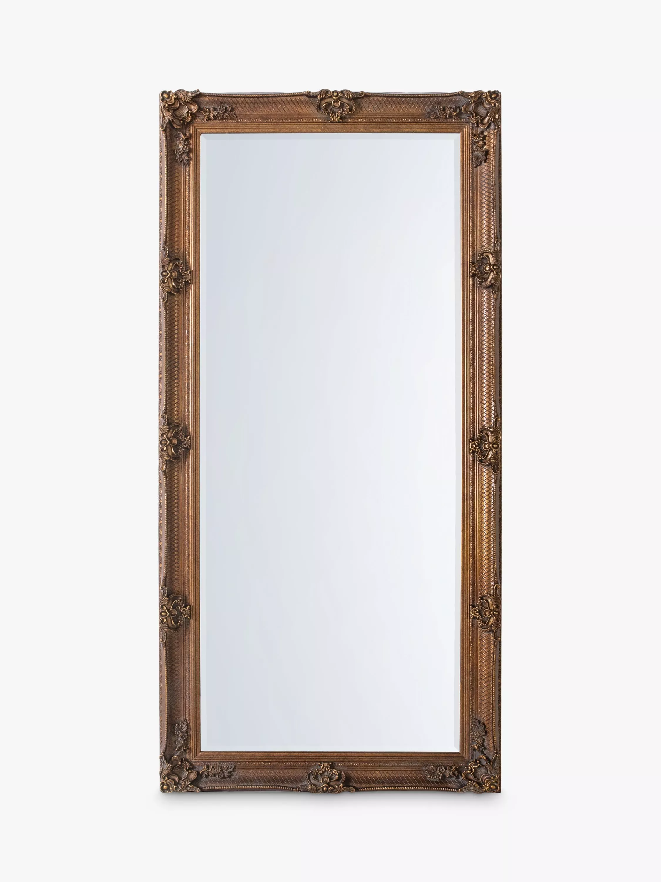 Beautiful hand-crafted Baroque-style wood frame mirror with resin detailing. A rectangular leaner mirror that can also be wall-mounted.