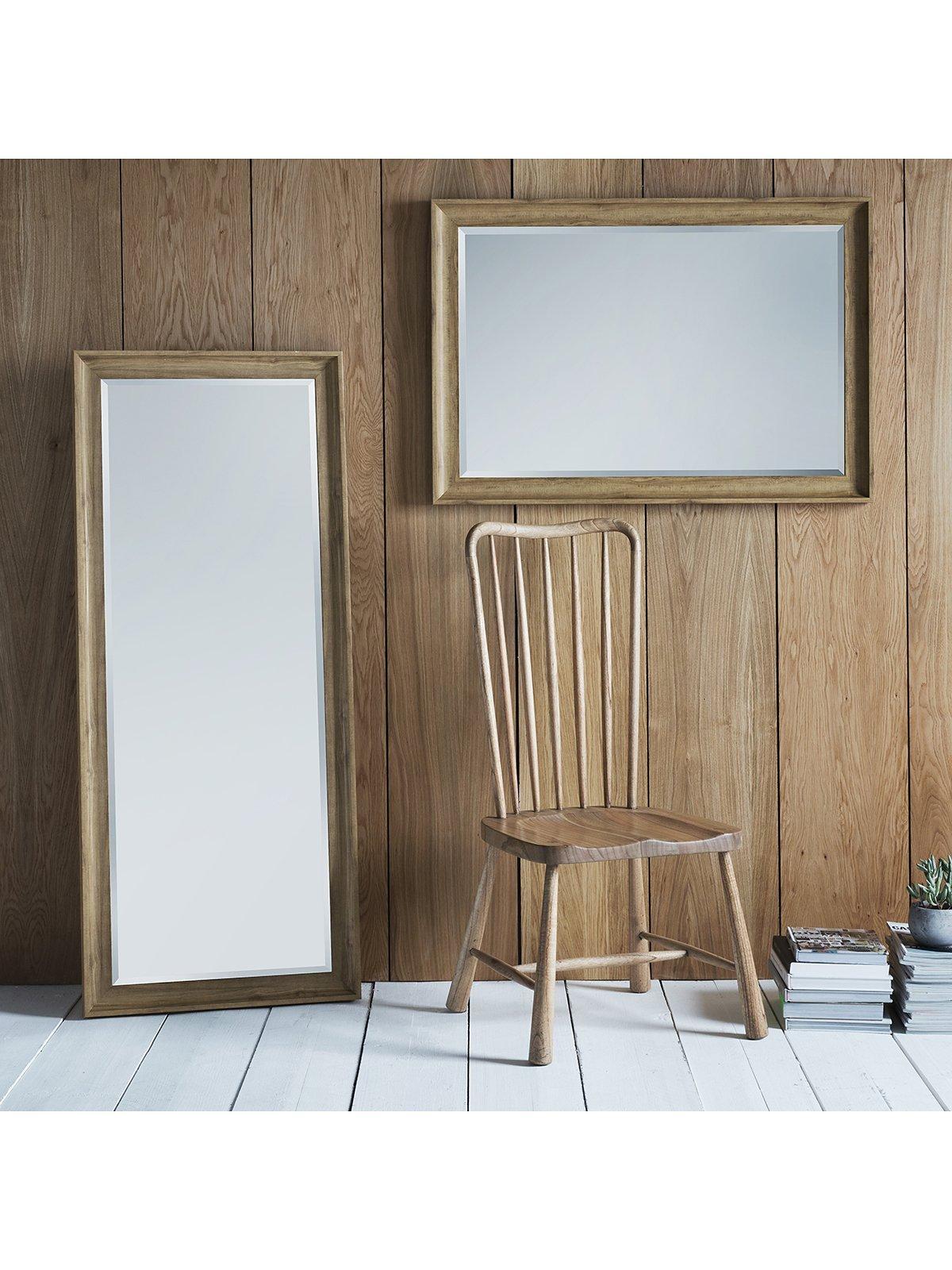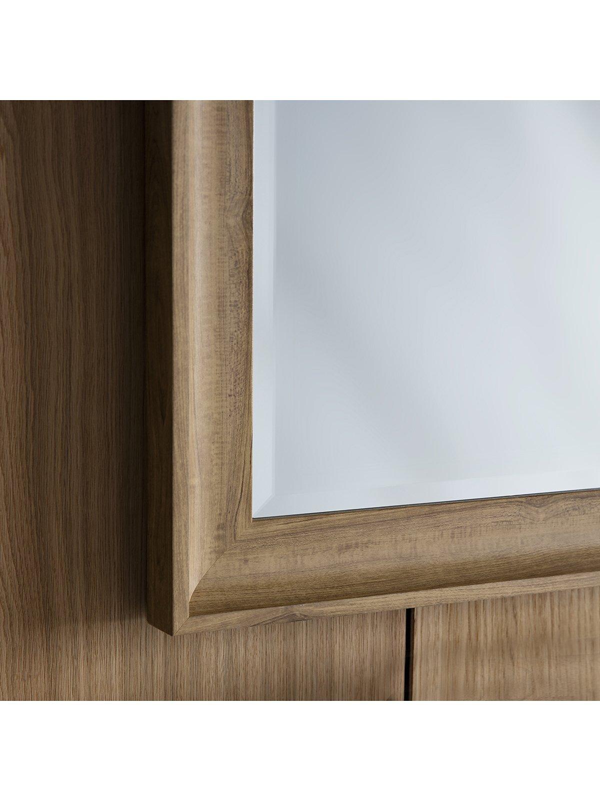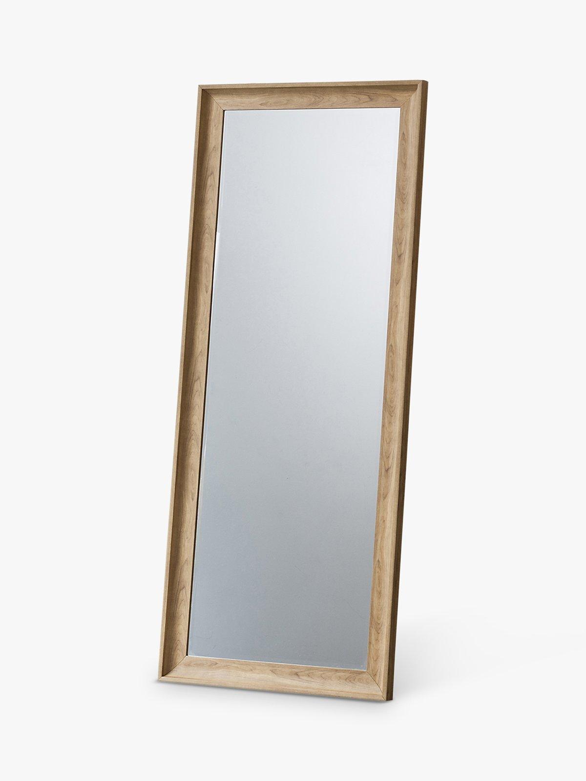 The Fraser mirror has a Nordic-inspired wood-effect scooped frame in an oak finish. This rectangular mirror is ideal for capturing full-length reflections and leans against a wall without having to be mounted.