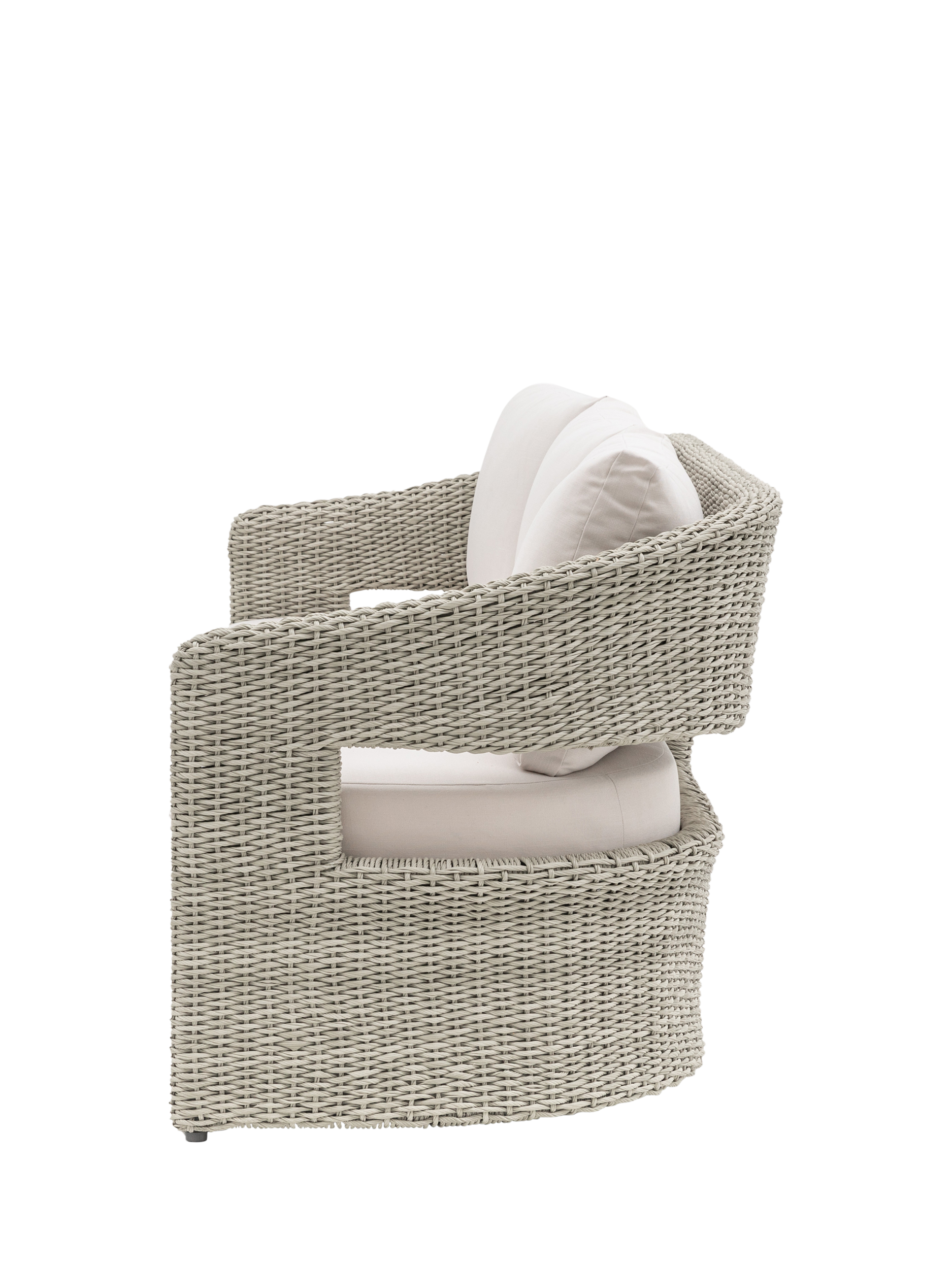 Stylish and comfortable three-seater sofa for relaxing in your garden or on your patio. A captivating blend of modern design and artisanal craftsmanship, the woven rattan frame provides a durable and weather-resistant structure, while the plump seat and backrest cushions offer luxurious seating. The bold, geometric shape adds a touch of contemporary flair.