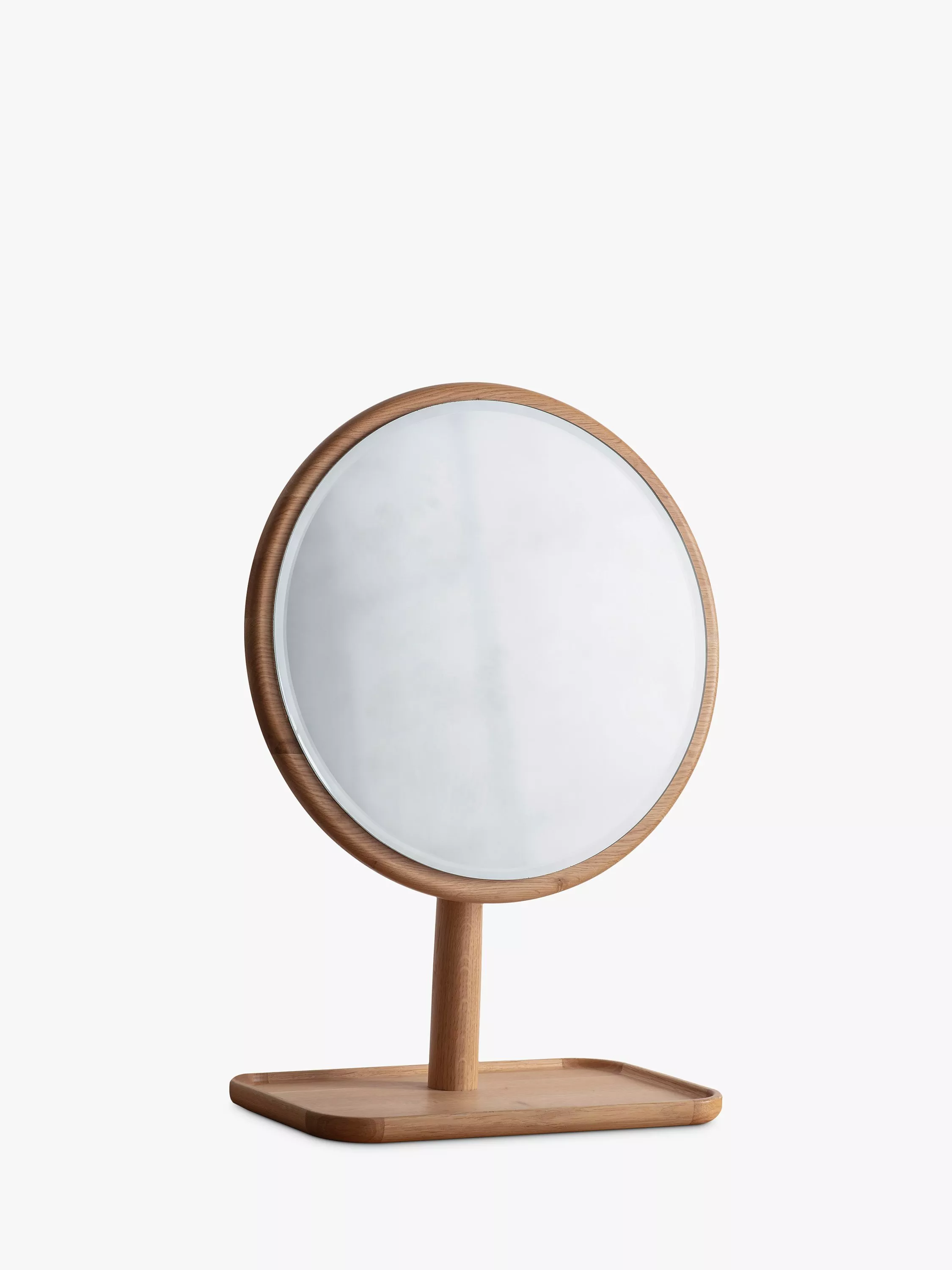 This contemporary Kingham oak wood mirror is a Nordic-inspired freestanding design that can be placed on a dressing table. The round mirror is elevated above a matching tray for your trinkets and favourite items.