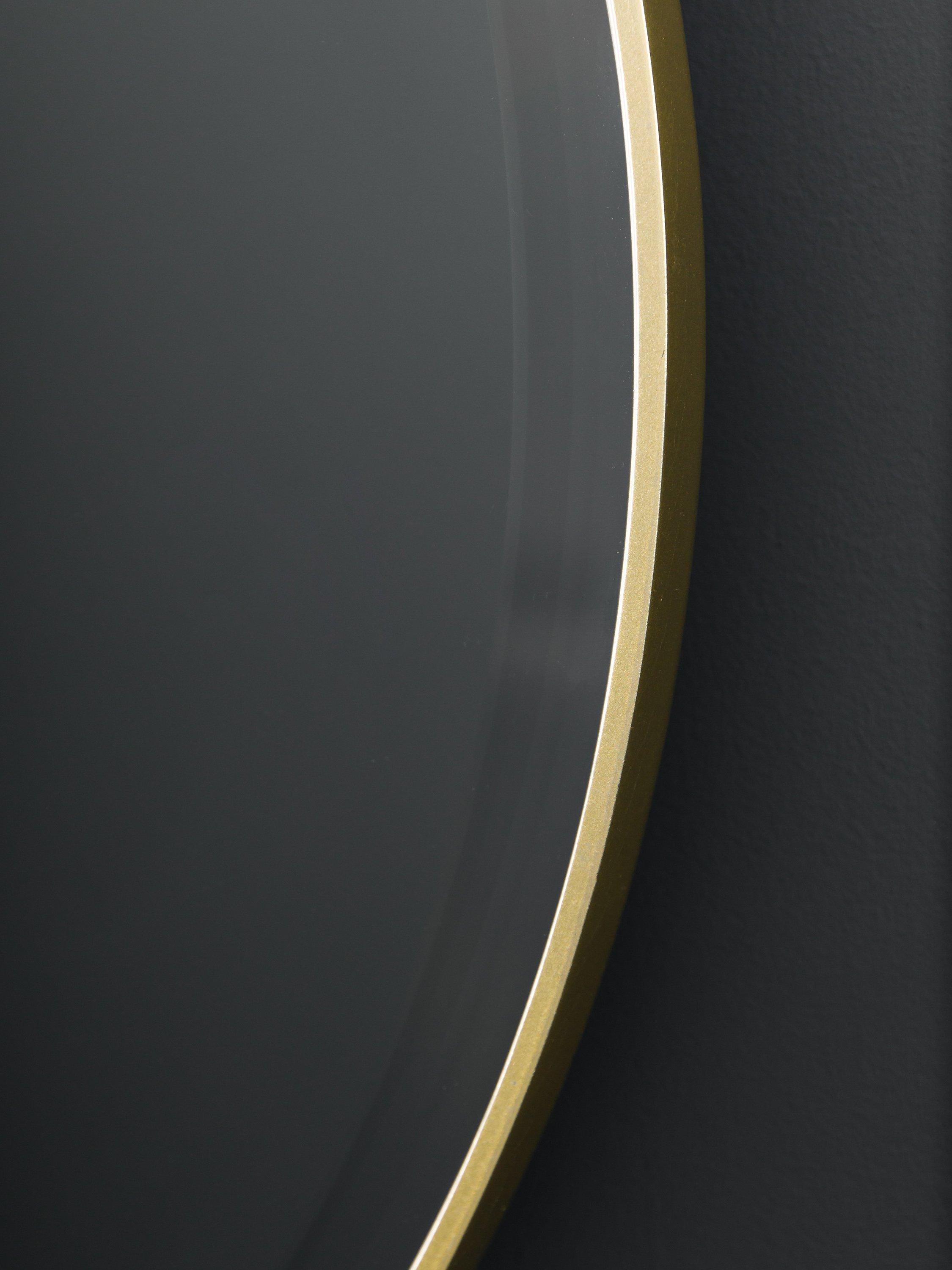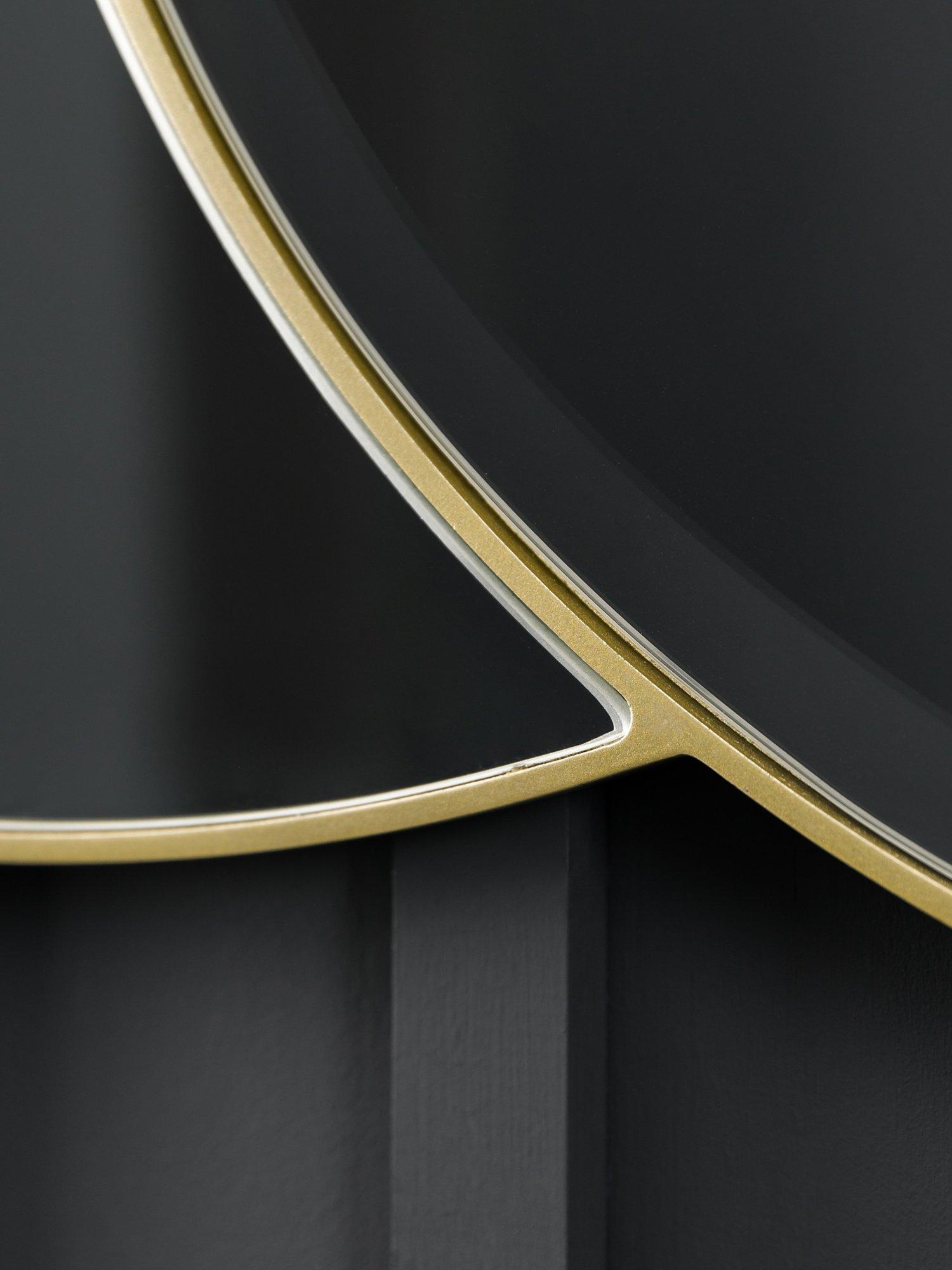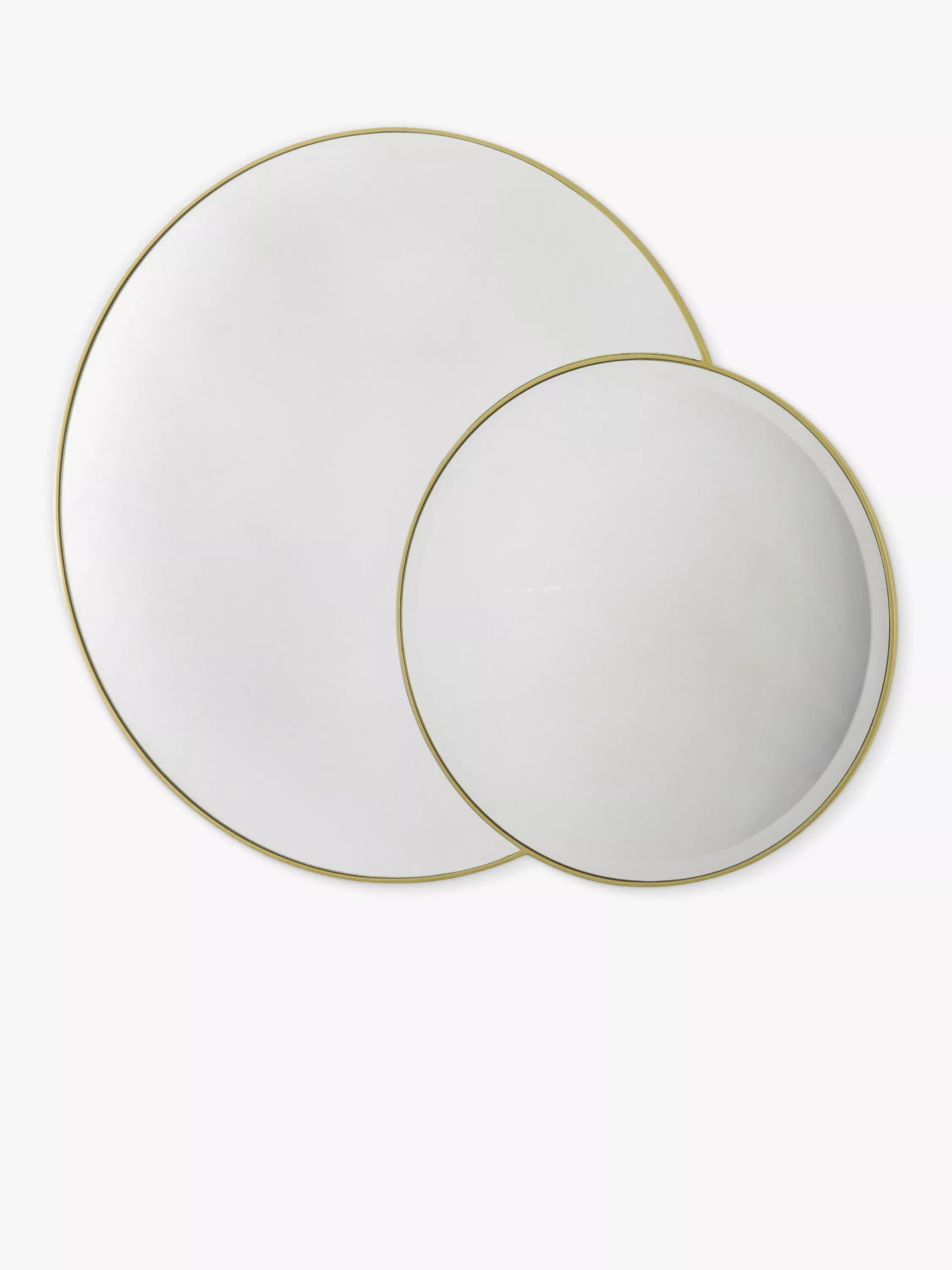 Contemporary wall mirror with interlocking circular shapes, a decorative piece of art in itself. Add some visual intrigue to your wall with this mirror and its chic champagne frame.
