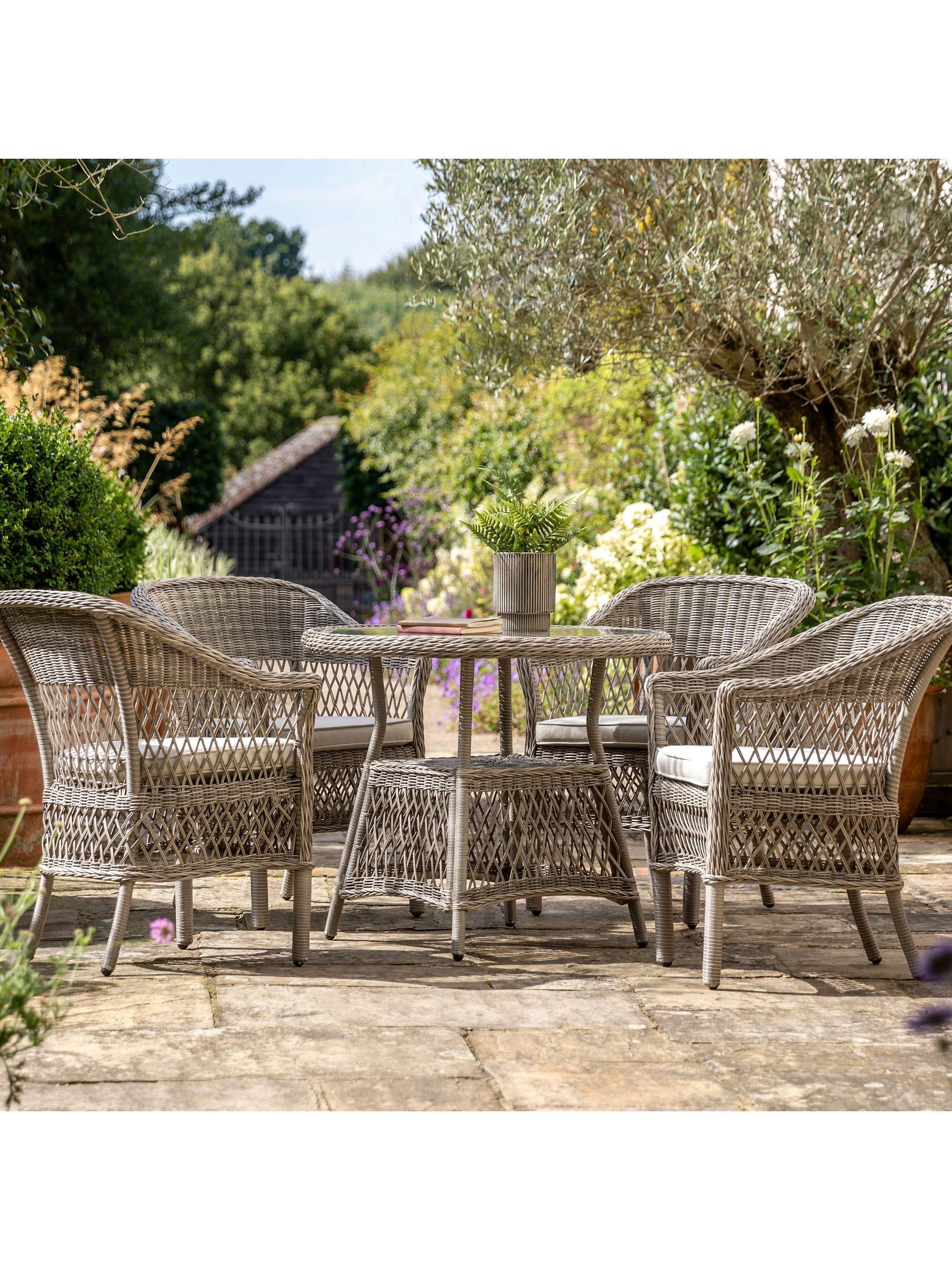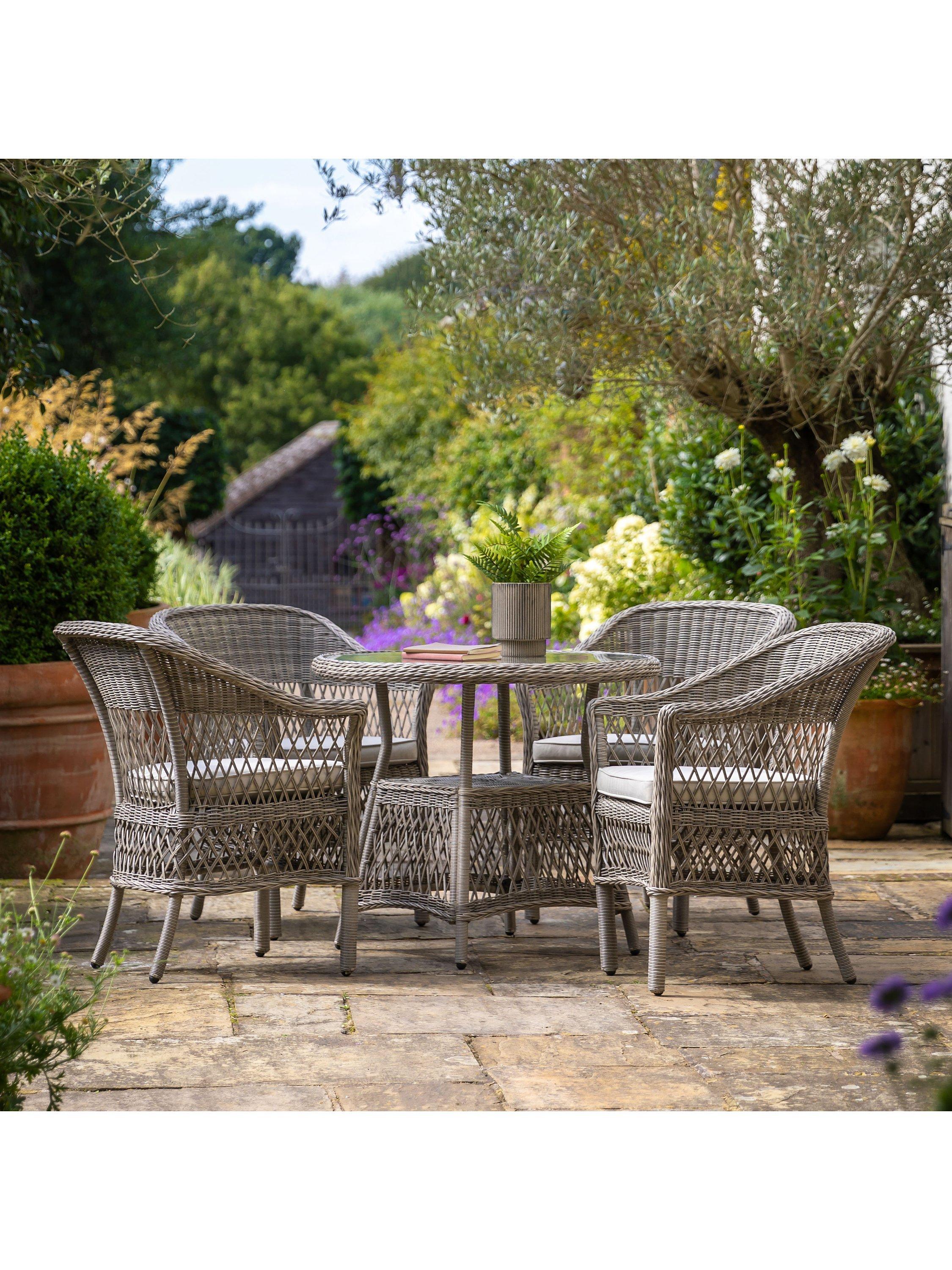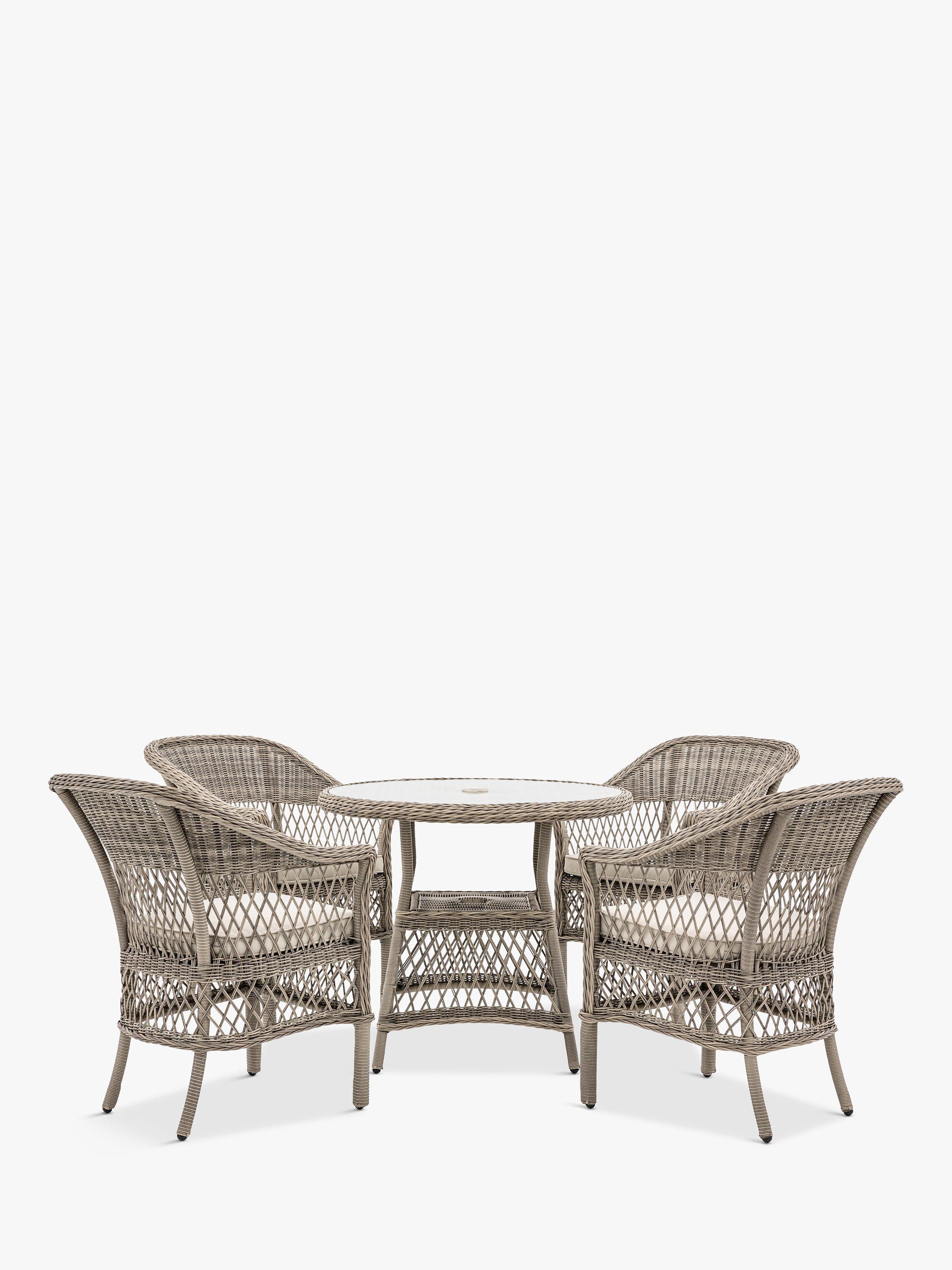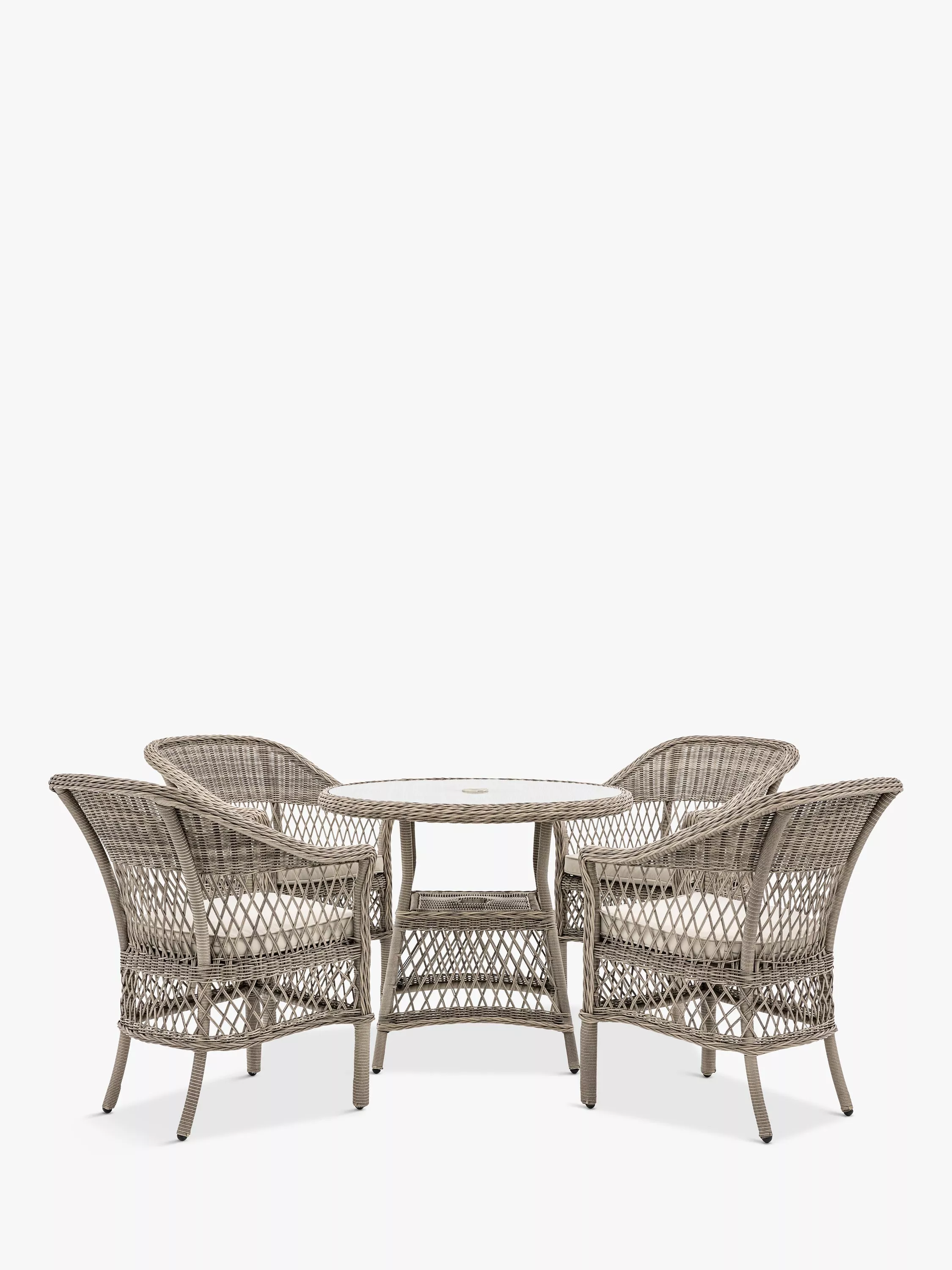 Rattan-style four-seater garden dining set from Gallery Direct. Made with a 5mm-thick weave in all-weather polyrattan, it's weather-resistant. Includes luxurious shower-resistant seat cushion pads in a soft neutral colour to complement the colour of the rattan. The practical round dining table has a handy storage shelf and parasol hole.