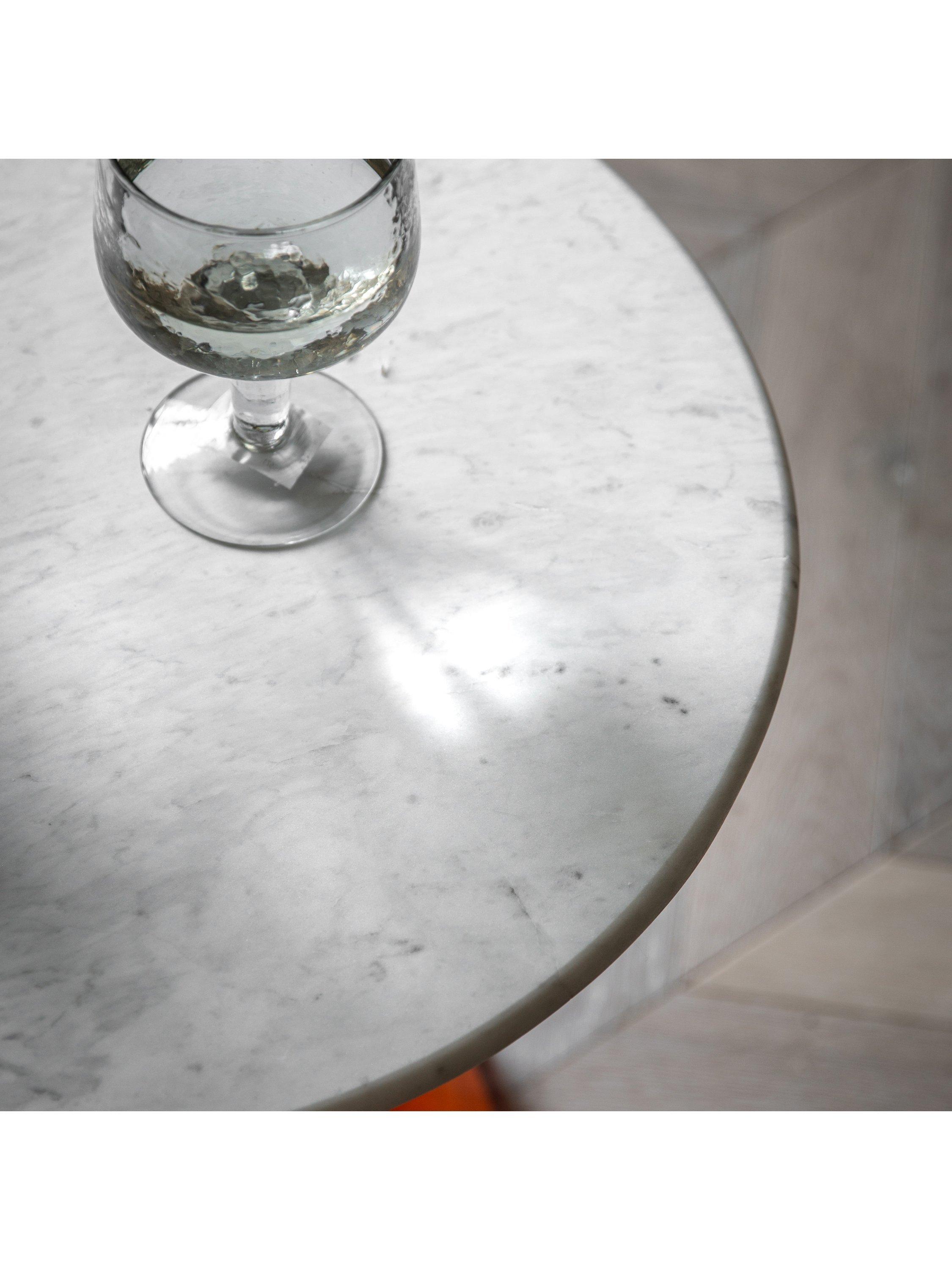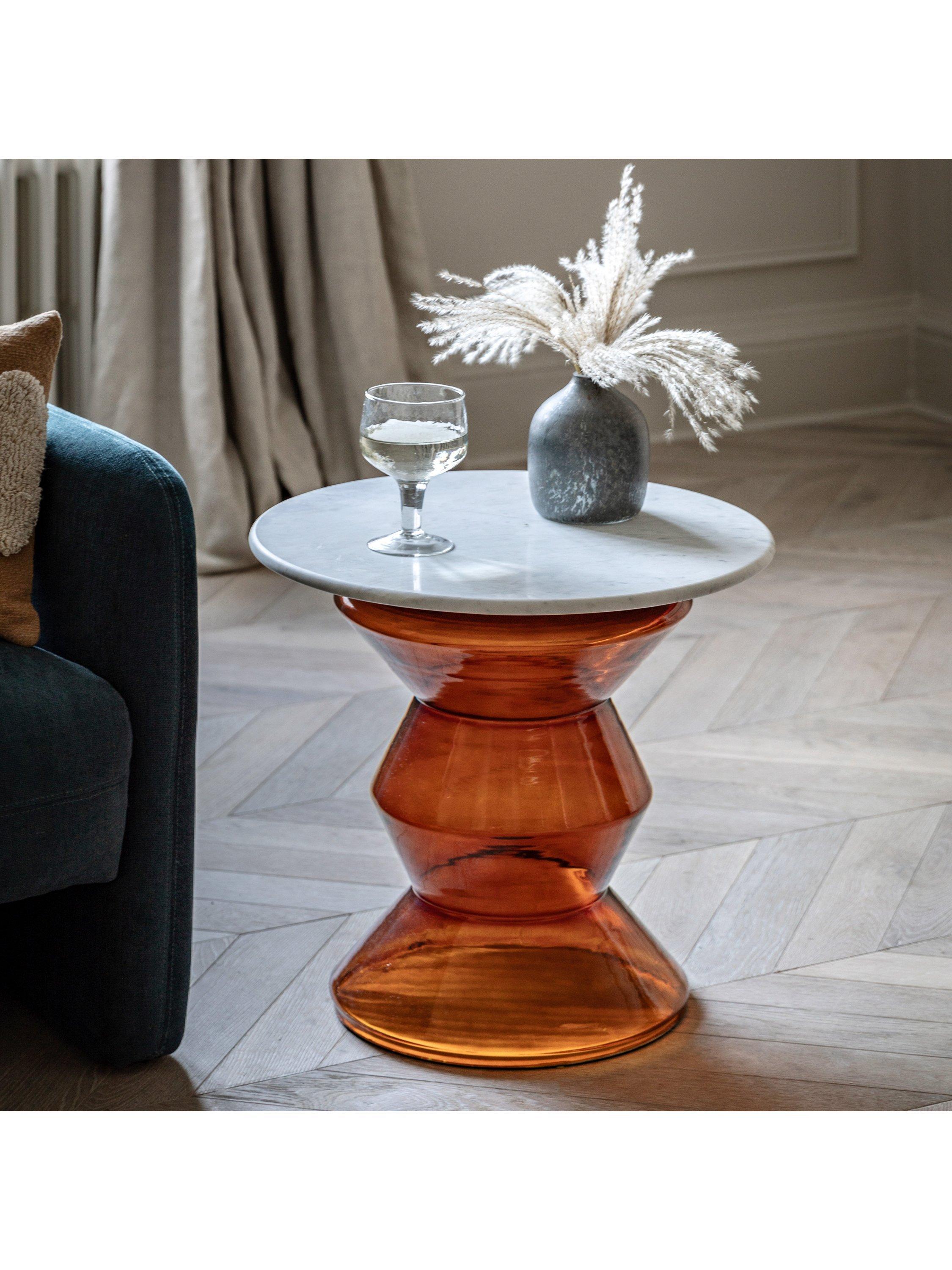 Bold and beautiful this glass based side table is definitely an eye catching piece of furniture. The shaped glass base is topped by a luxe white marble top with a metal collar, creating a stand out table designed to add a bit of luxury to your room.