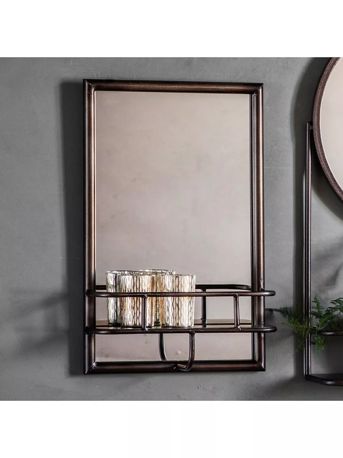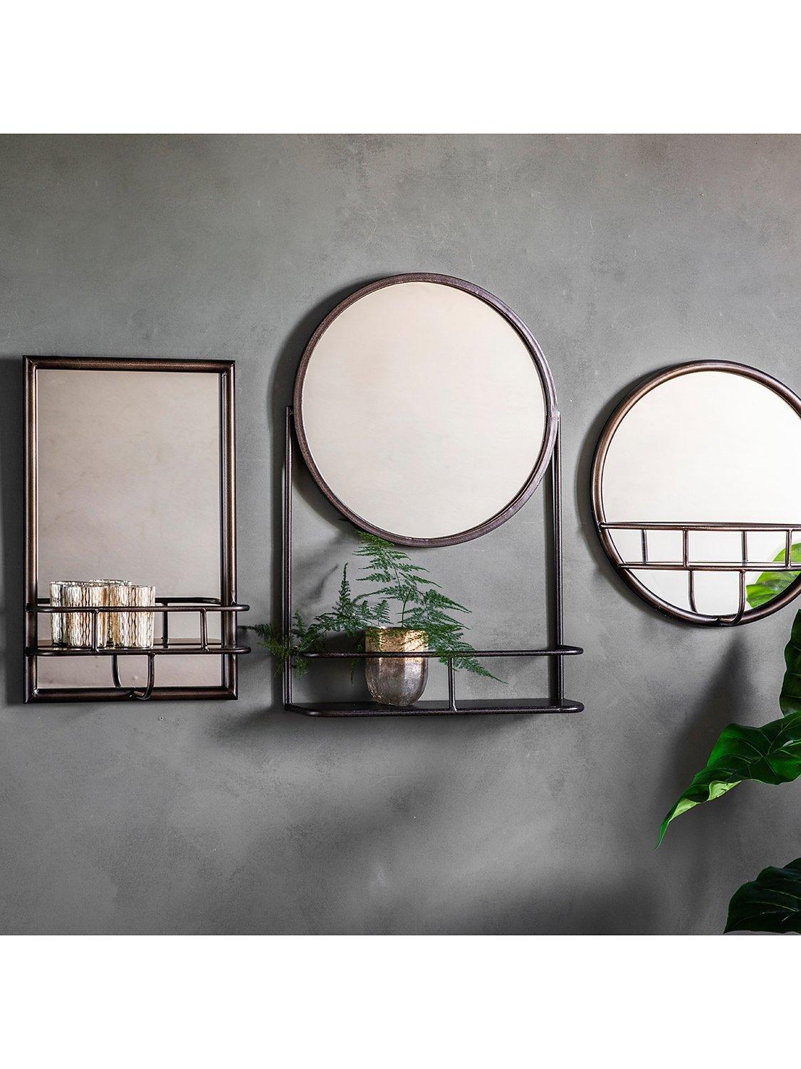 Combining both a rectangular mirror and storage shelf, this metal-frame wall mirror has an on-trend industrial feel.