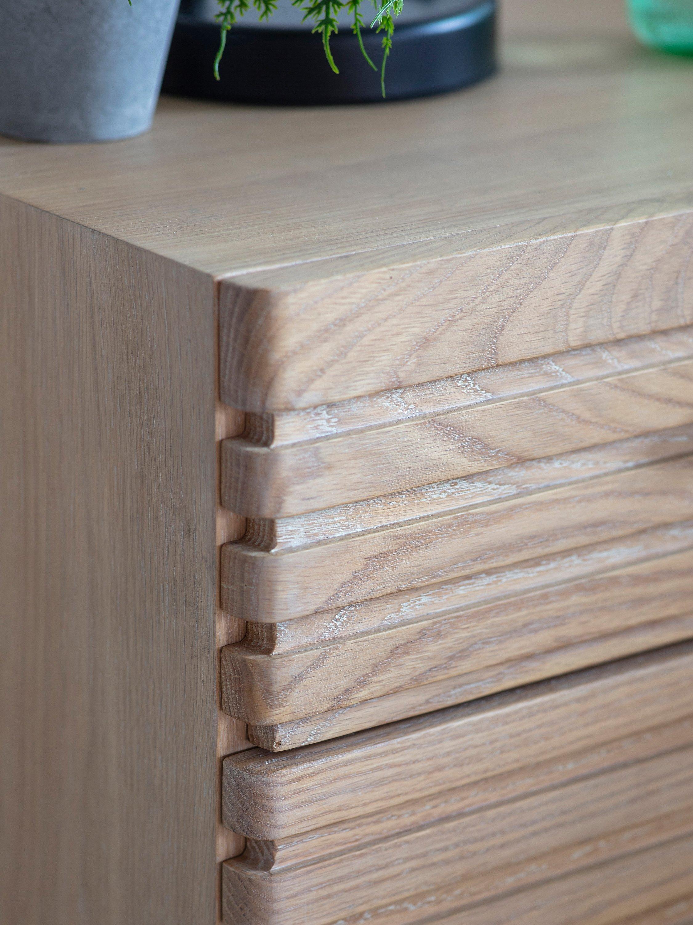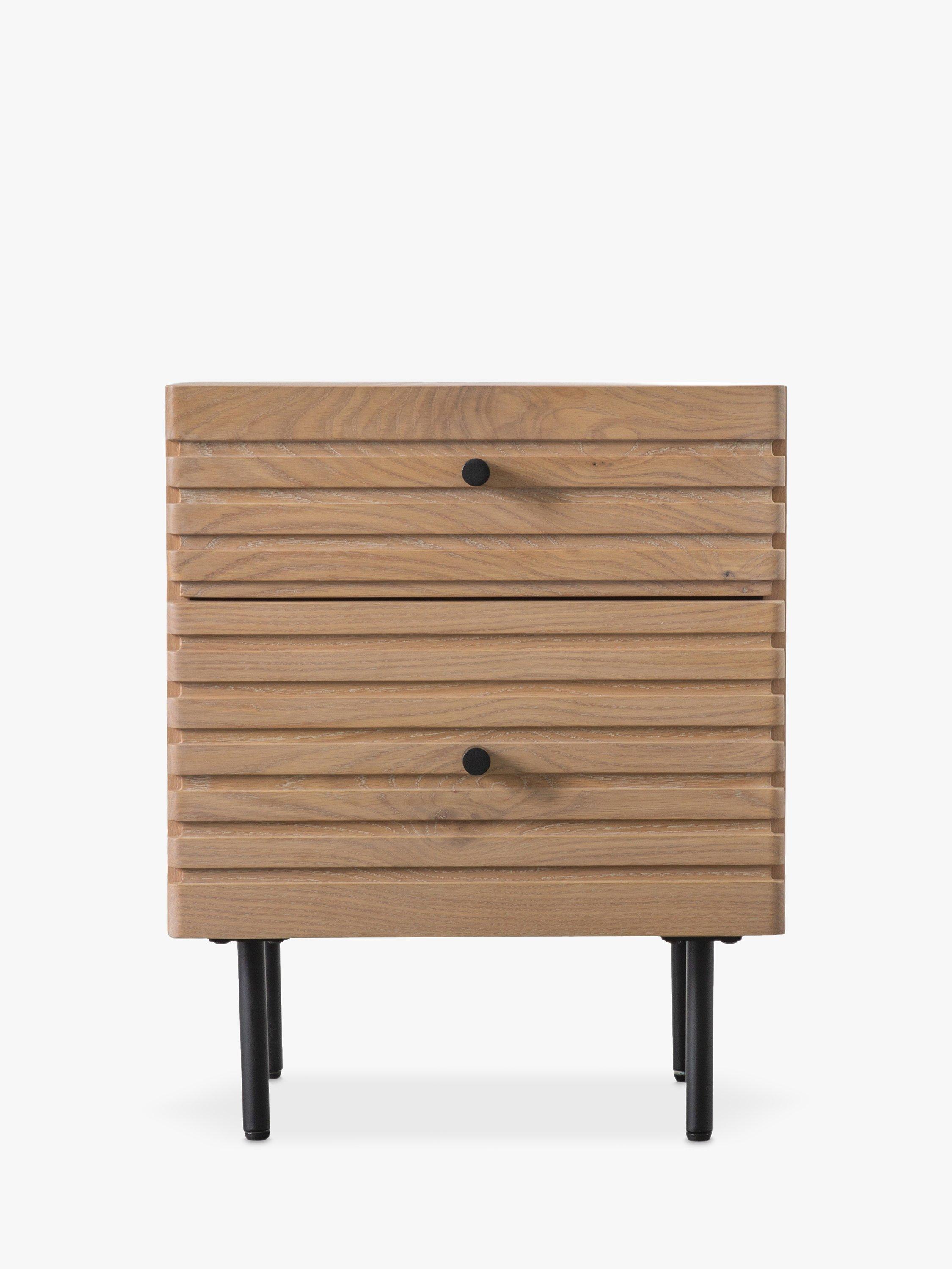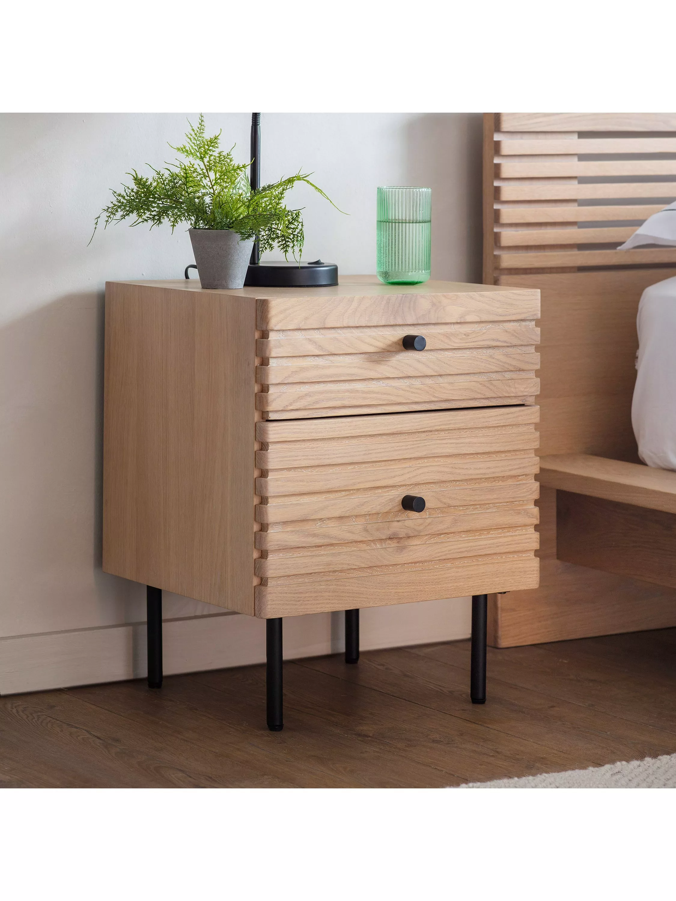 The Okayama two drawer bedside table from Gallery Direct features solid oak drawer fronts which are beautifully routed. Radius detailing up the edges of the drawer fronts adds a classy high-quality finish. Slim black metal legs and matching handles complete the look.
