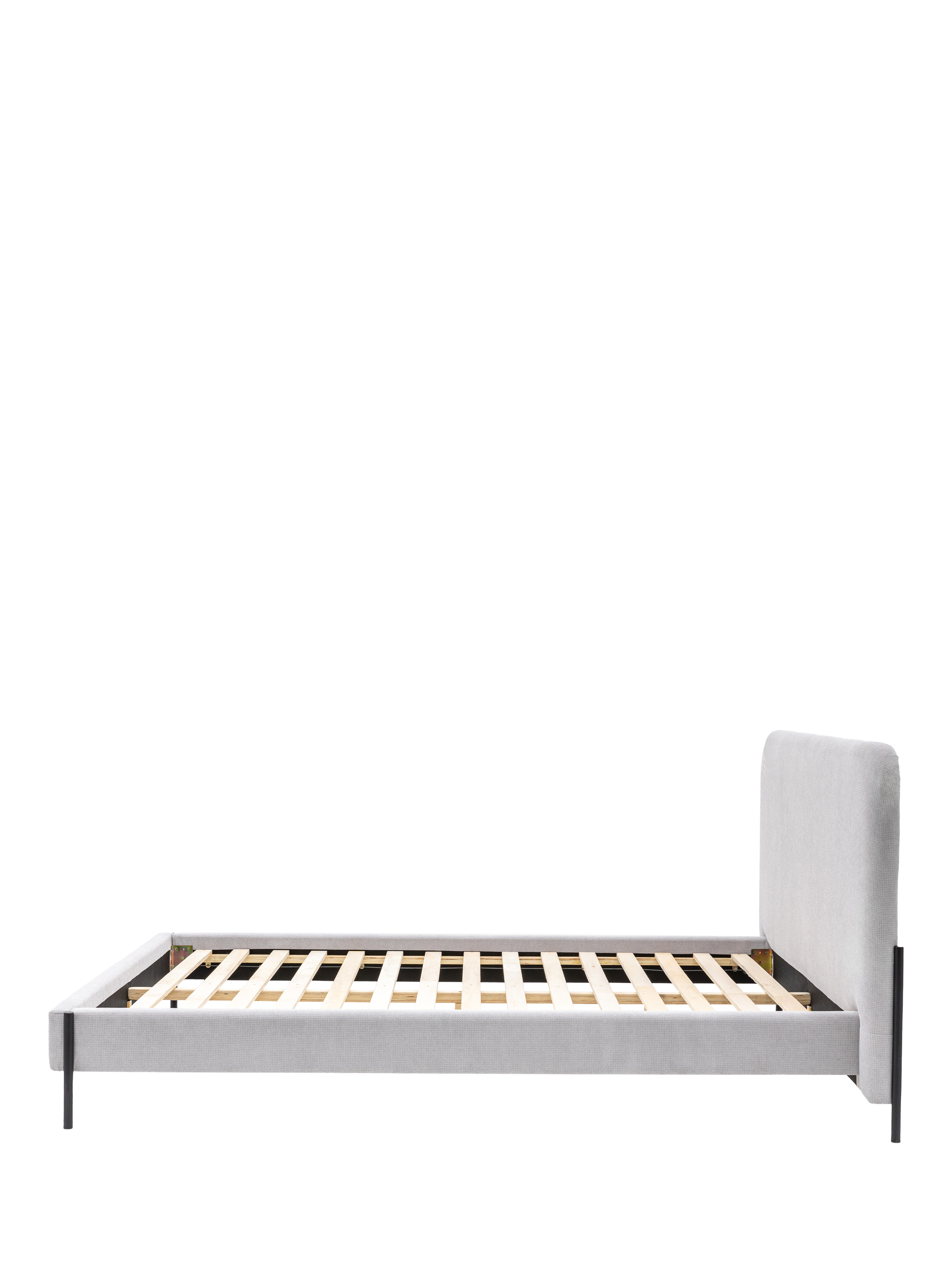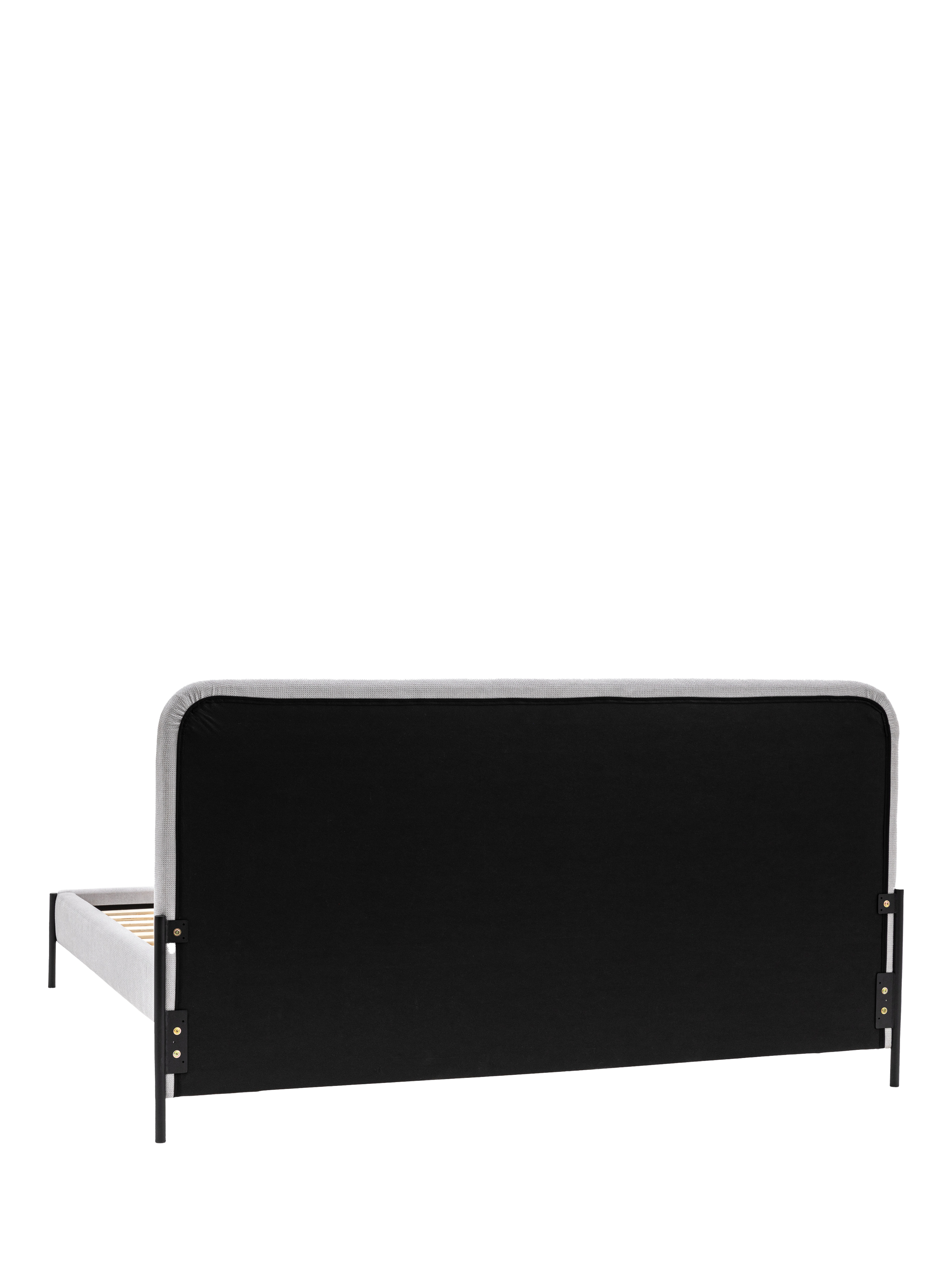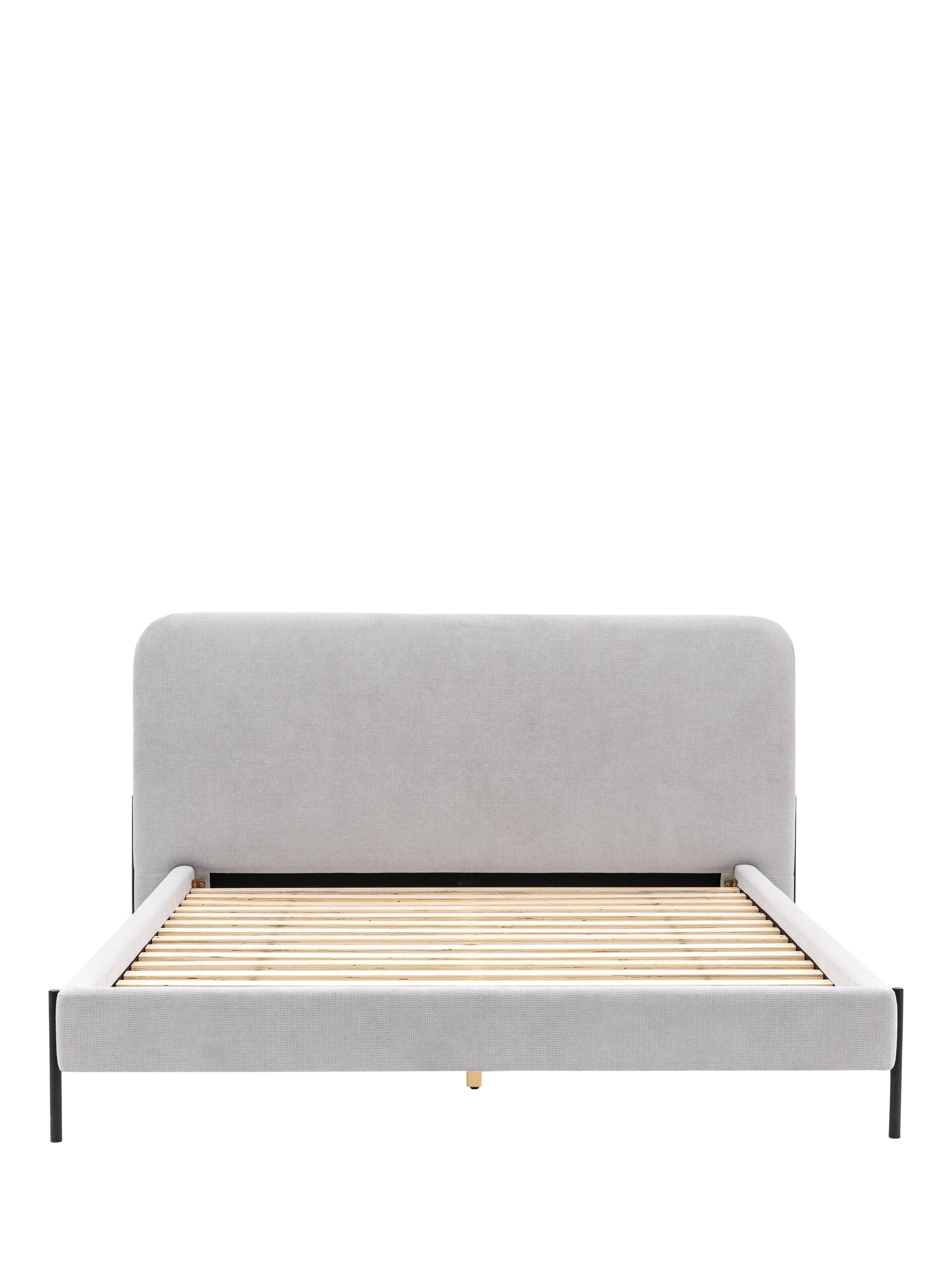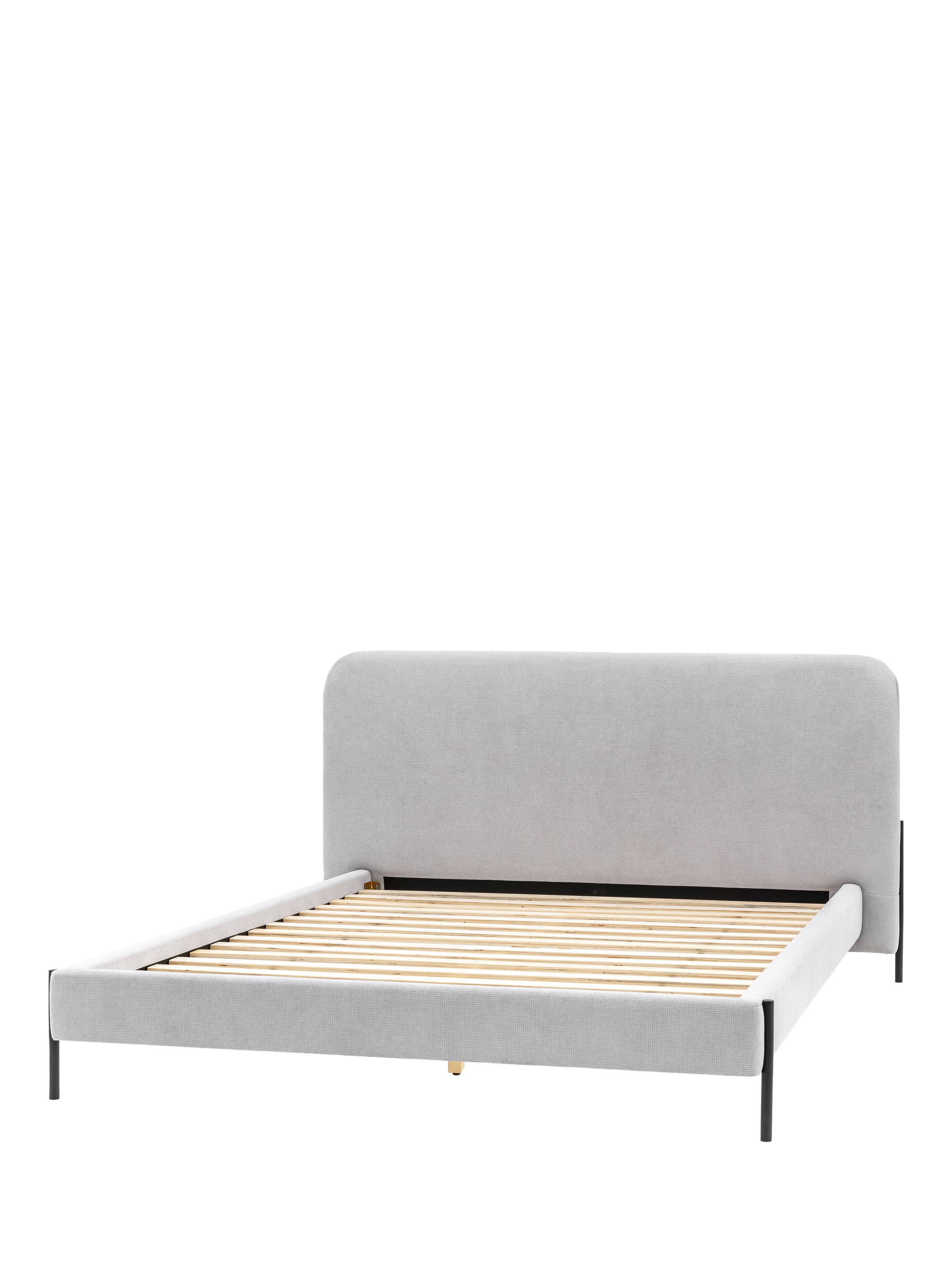 A versatile upholstered bed frame with a modern design that incorporates a curved headboard and sleek metal legs. Solid slats in the base provide a firmer foundation for your mattress.