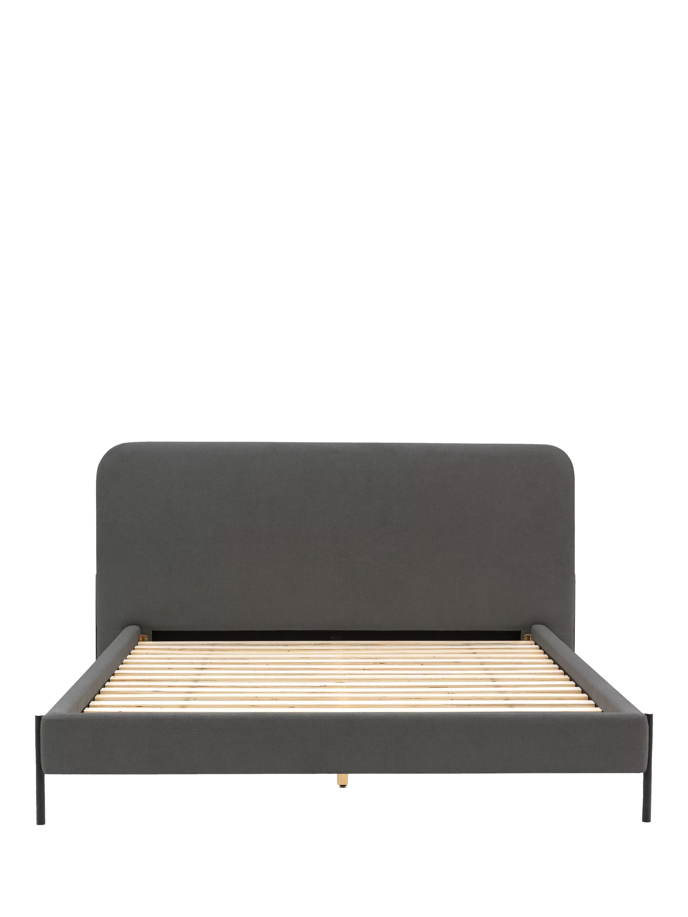 A versatile upholstered bed frame with a modern design that incorporates a curved headboard and sleek metal legs. Solid slats in the base provide a firmer foundation for your mattress.