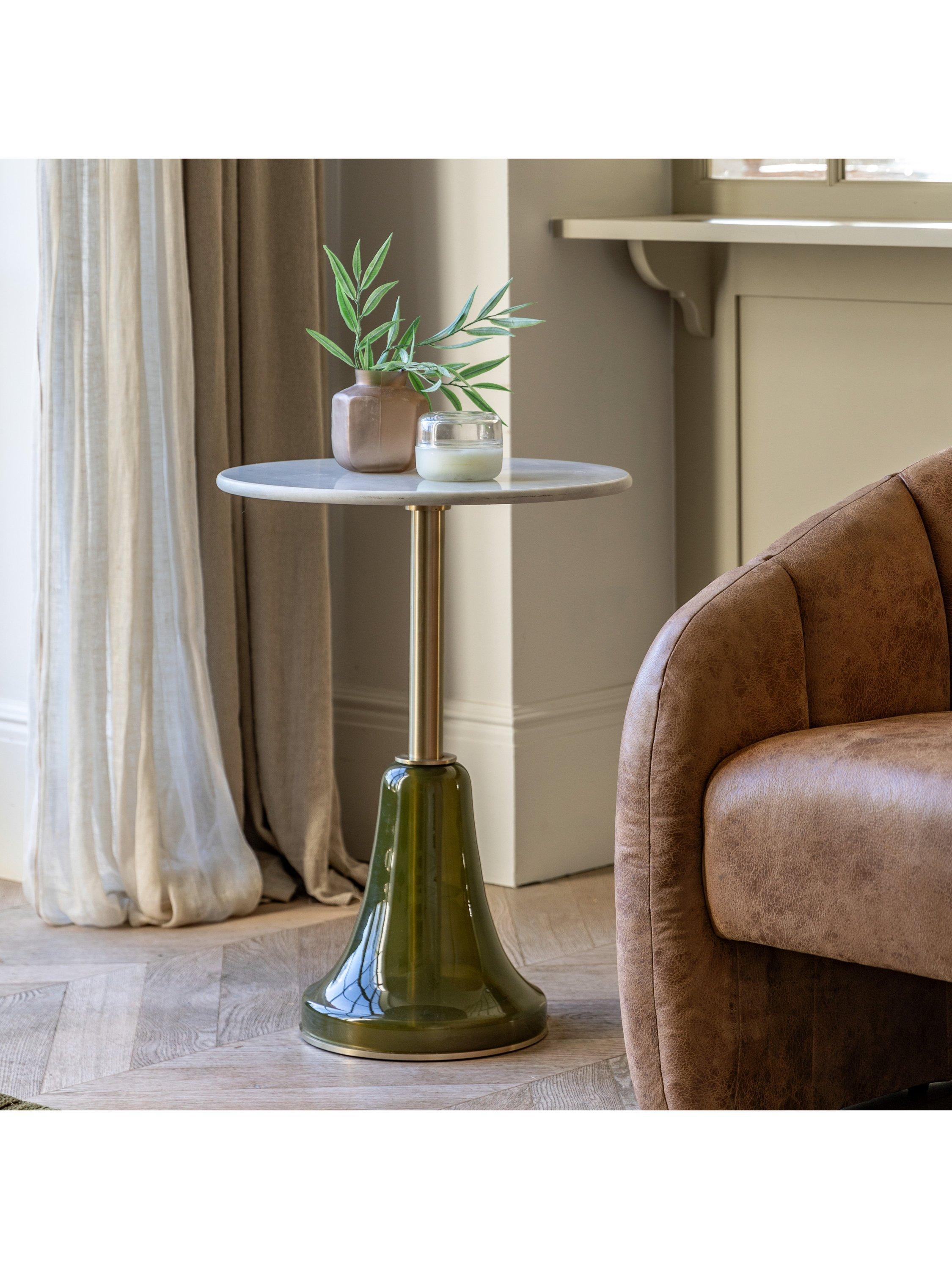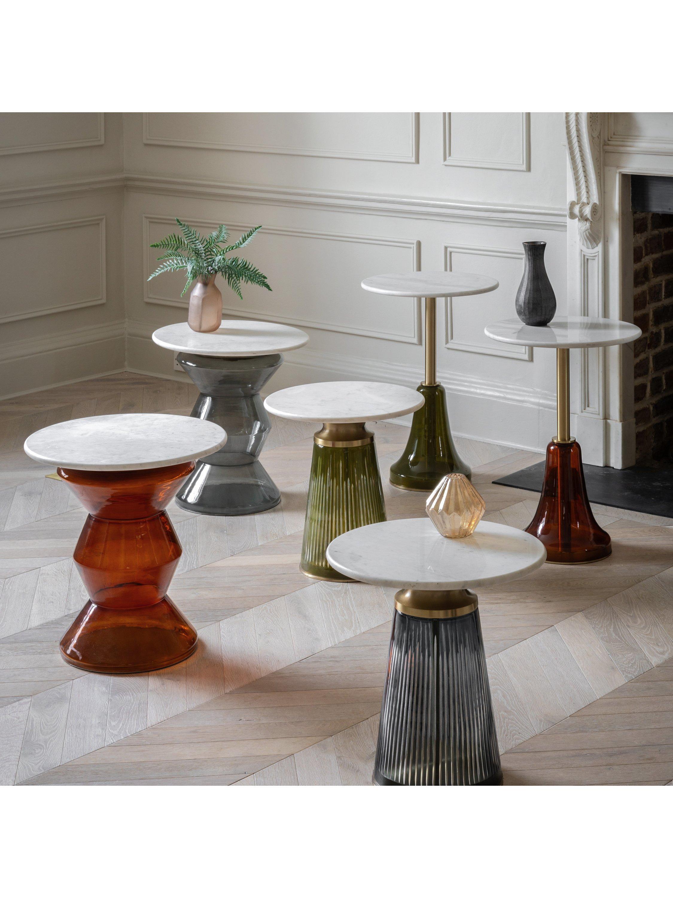 Undeniably a stand out piece of furniture, this luxe side table has a hint of retro styling and a truly unique design. The dusk glass base won't go unnoticed while the metal stem and white marble top add a touch of luxury.