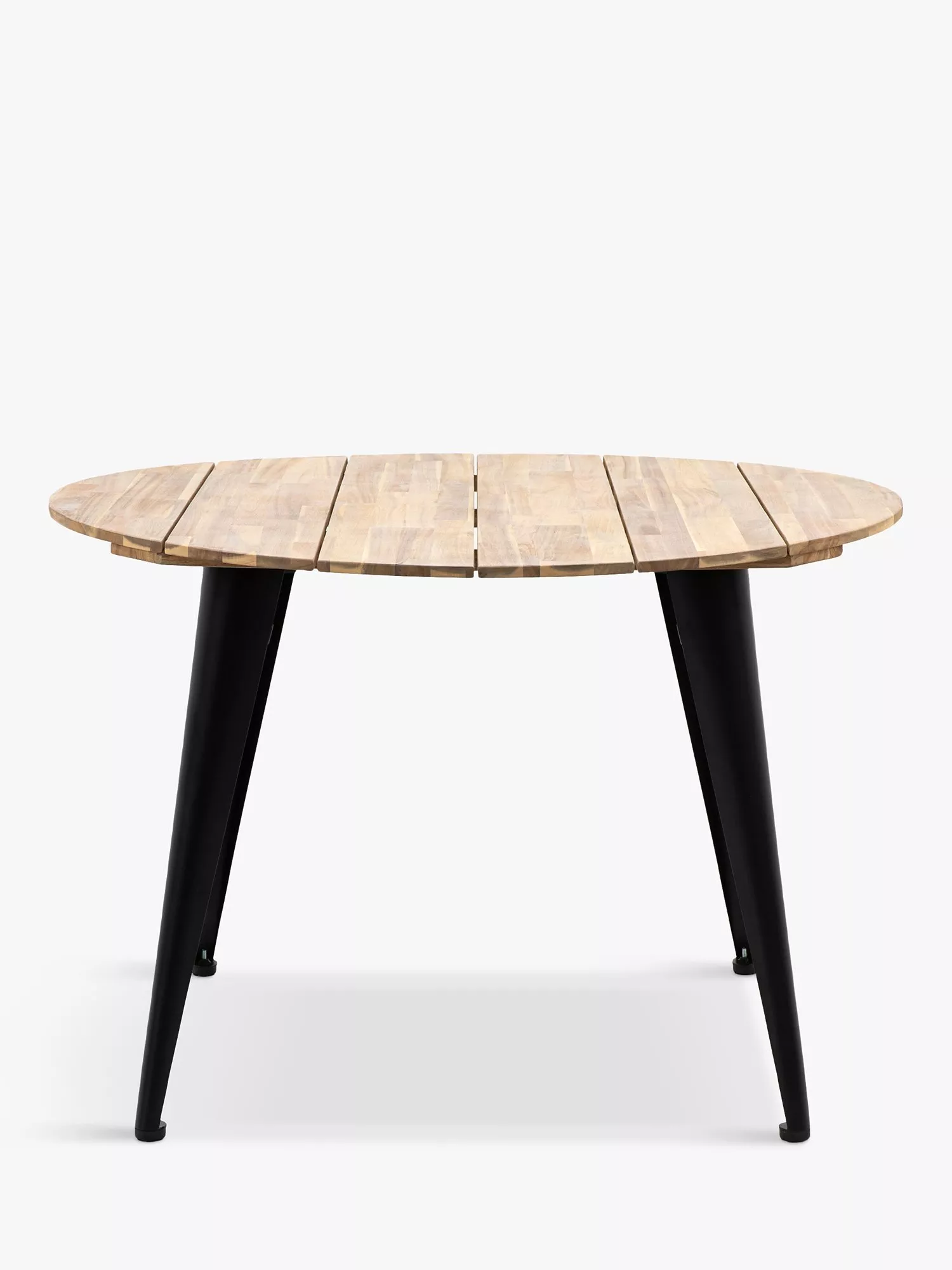 A modern industrial look for your outdoor space. This Ponza garden dining table from Gallery Direct has a round slatted acacia wood top that's naturally weather-resistant and has a natural finish. This design is completed with contrasting industrial-style powder-coated iron legs. The table seats up to four people comfortably.