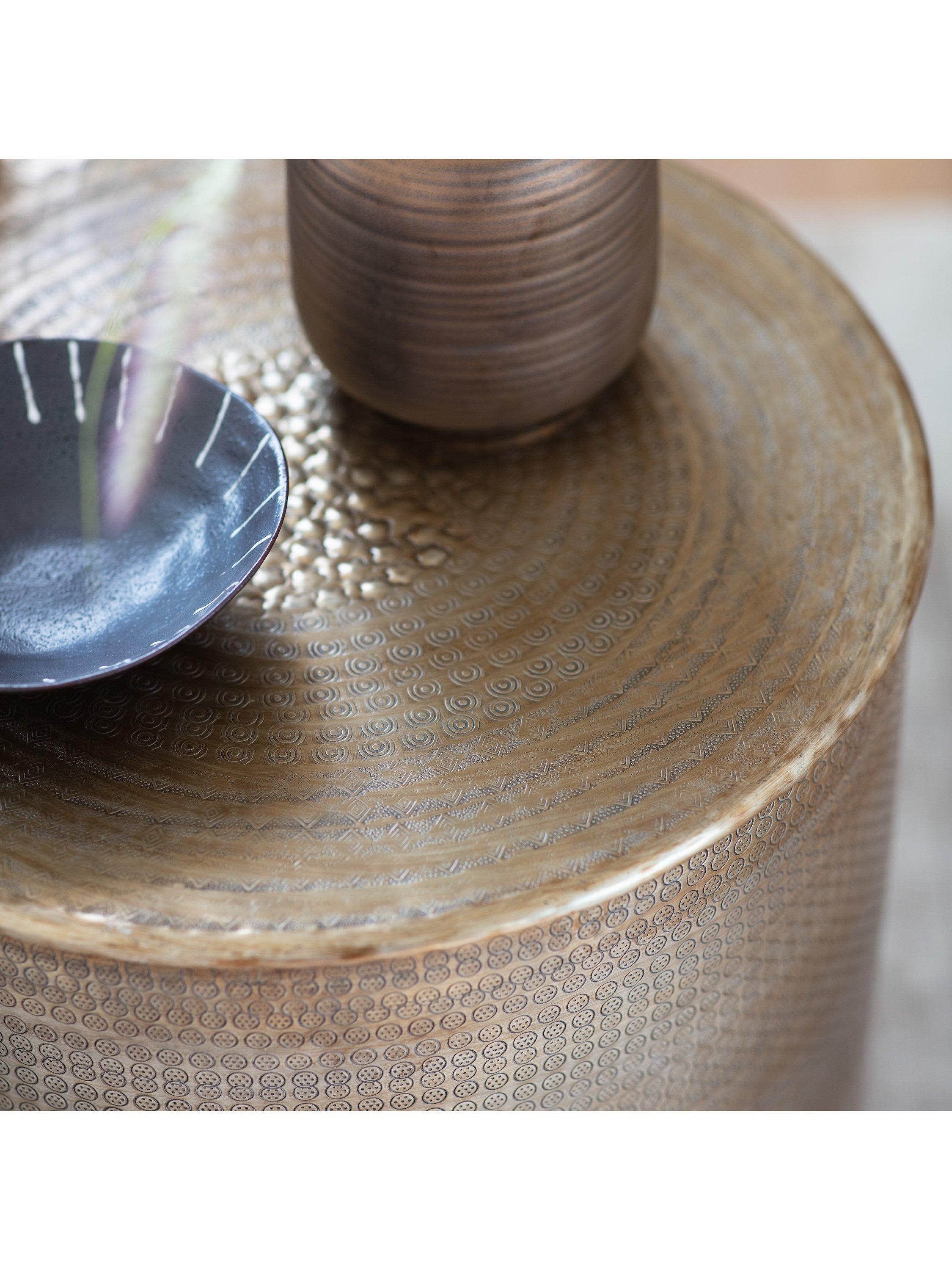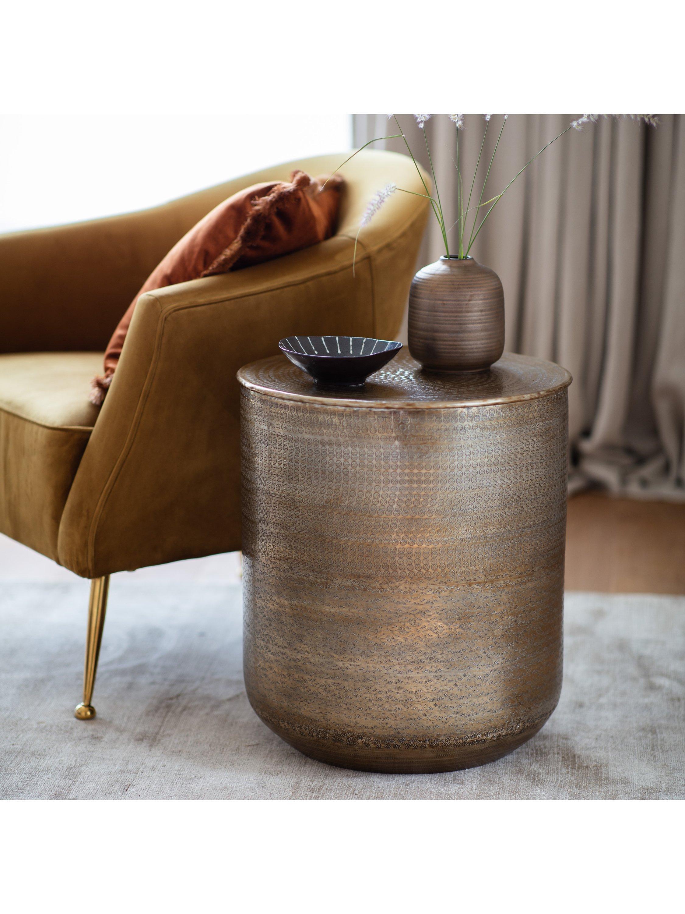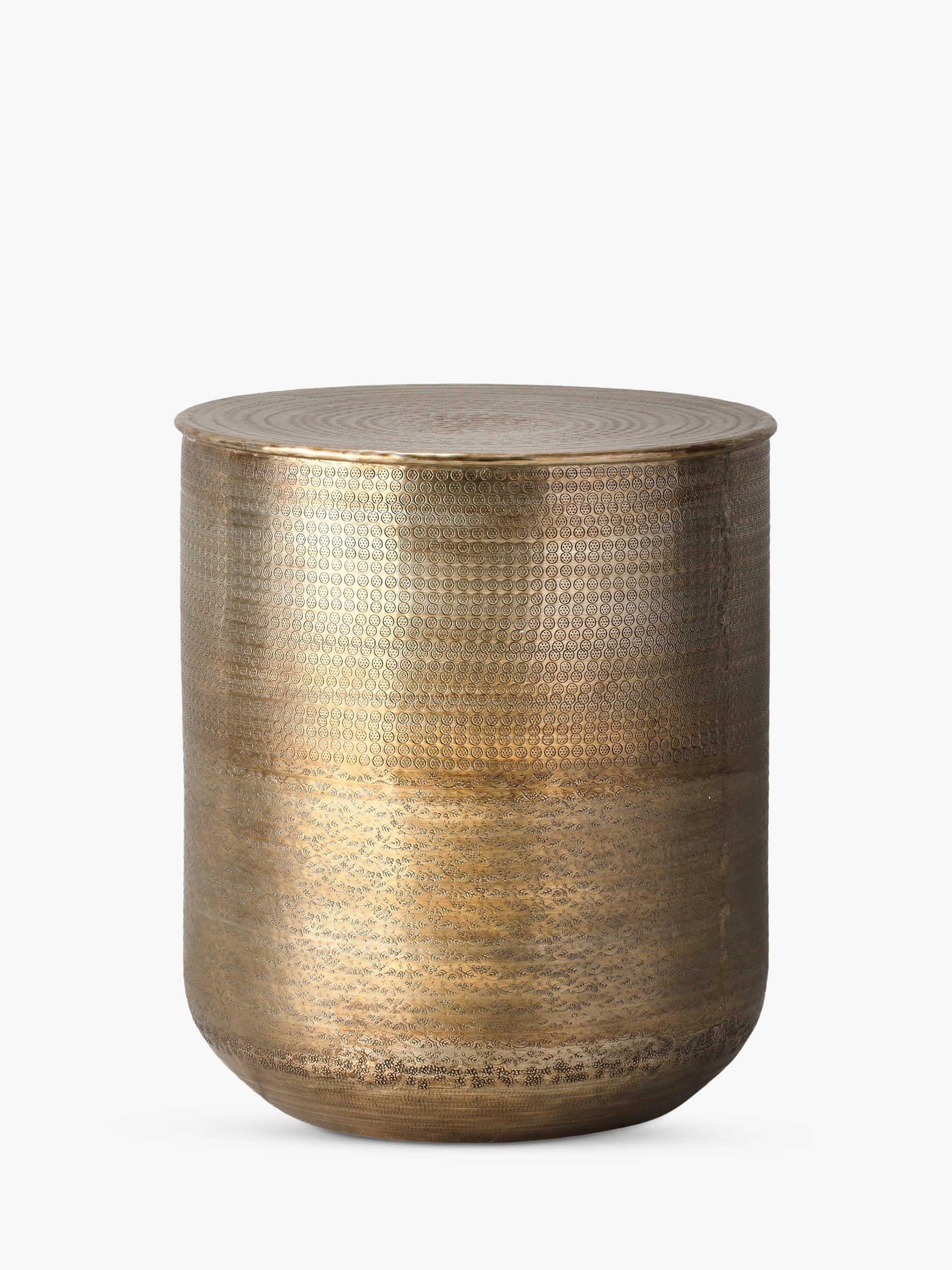 This brass effect side table features an artisanal style with a contemporary twist and is hand-pressed and embossed. Part of the beauty of this product is that with time it will age beautifully and, given the right care, achieve an attractive antique look.