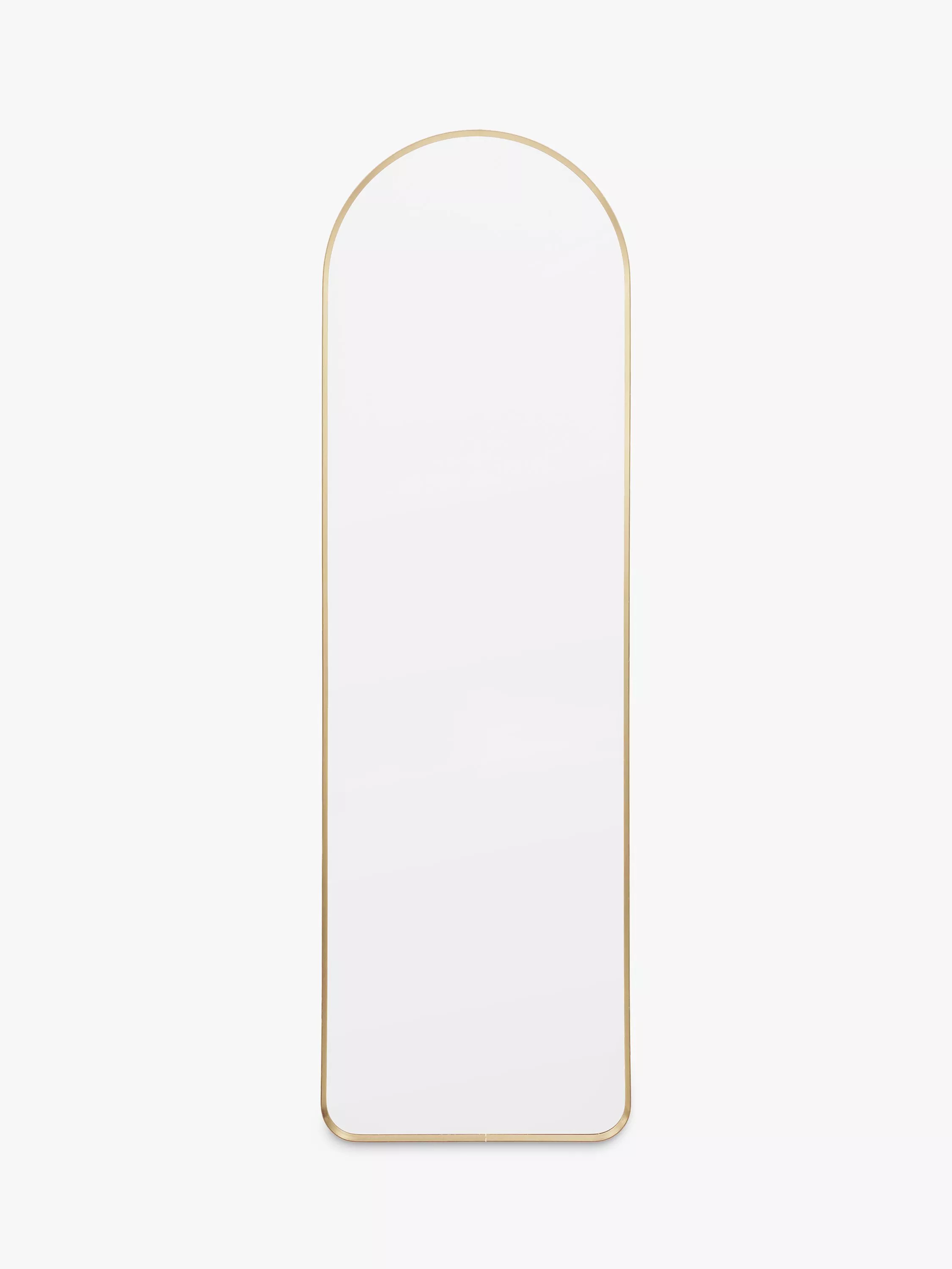 A captivating minimalistic full-length mirror designed to suit various interior styles. The thin metal frame is arched at the top, with rounded corners at the bottom.