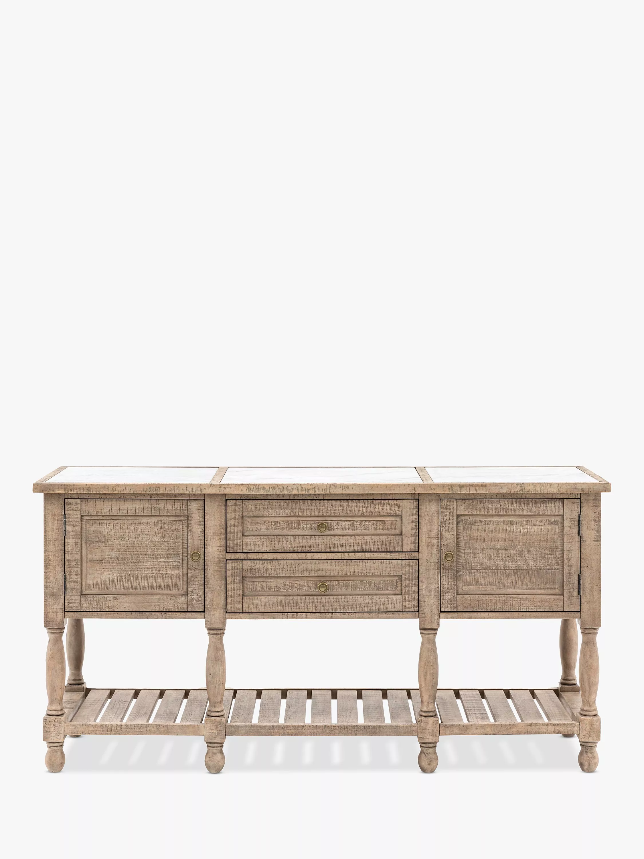 Offering an updated classic look, this stunning sideboard features inset marble on the top along with two cupboards, two drawers and a large shelf to give practical storage combined with a stylish sophisticated yet rustic look.