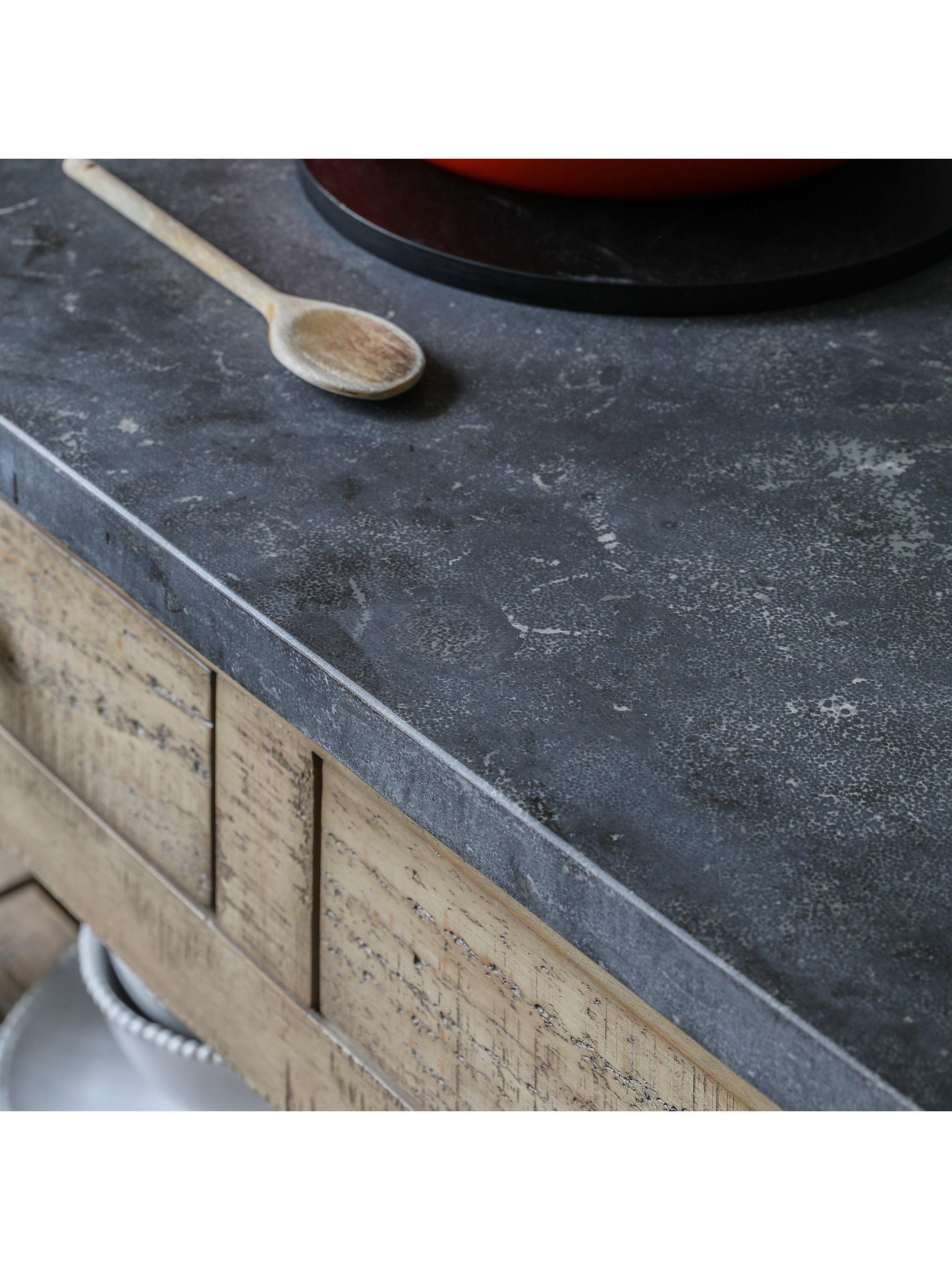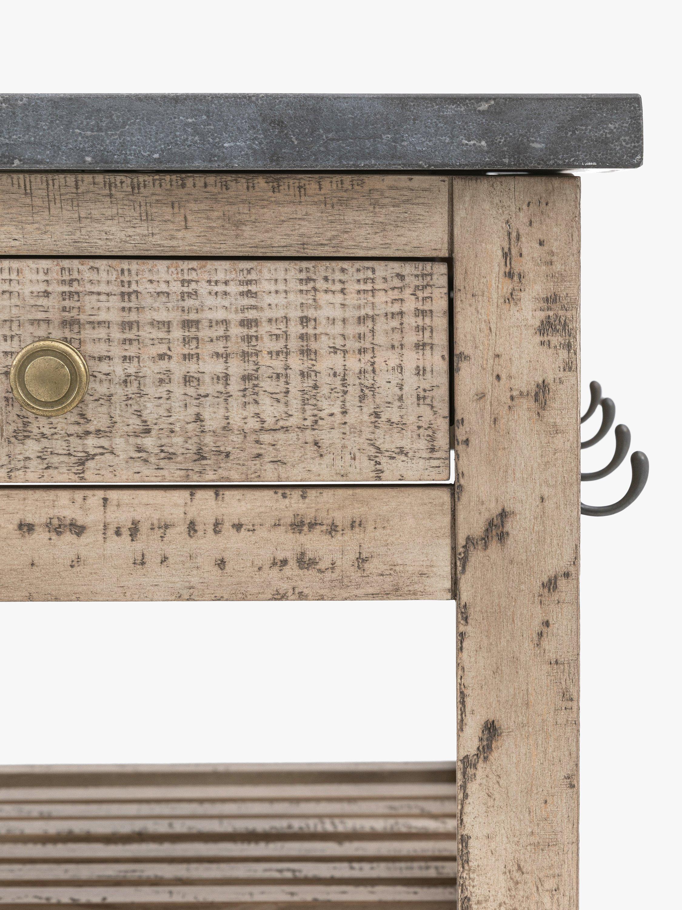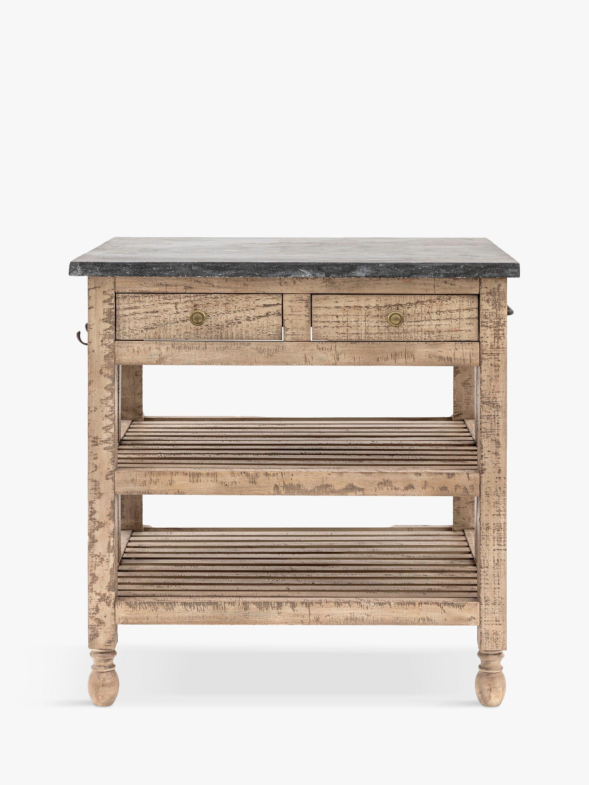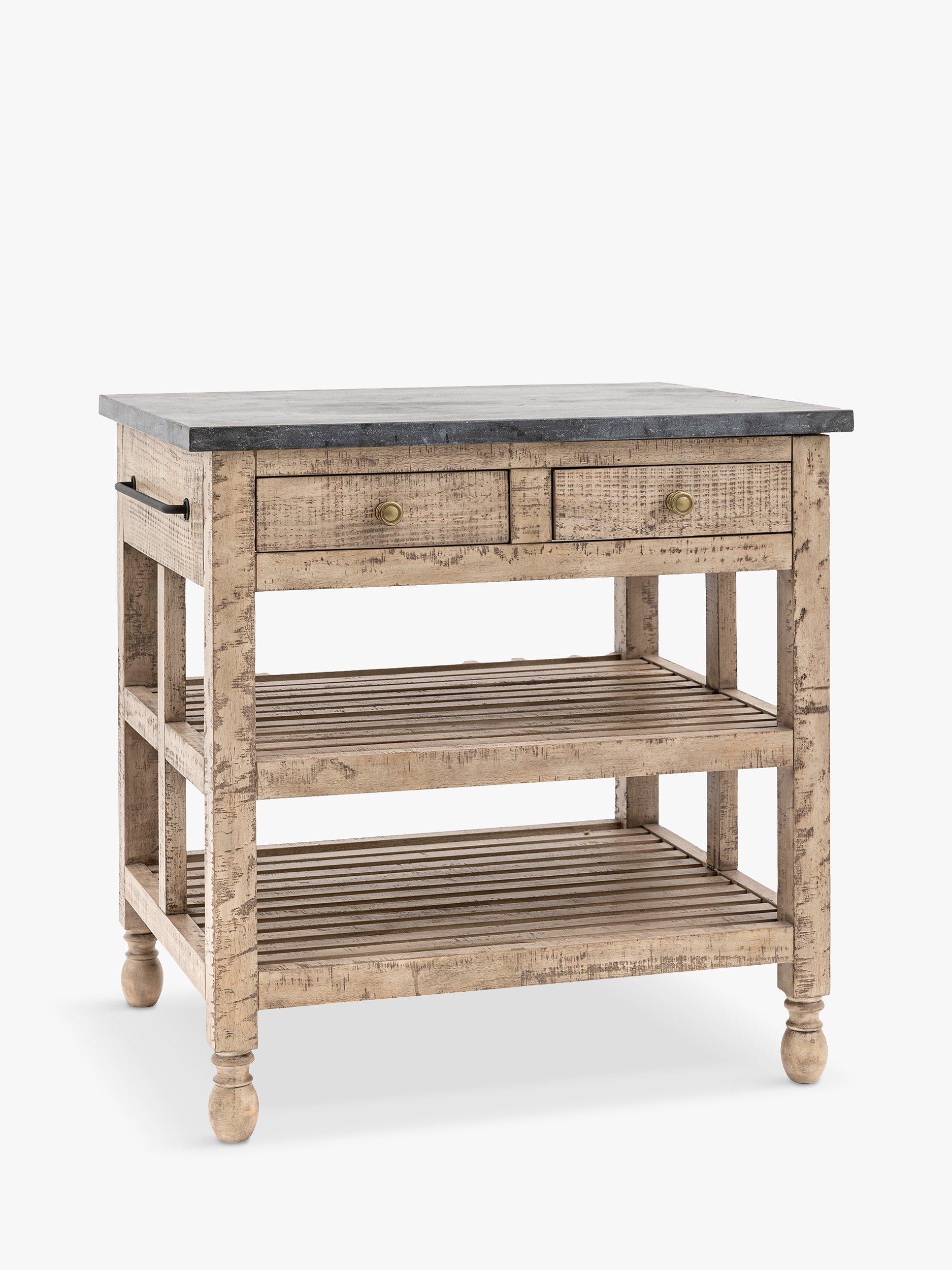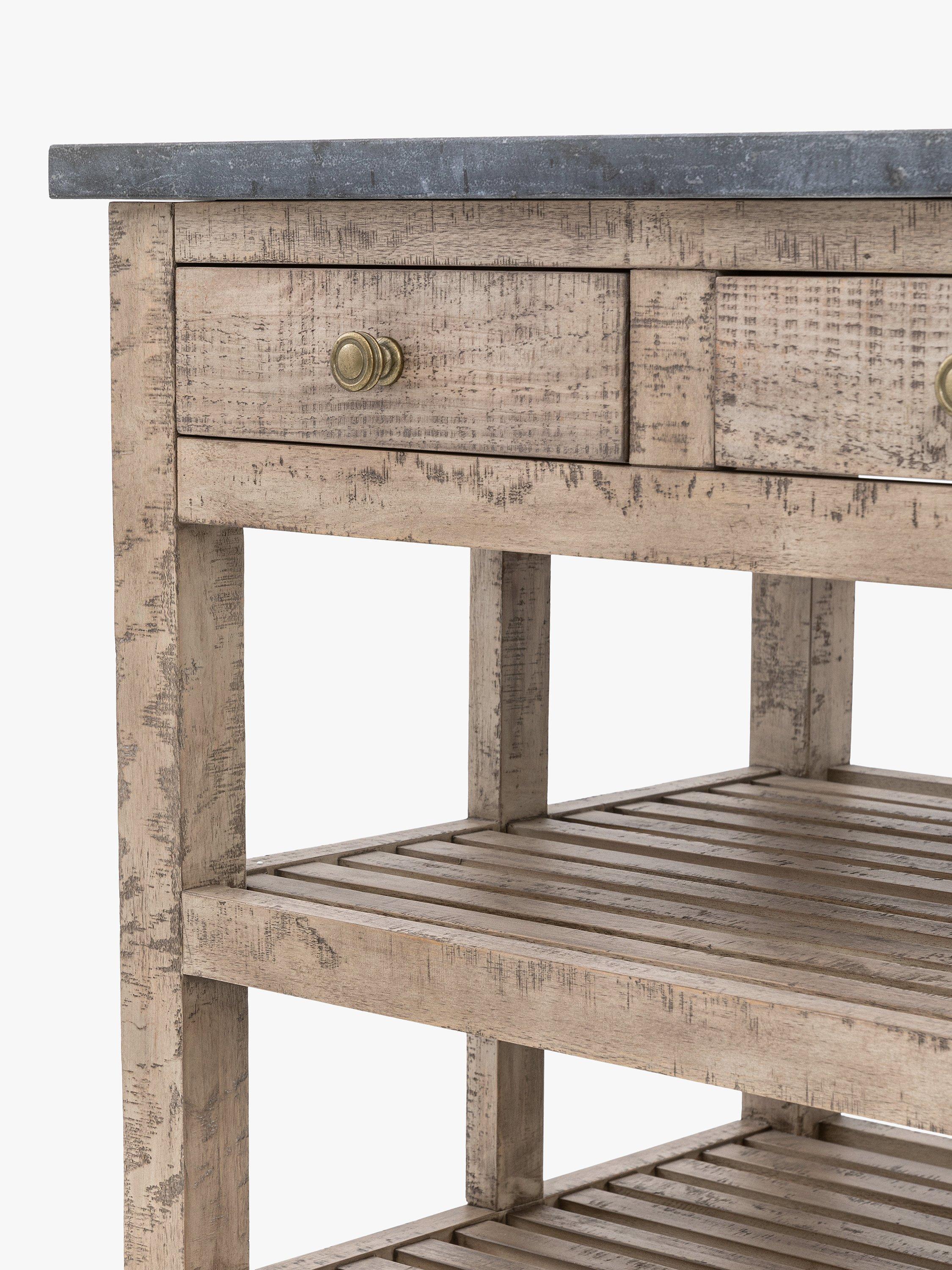 Offering an updated classic look, this lovely kitchen island combines style and practicality, with its marble top and two drawers and two shelves for storage. It's crafted from North American pine solids and veneers where practical, with the clever use of a mill saw giving characteristic features of cross sawn timber to create a tactile, dramatic finish.