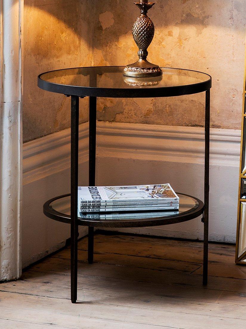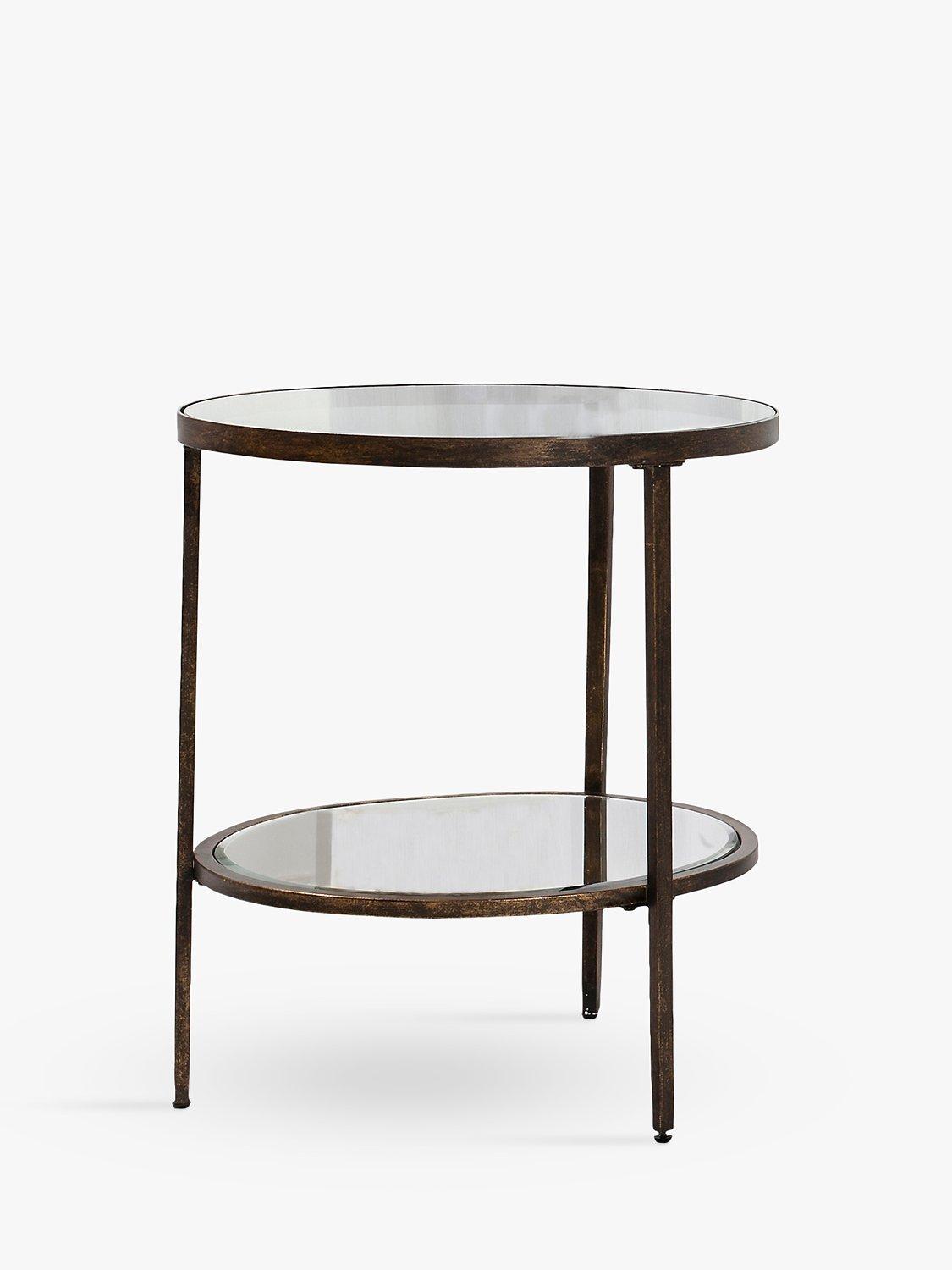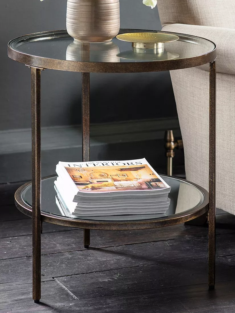 This round side table has an aged bronze finish with an inlaid, tempered glass top and mirrored shelf. Used as lamp table, the reflective surfaces will help bounce the light back into the room for a beautifully diffused glow, or place near a window to help catch and reflect natural daylight.