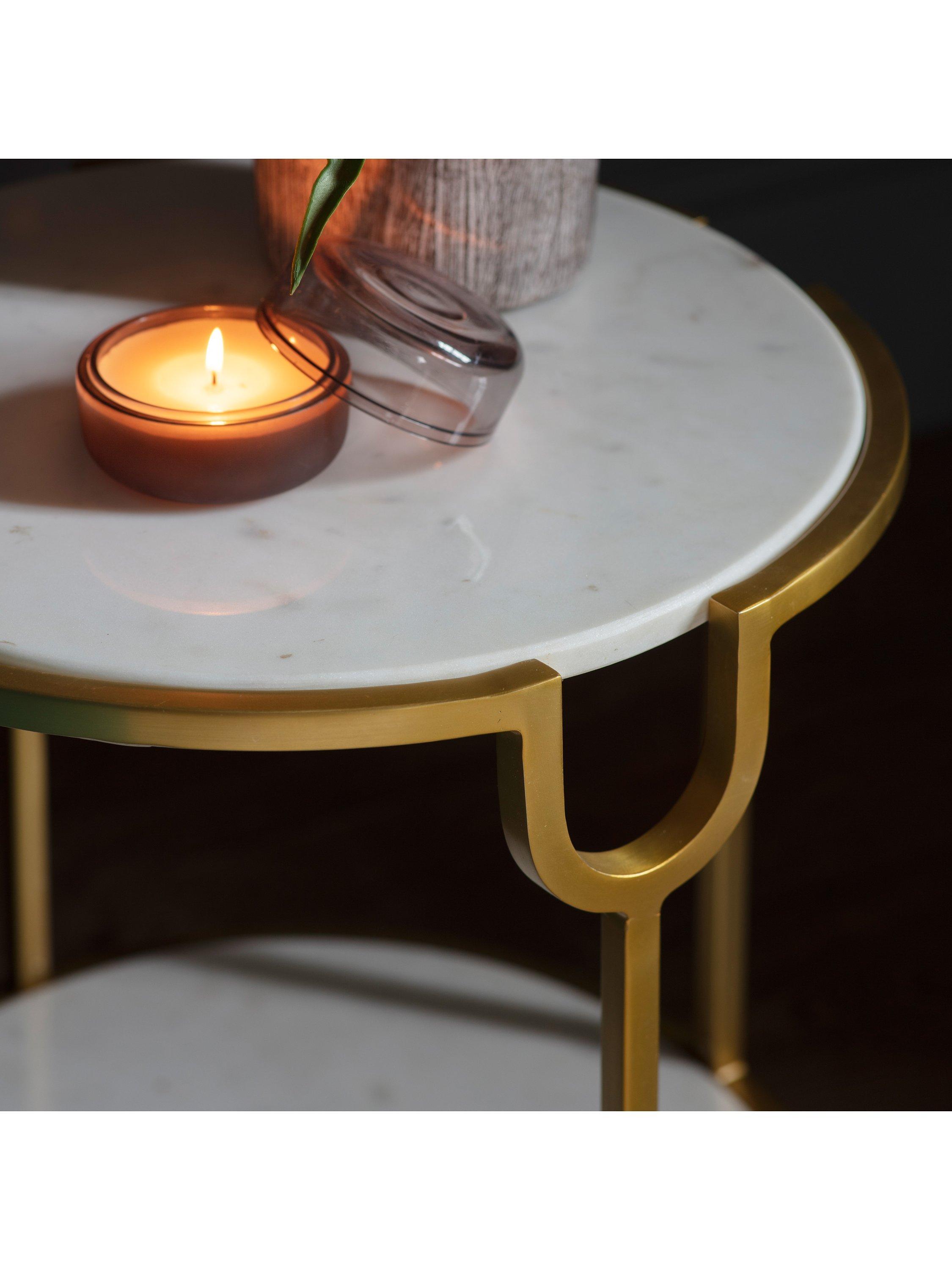 Designed to make your space feel a little more luxe. This Art-Deco inspired round side table features two shelves made from natural marble, supported by a decorative metal frame in a contrast brushed brass finish. Sturdy, sophisticated and sure to catch the eye.