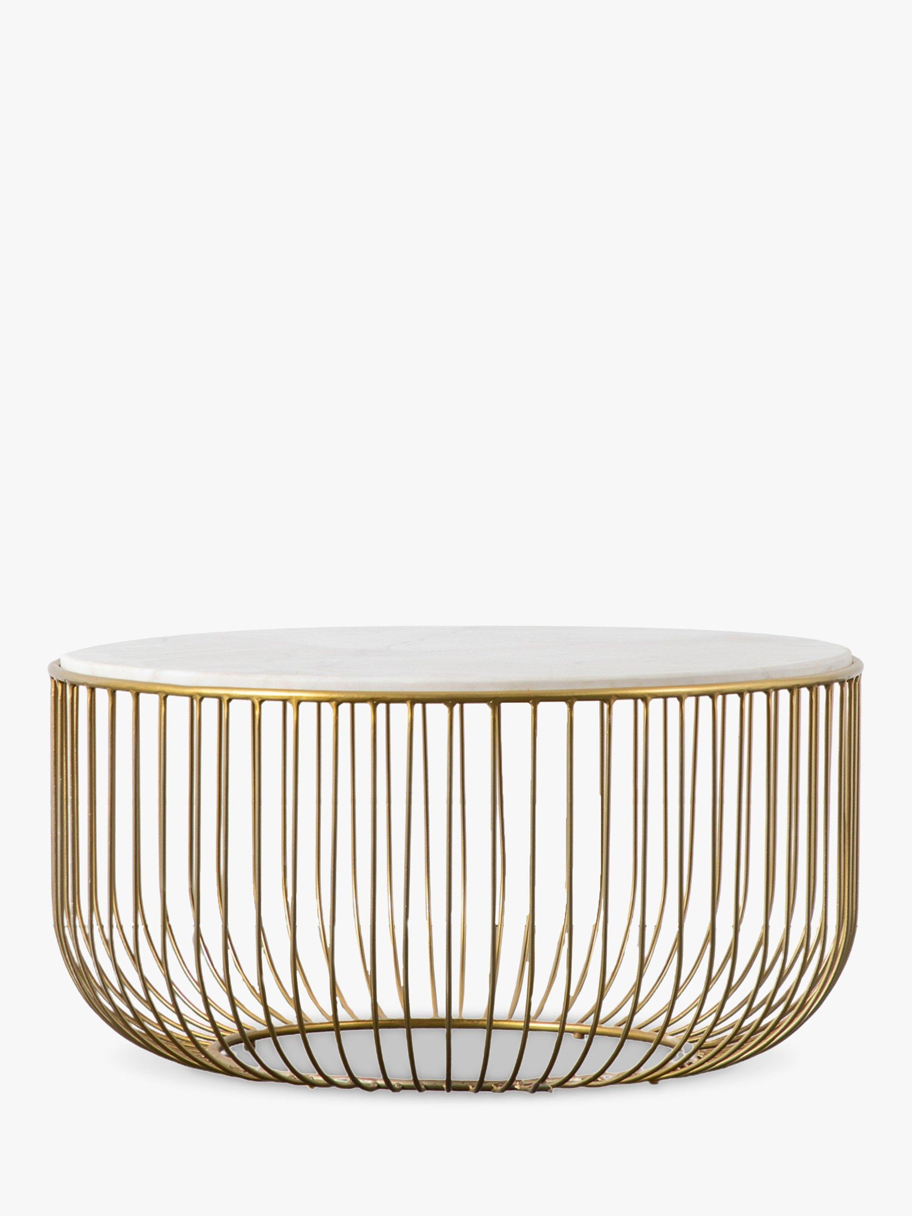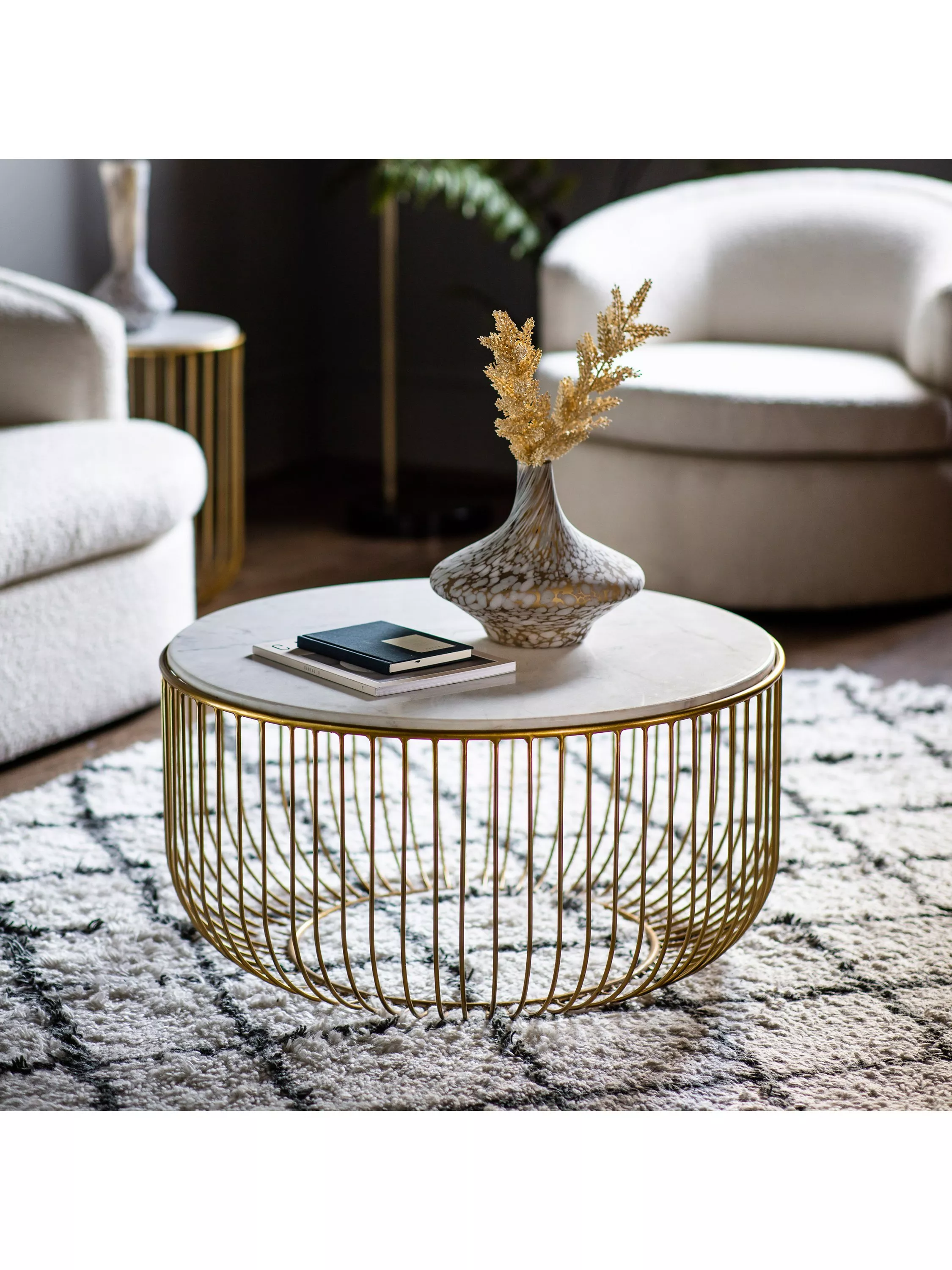 This coffee table combines a fine wire metal base in a brushed finish with a white marble top, resulting in a luxe look inspired by Art-Deco style. A distinctive design for the centre of your living room.