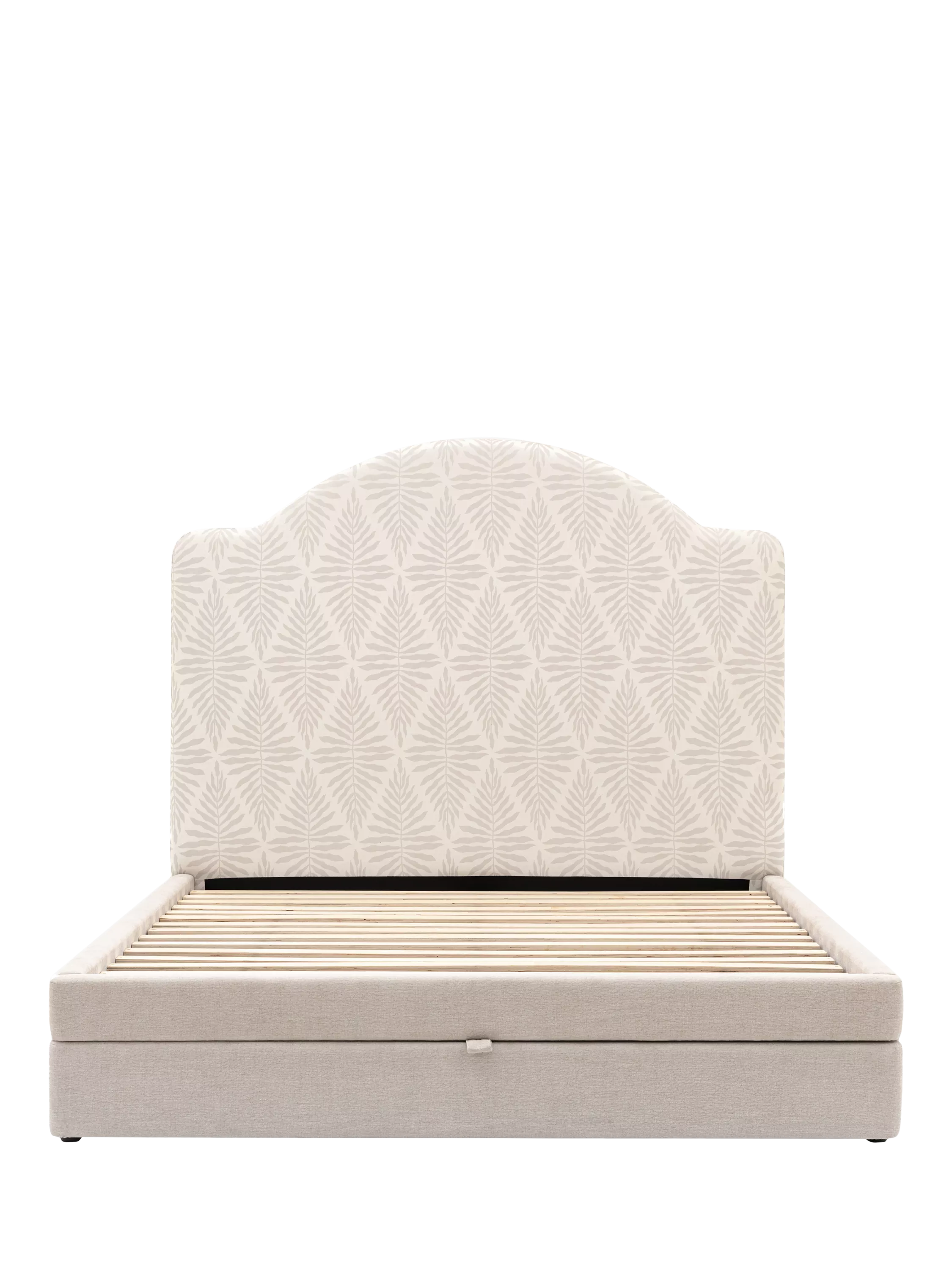 Designed with an elegant arched headboard that's upholstered in an intricate leaf pattern, this bed frame has a serene style that will complement any décor. Its practical design also includes a built-in drawer at the foot of the bed, which pulls out to reveal a handy storage space. Solid slats provide a firmer base for your mattress.