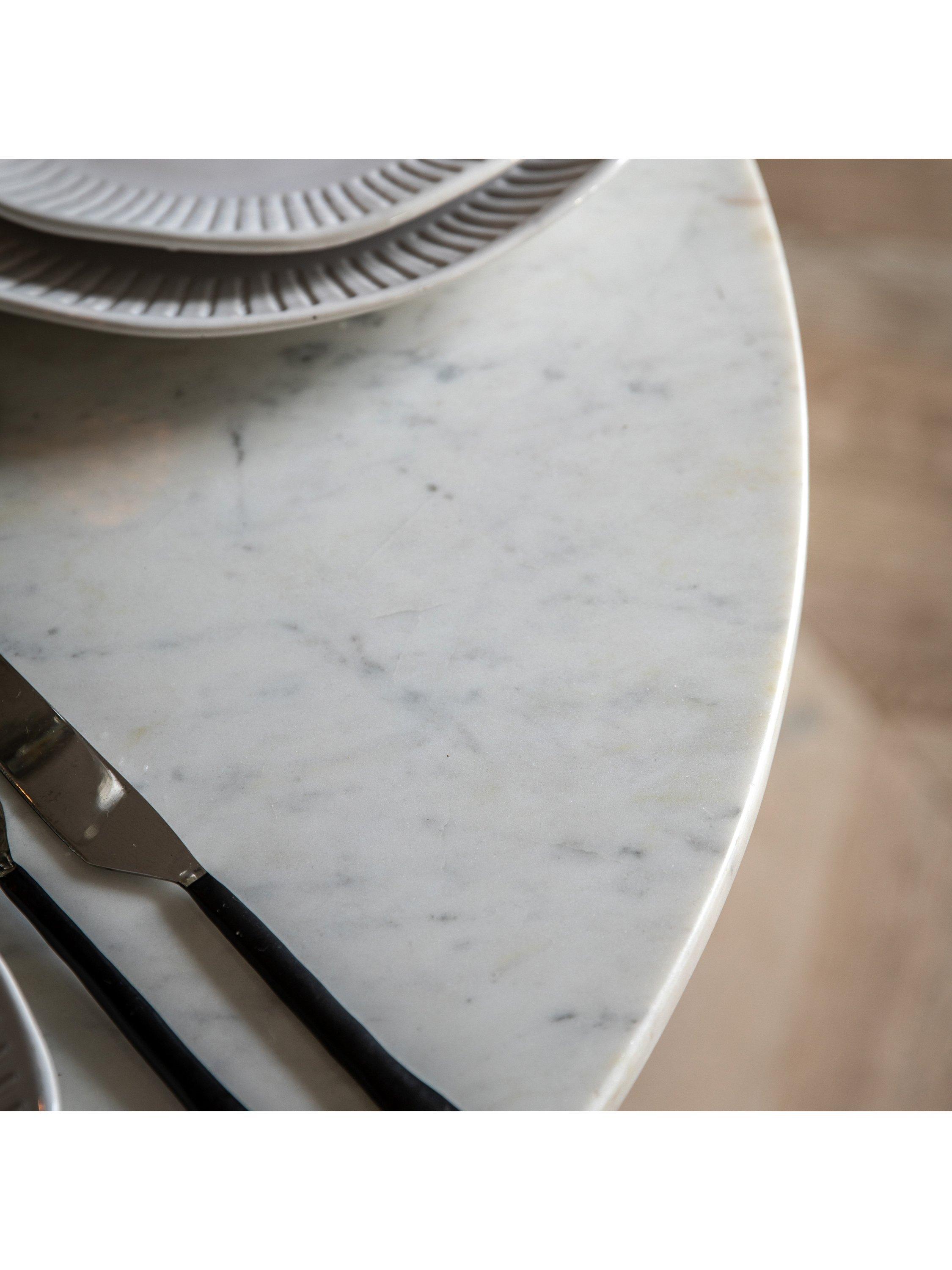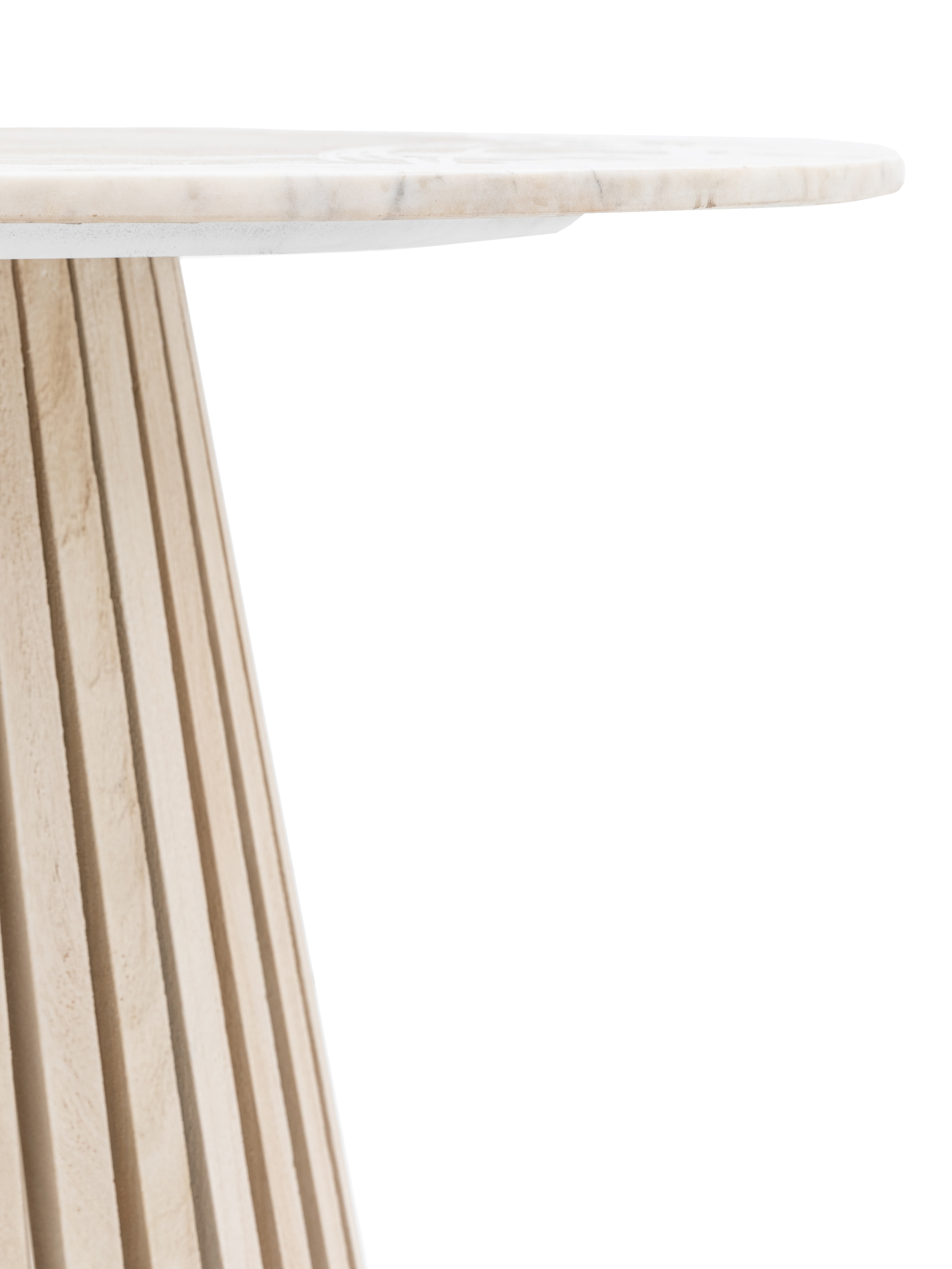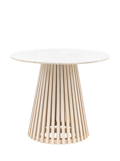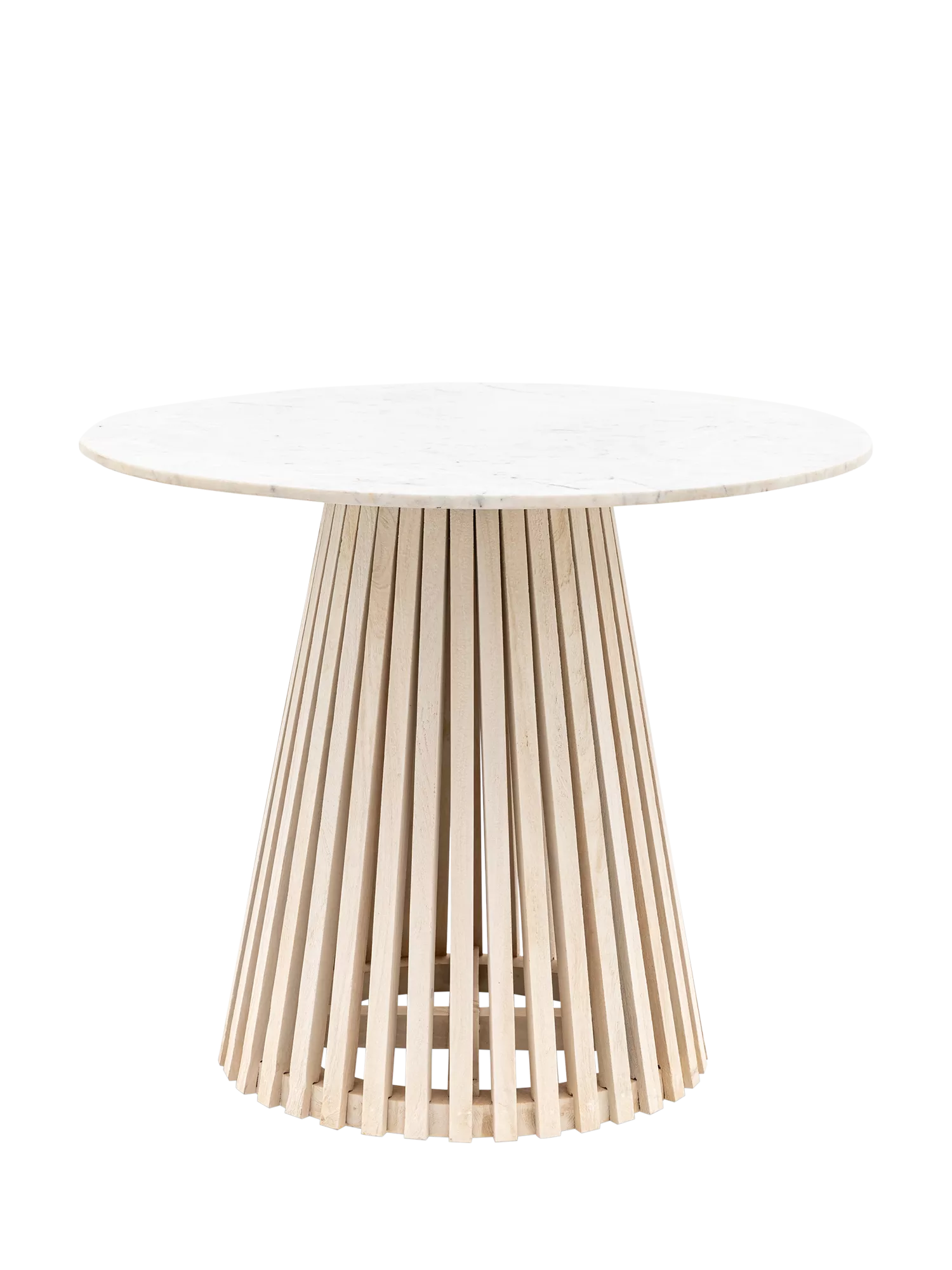 This lovely round dining table offers stylish contemporary design. The base is crafted from gently sloping slats of mango solid timbers with a white-washed, sand-blasted finish to create a striking design feature. This stunning base is paired with a beautiful white Indian marble top, creating a classy, elegant piece of furniture.