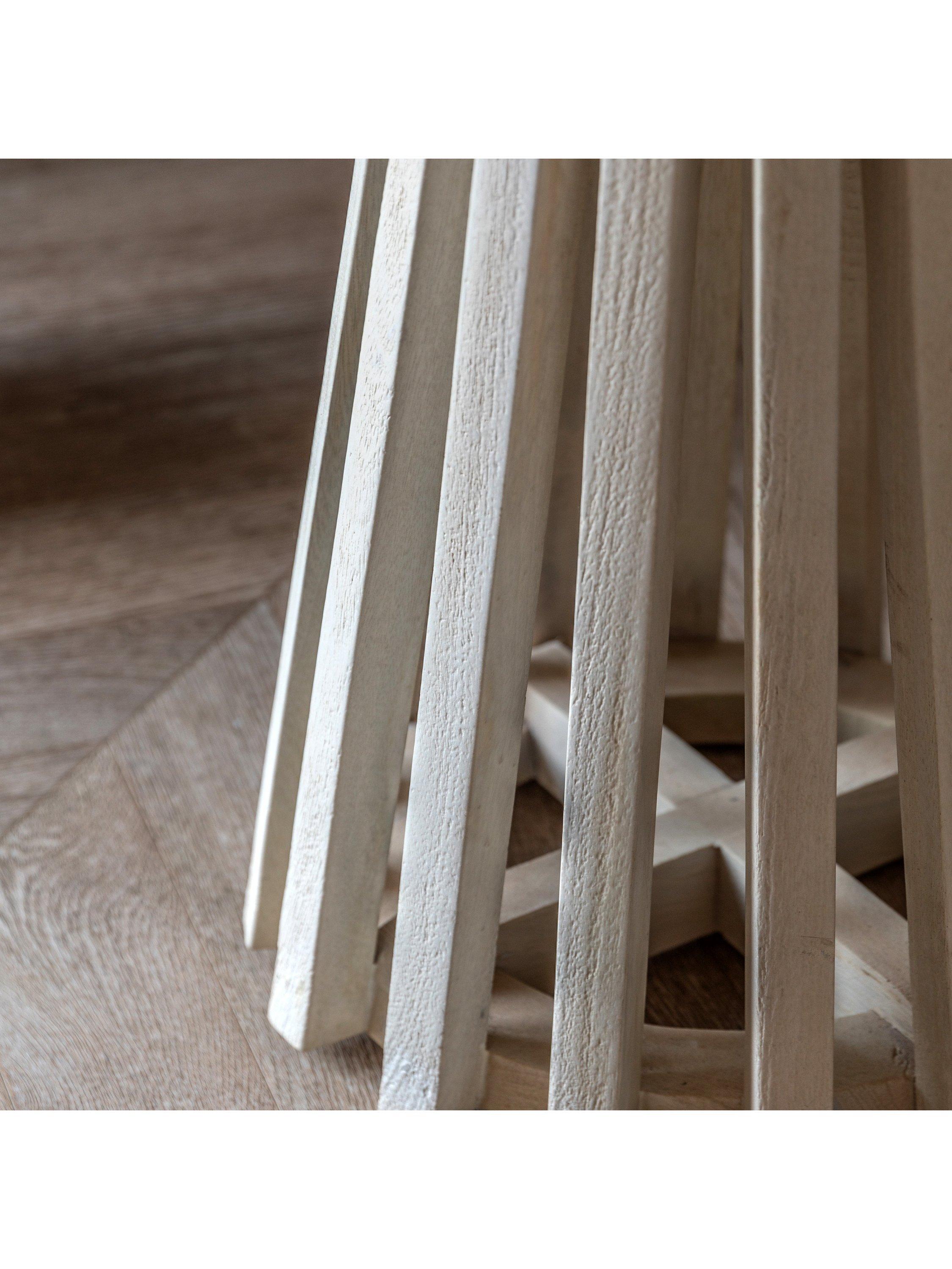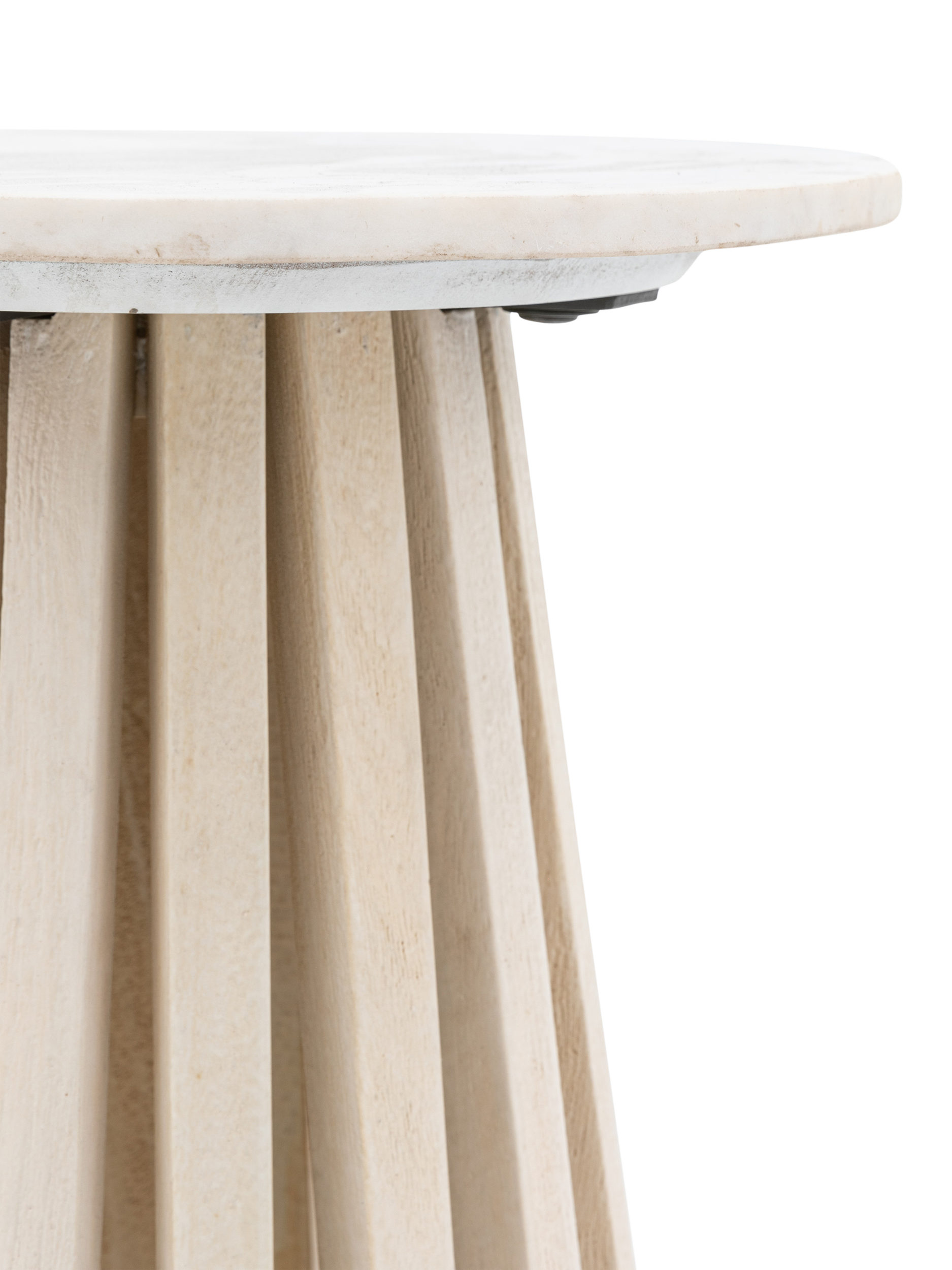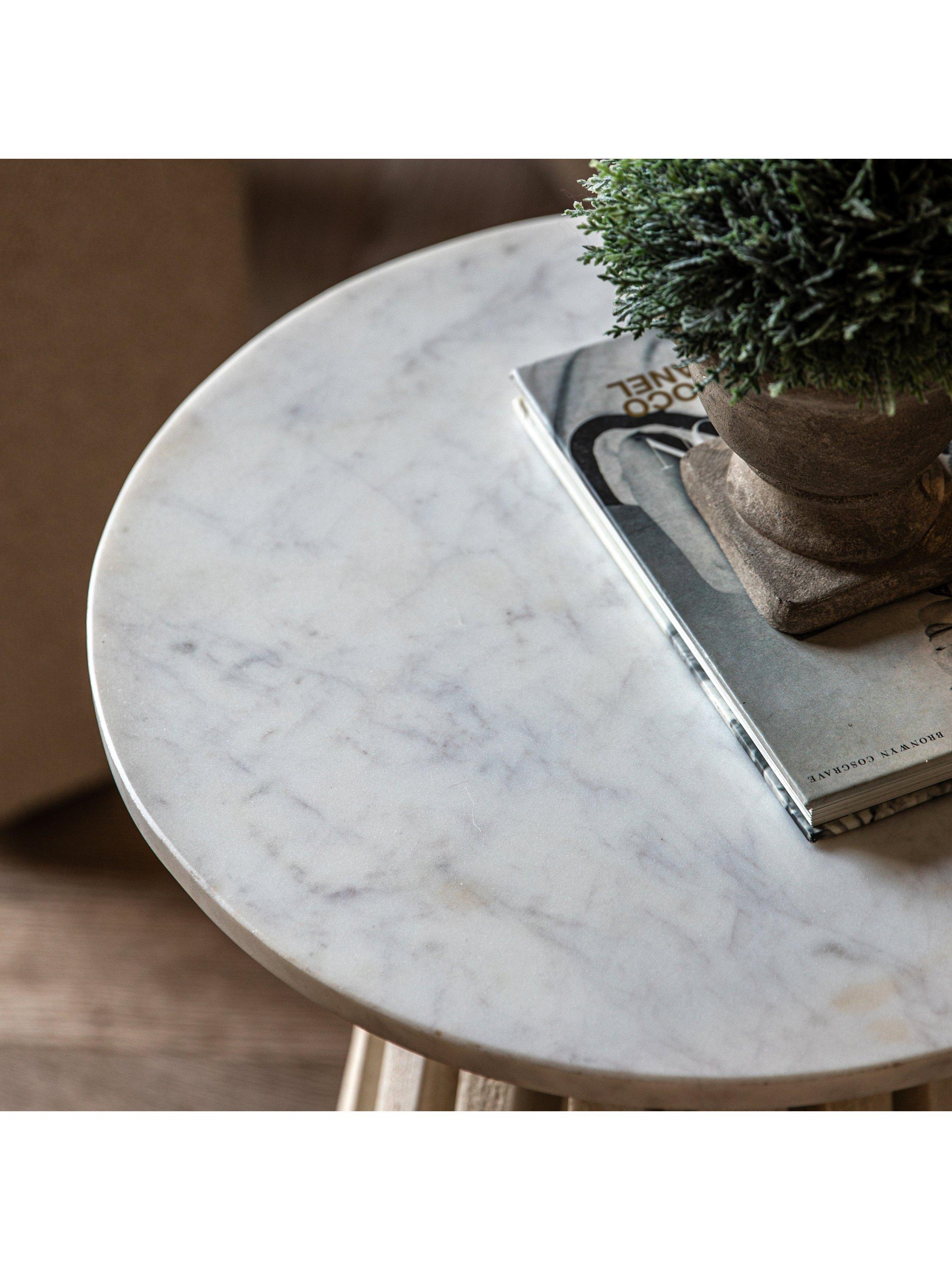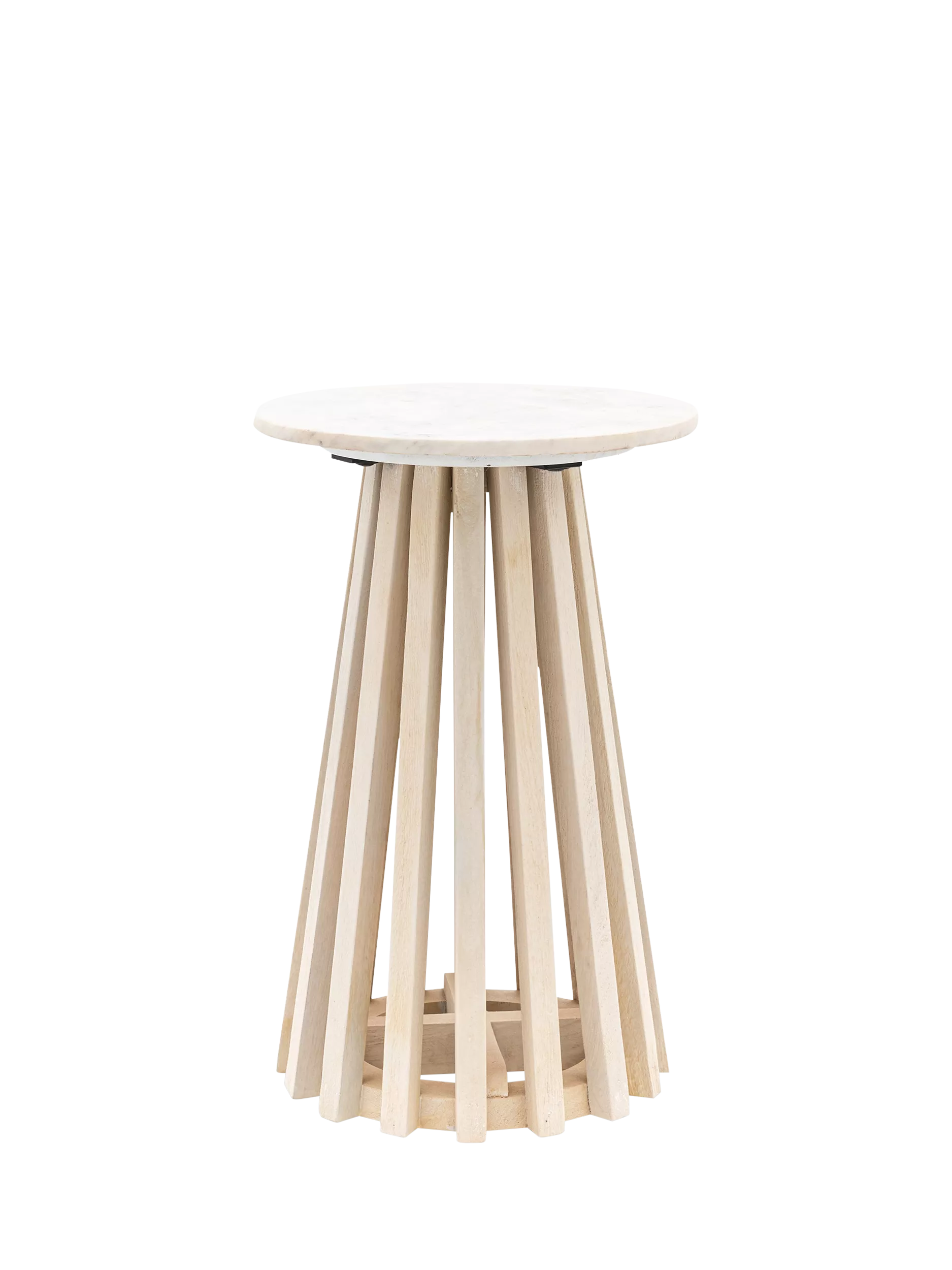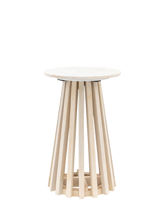 This beautiful side table offers stylish contemporary design. The base is crafted from gently sloping slats of mango solid timbers with a white-washed, sand-blasted finish to create a striking design feature. This stunning base is paired with a beautiful white Indian marble top, creating a classy and elegant piece of furniture.