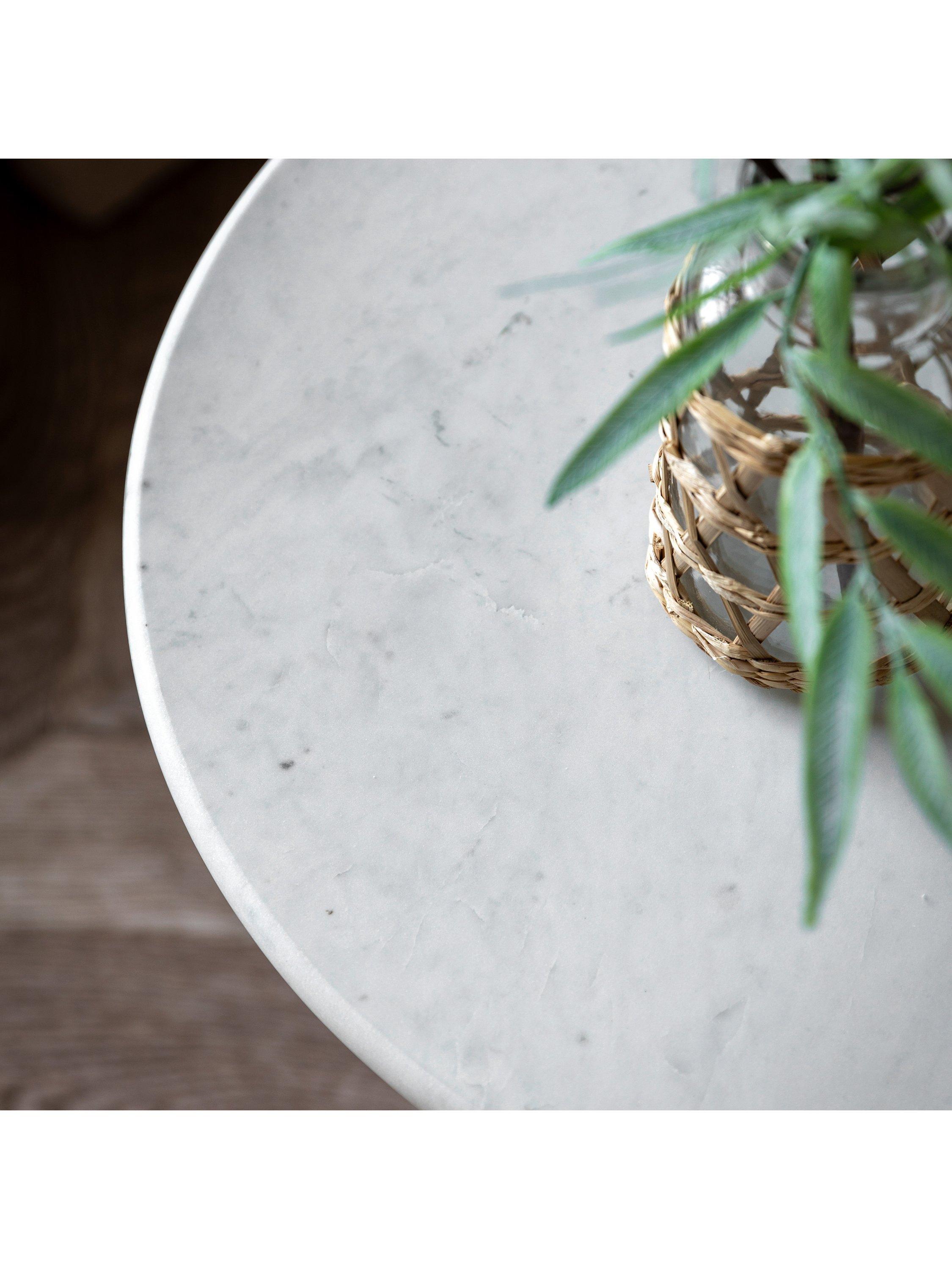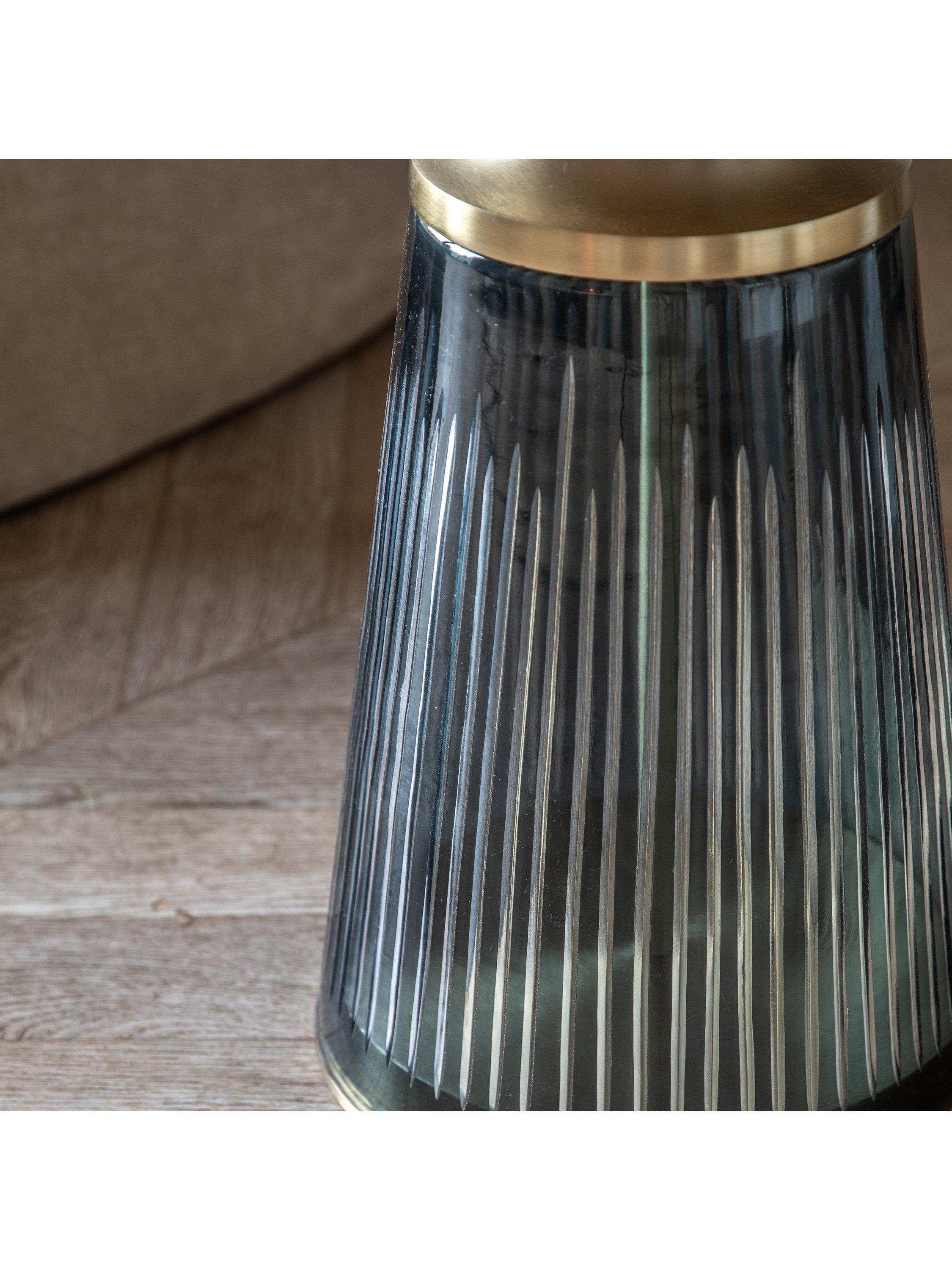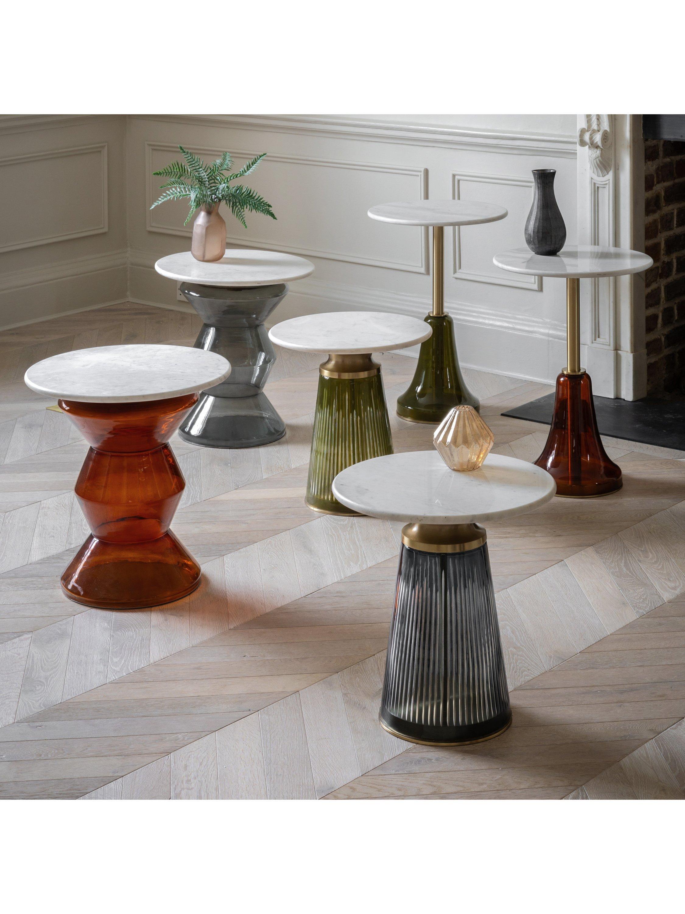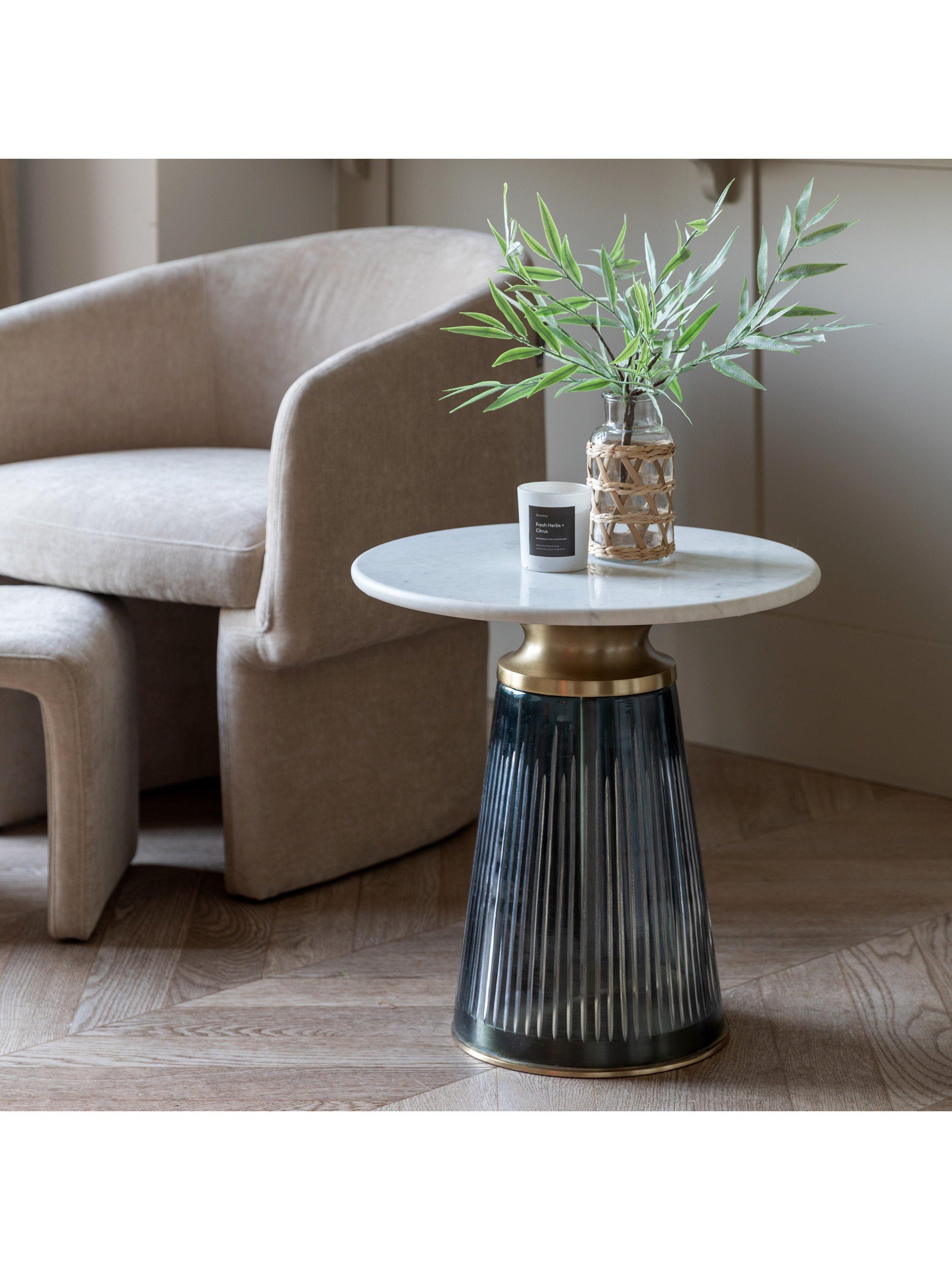 Add some luxe to your room with this unique side table. The incredibly stunning tonal glass base features a unique design of liner striations which is not to be outdone by the metal collars and the ultimate in luxury, a white marble table top.