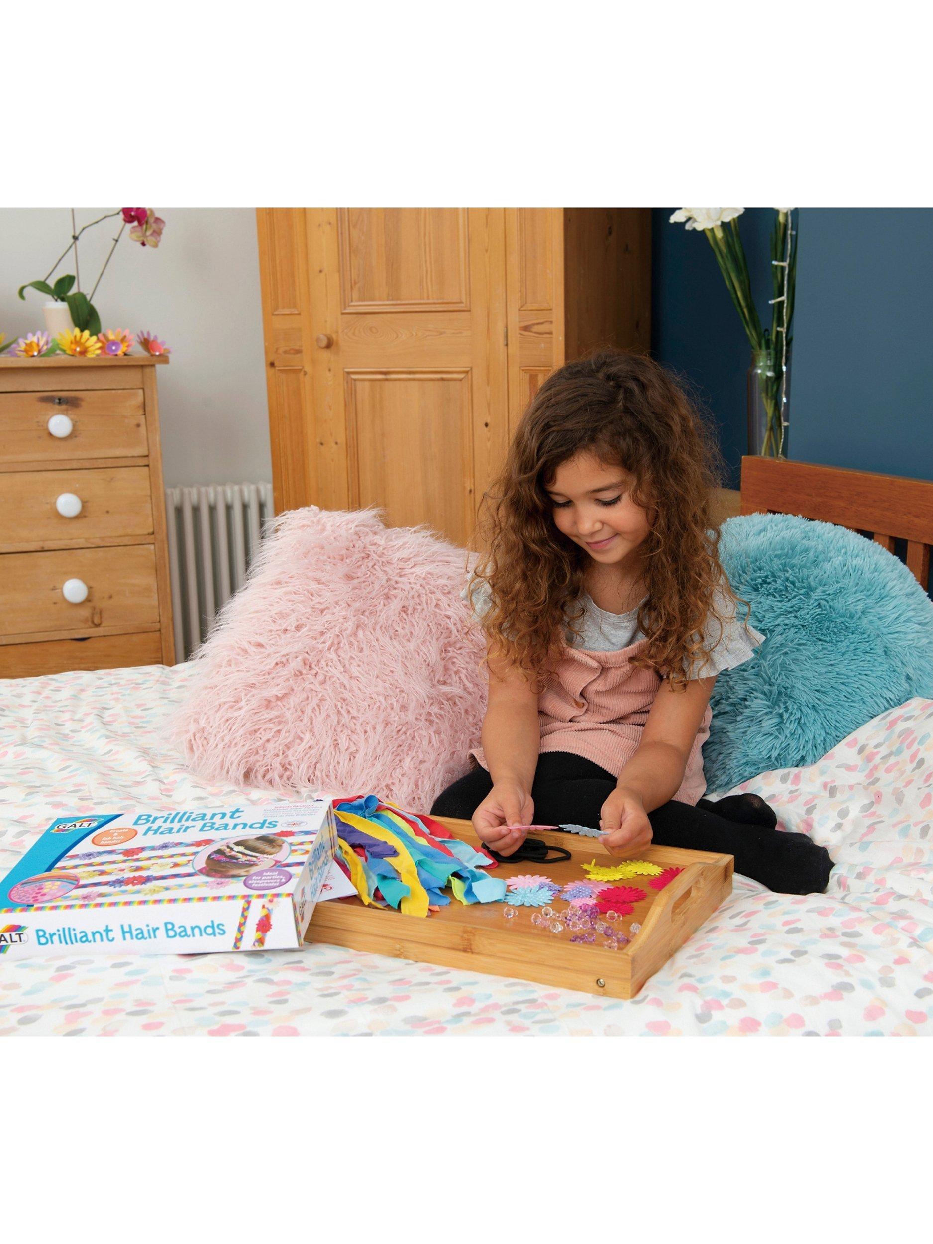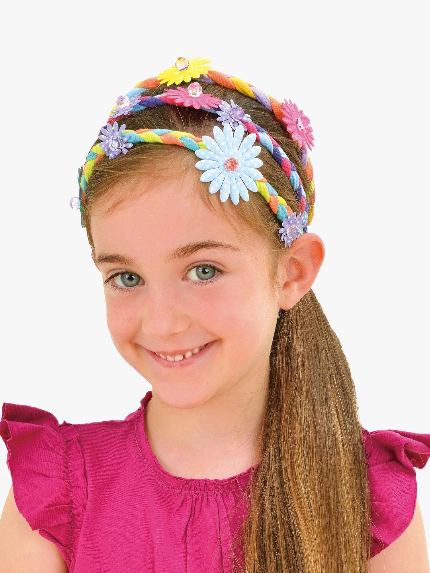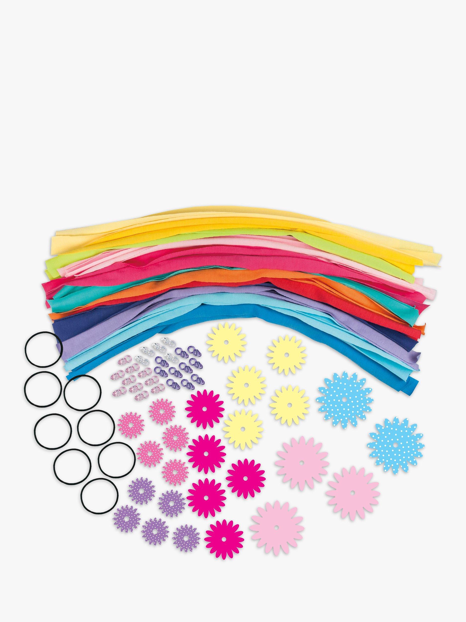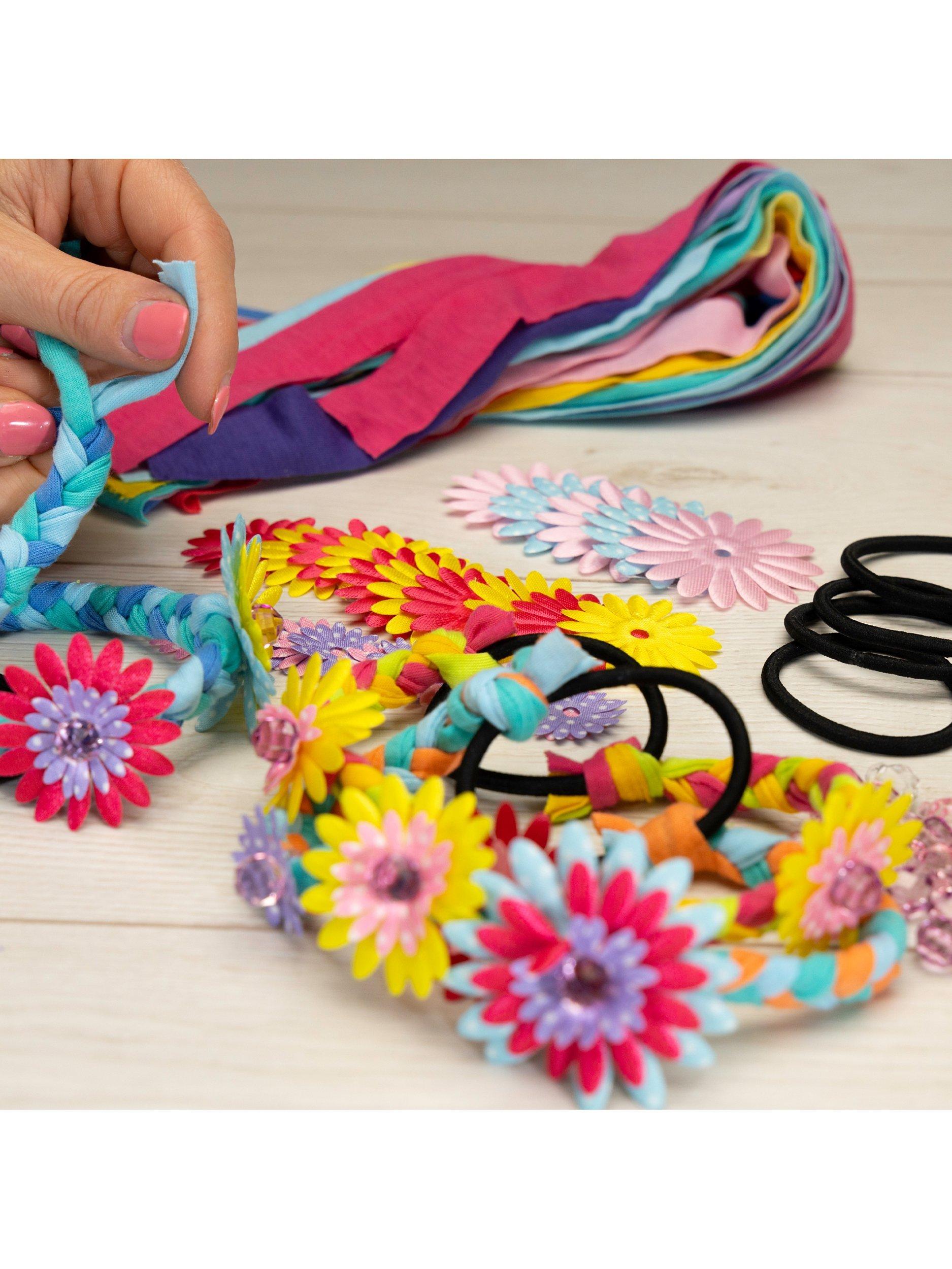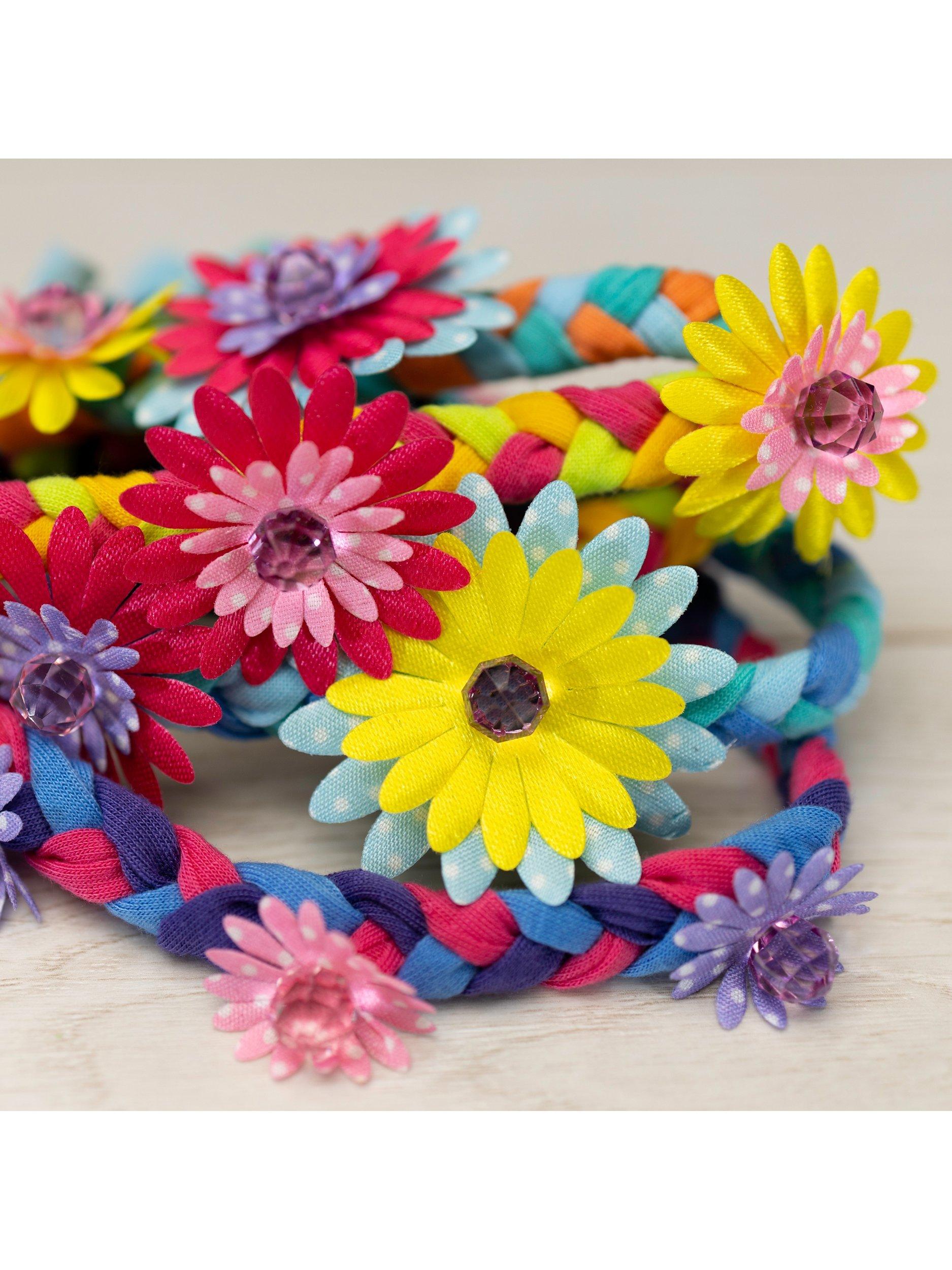 Make 8 cool hair braids by plaiting together colourful fabric strips with flowers and beads. Simply thread on the flowers and beads as you plait then finish by tying the braids to the elastic hair bands - no stitching required.